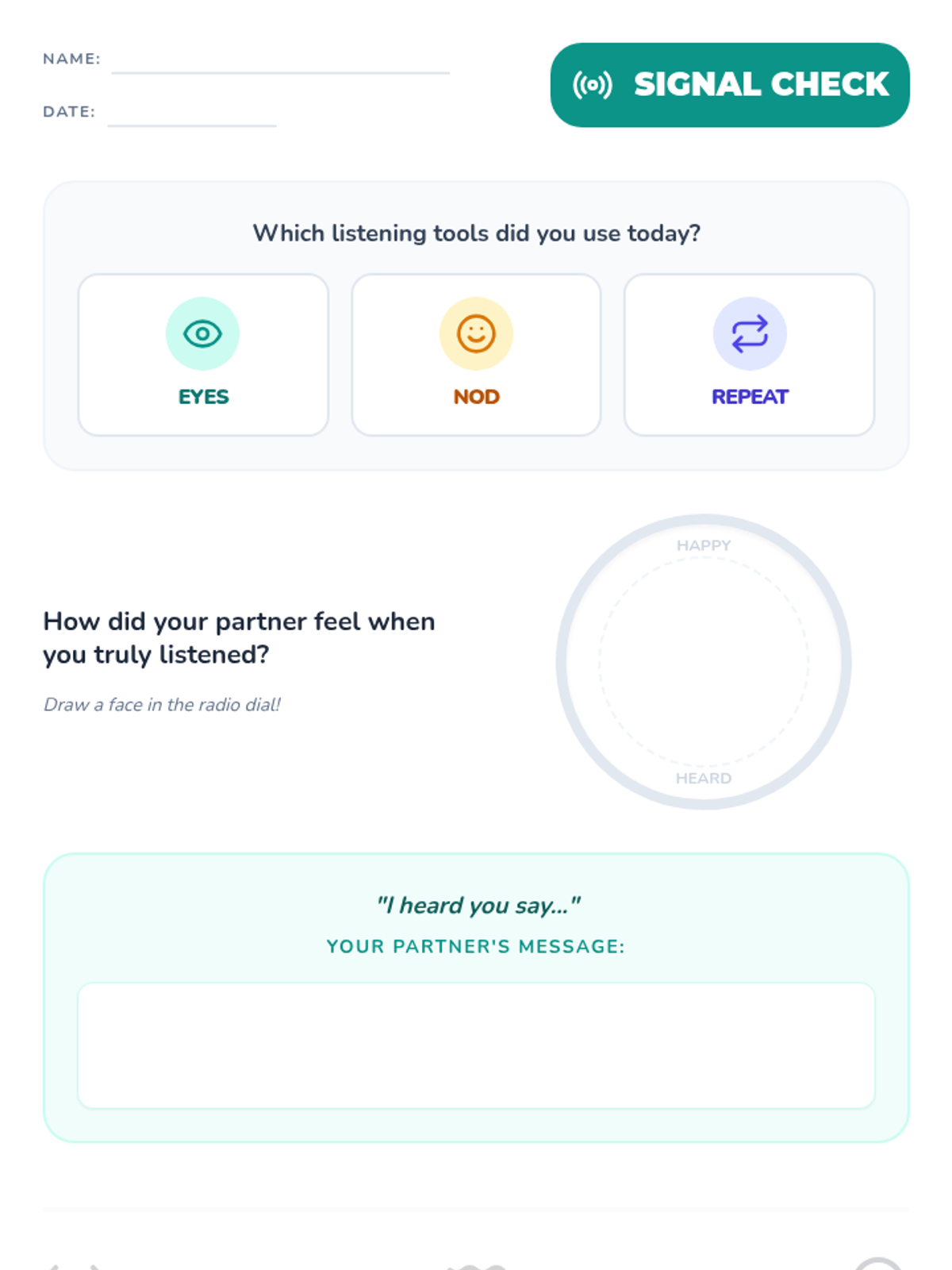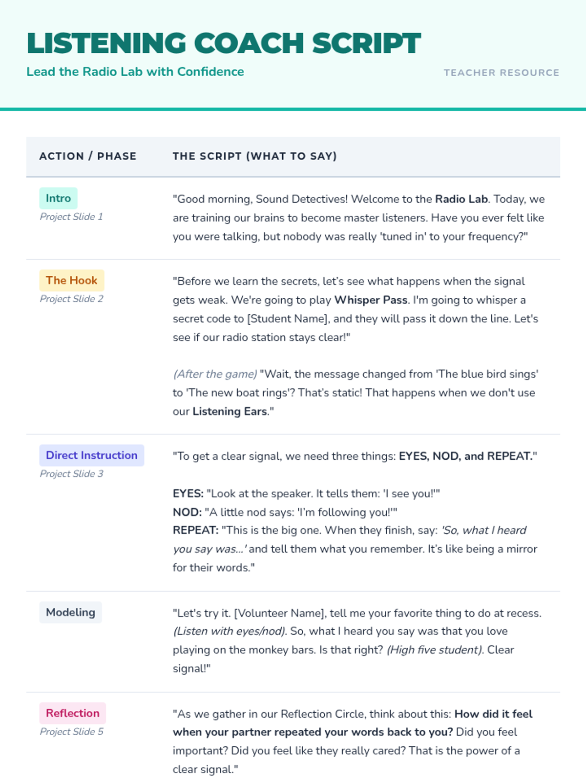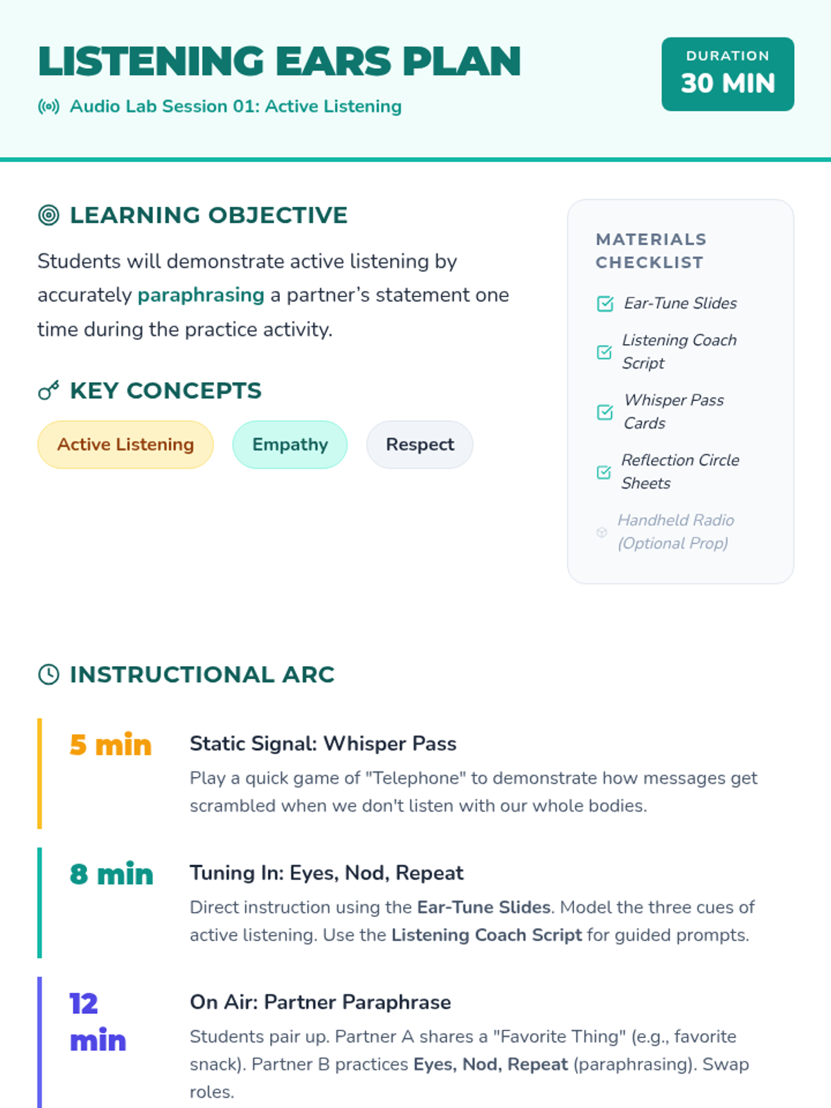 A 30-minute social-emotional learning lesson for 1st graders focused on active listening through the 'Eyes, Nod, Repeat' technique. Students practice empathy and respect by paraphrasing partner statements in a 'Radio Lab' themed environment.