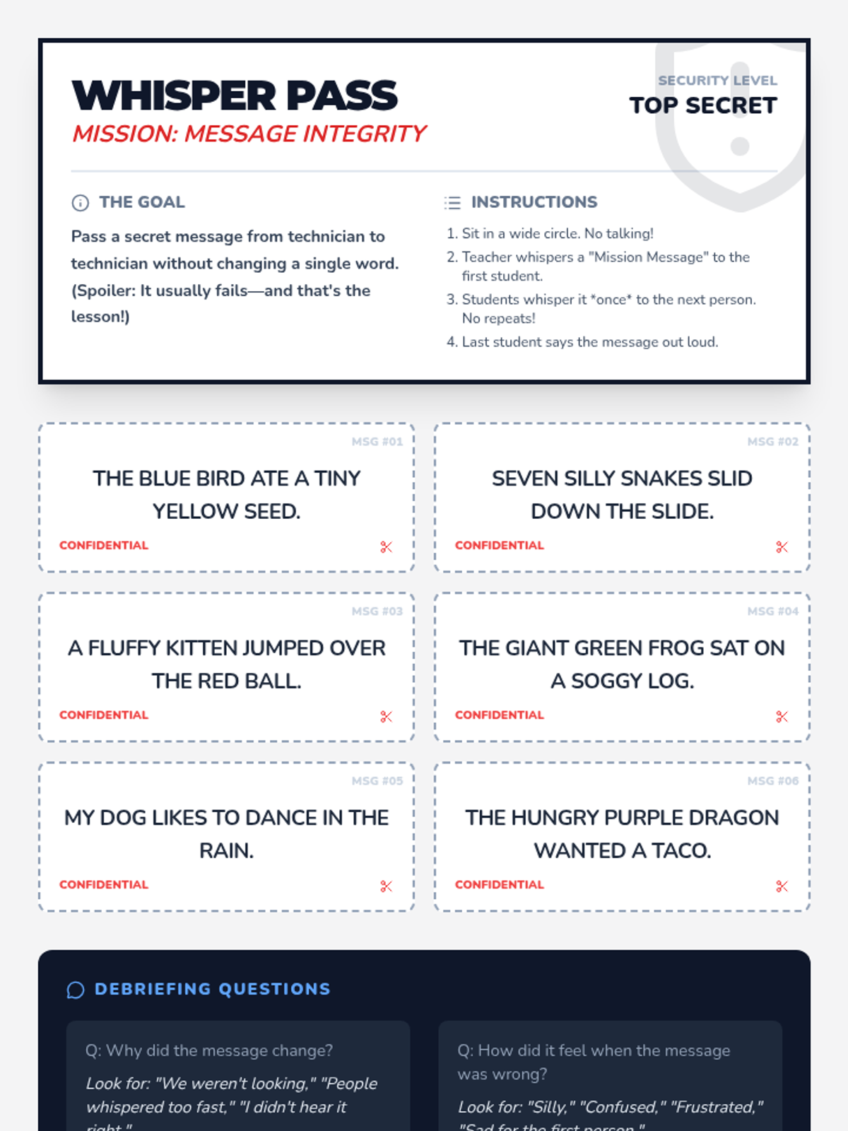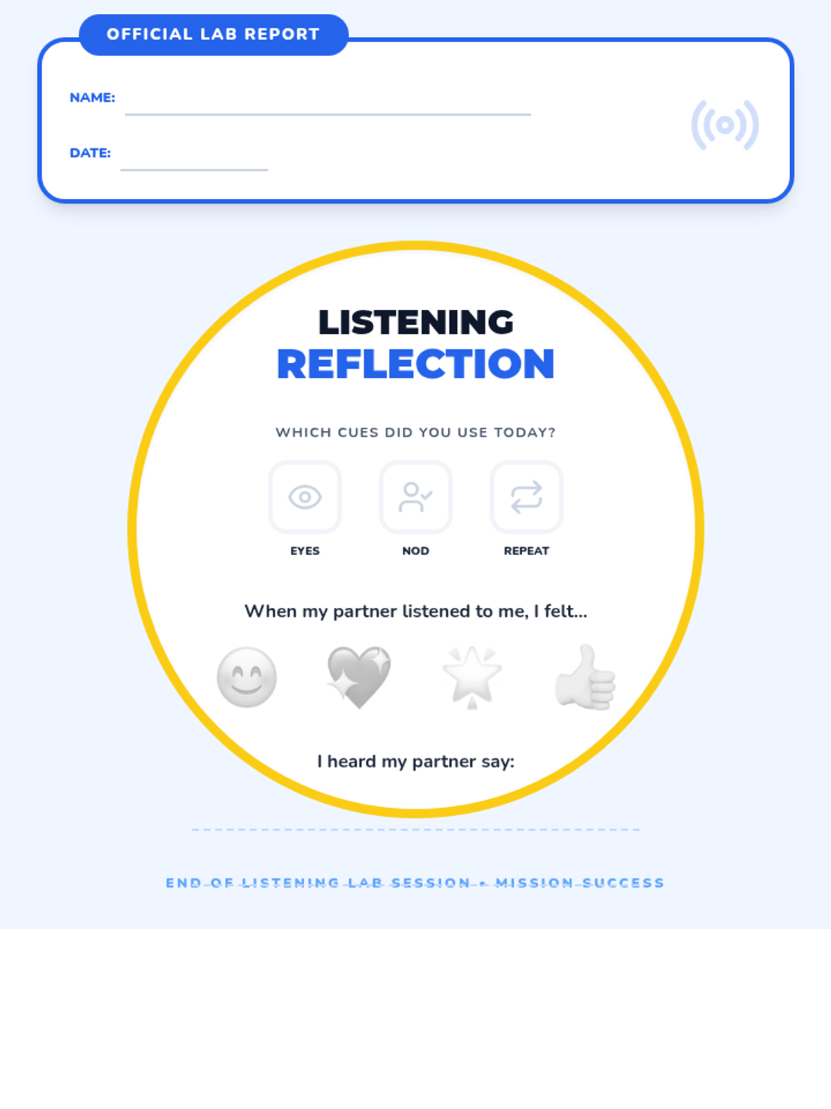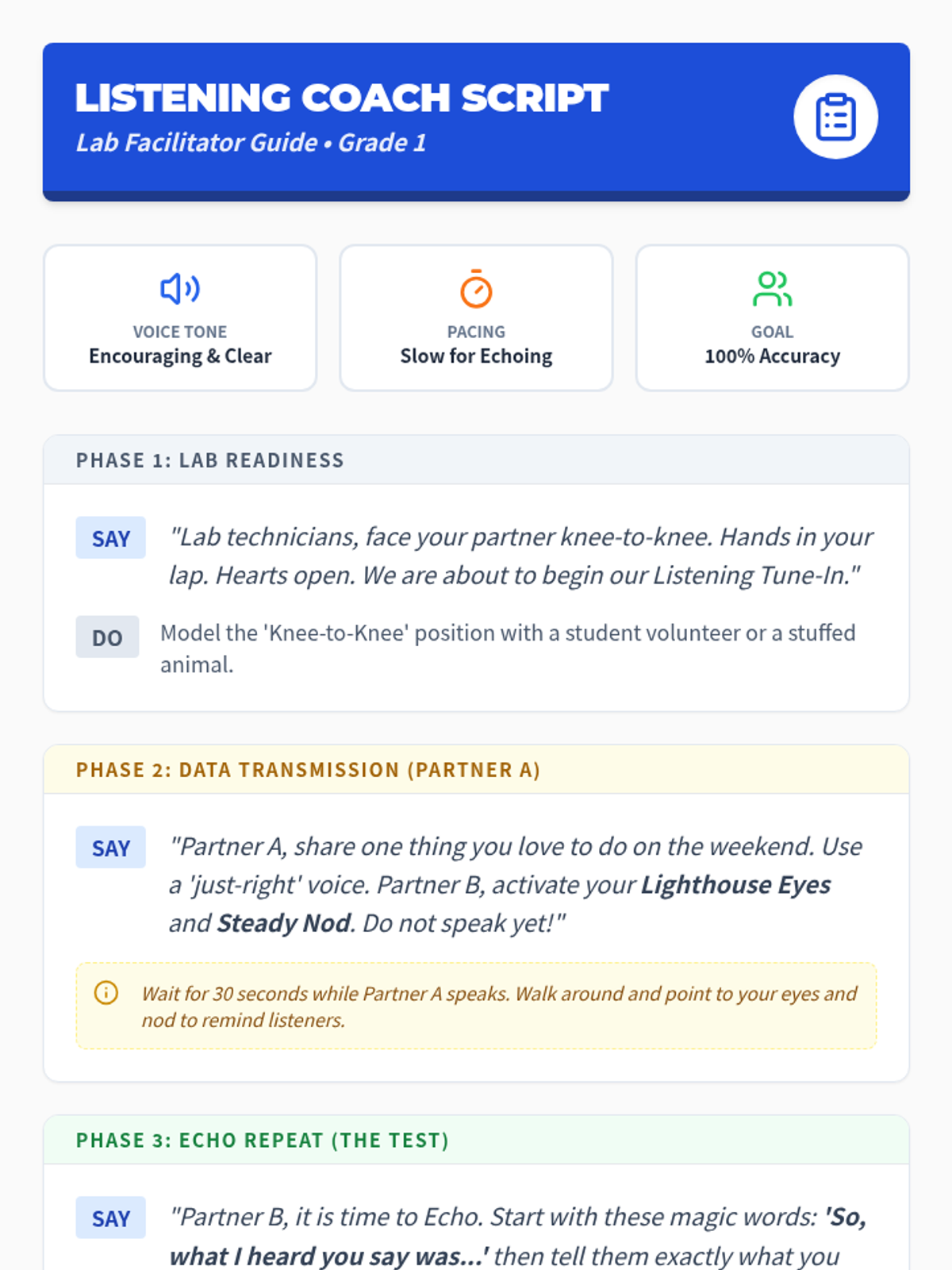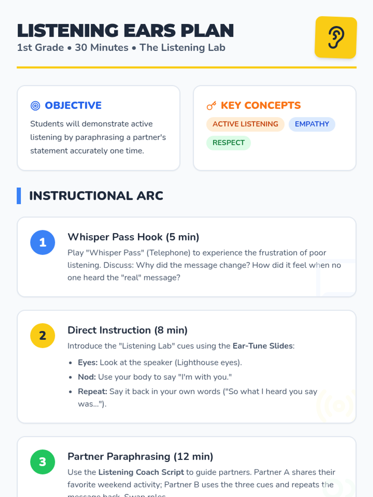 A high-energy 30-minute lesson for 1st graders focused on the mechanics of active listening. Students learn to 'tune in' using their eyes, bodies, and voices to show respect and empathy toward their peers.