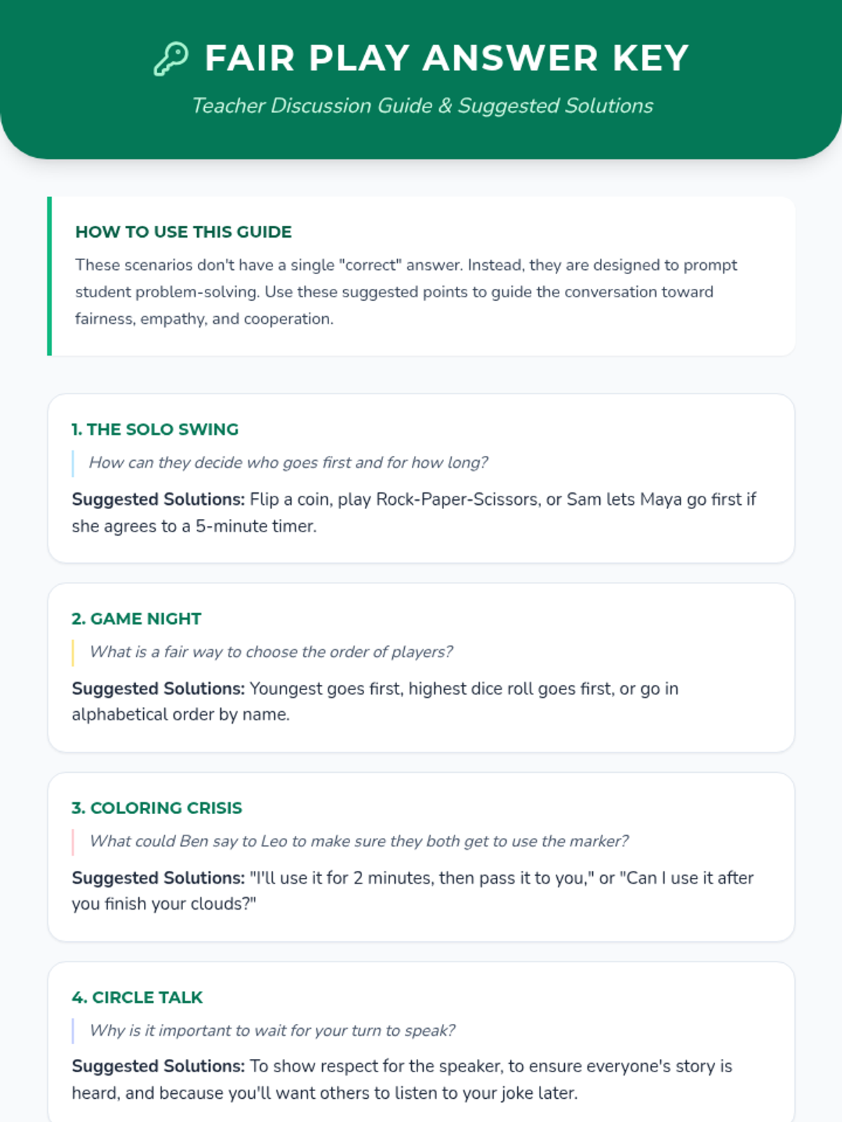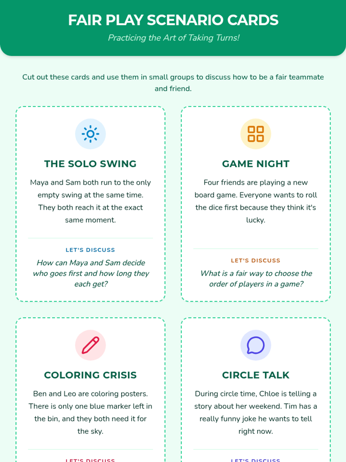 A lesson focused on the essential social skill of taking turns to foster cooperation and fair play among students.