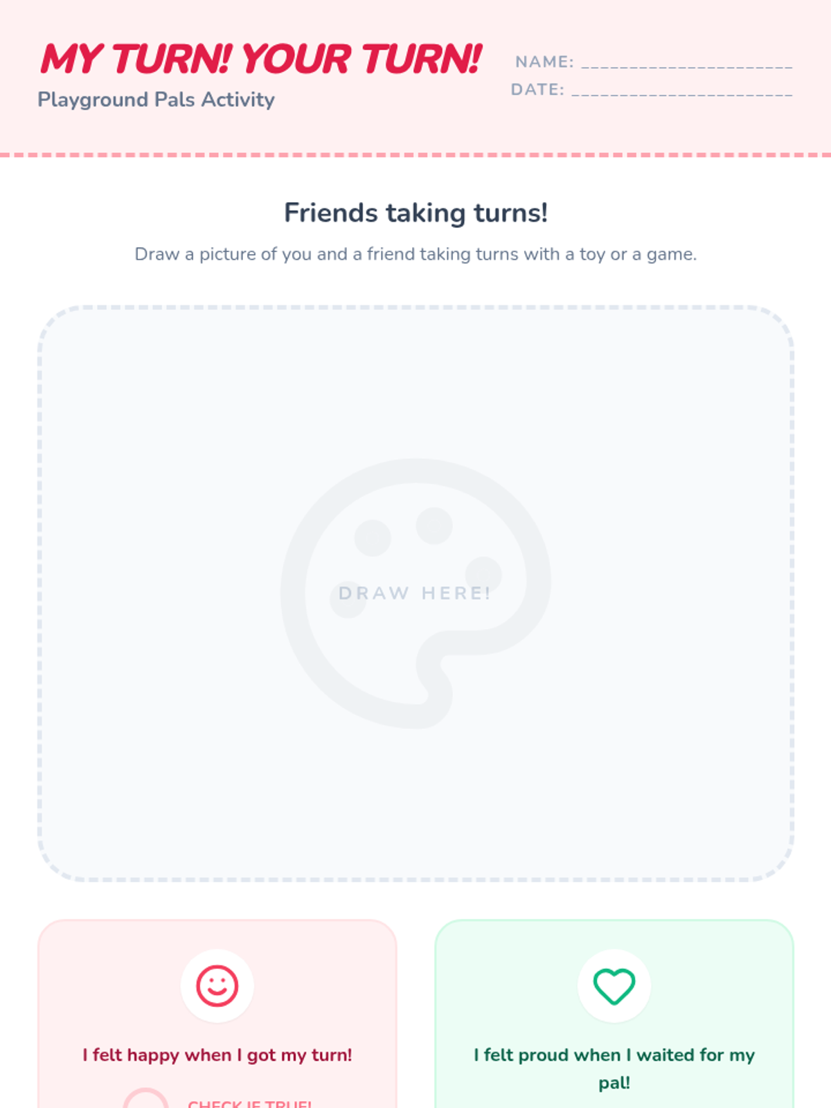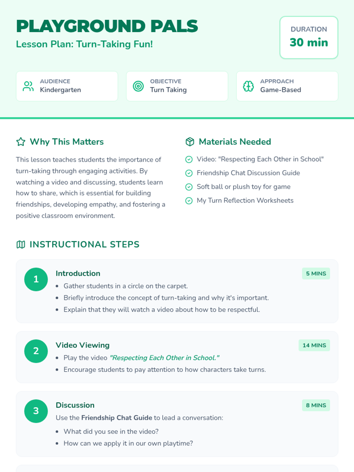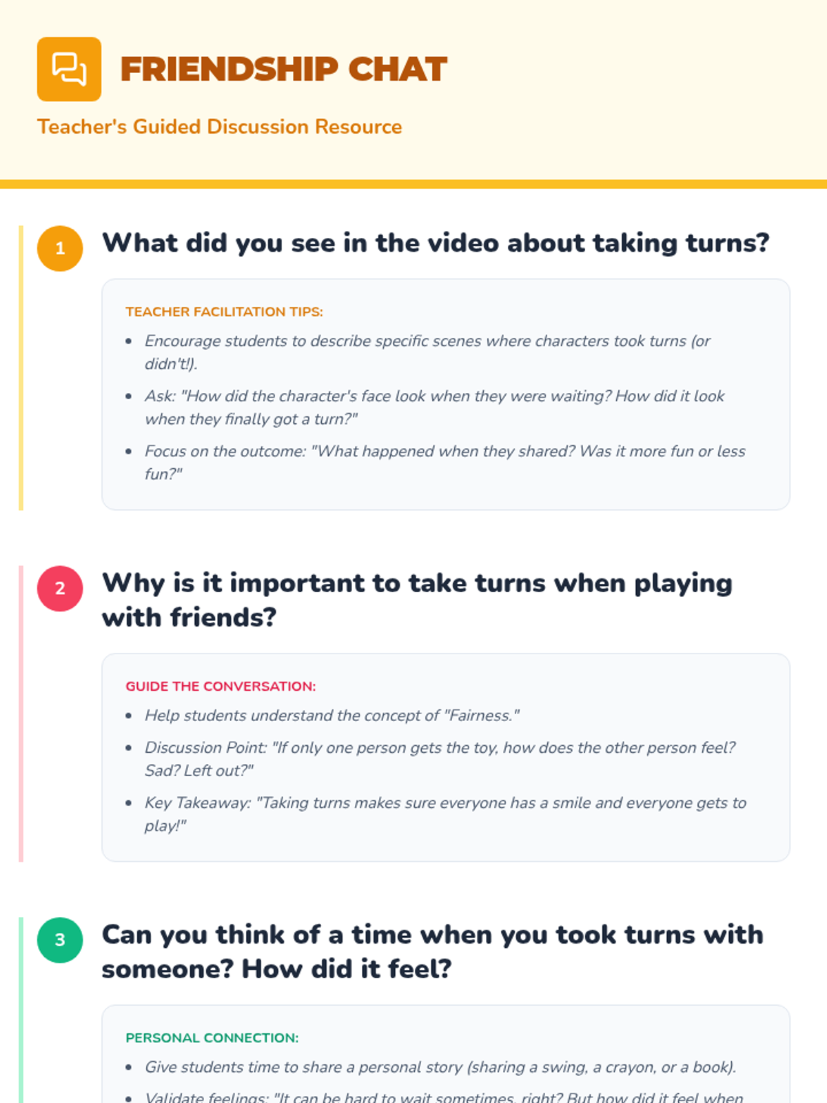 A kindergarten lesson designed to teach the essential social skill of turn-taking. Students watch a video, engage in guided discussions, and participate in a hands-on game to practice sharing and respectful interaction.