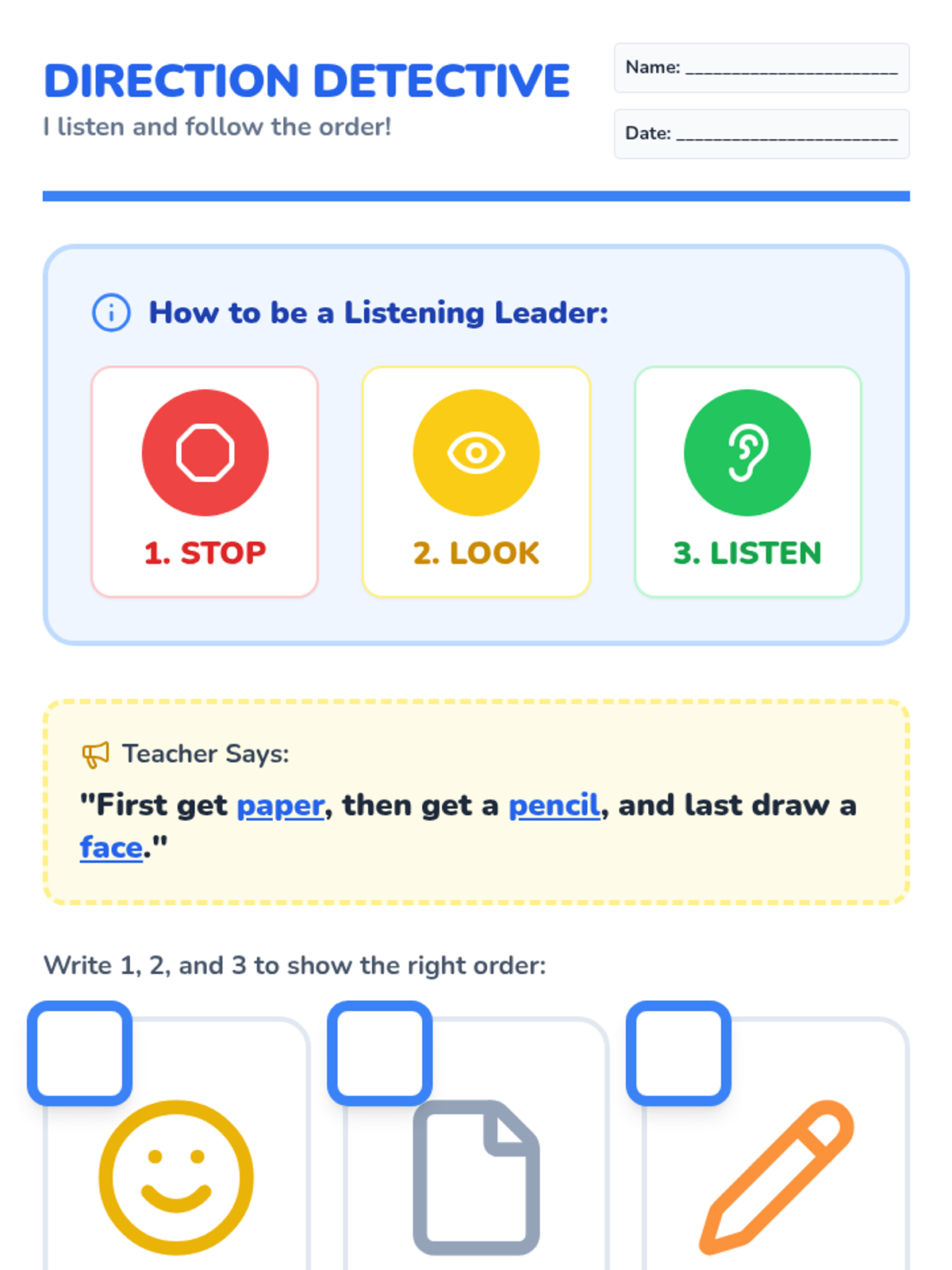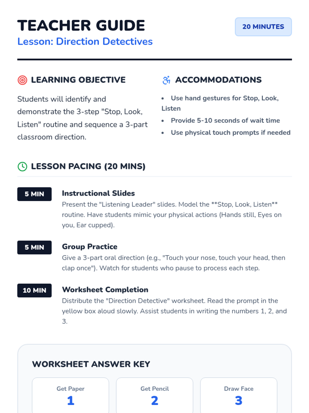 A concise, 20-minute social skills lesson designed for K-2 students with learning disorders, focusing on the core steps of following classroom directions through visual cues and sequencing.
