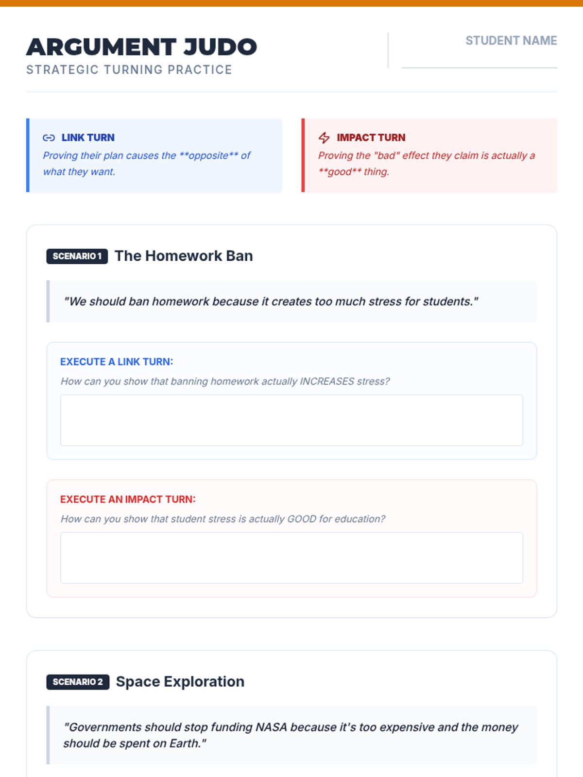 Teaches students the advanced strategy of 'turning' an argument to show why it actually supports their own side.