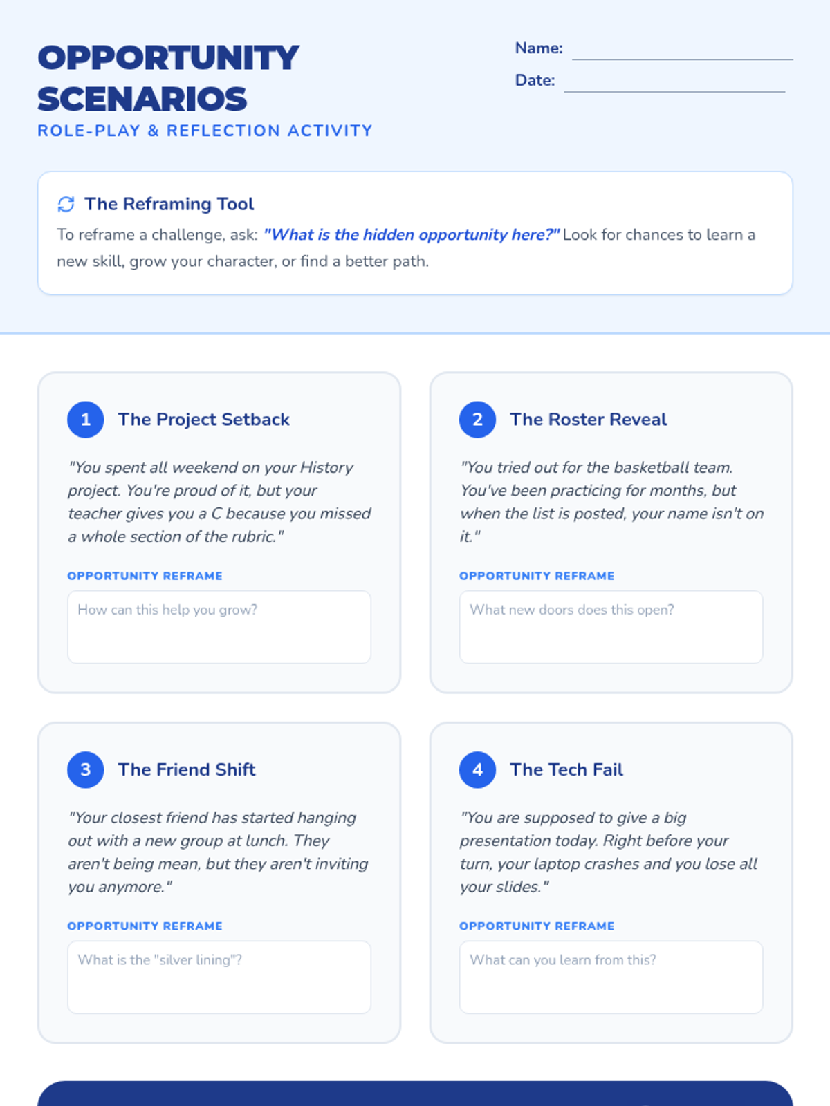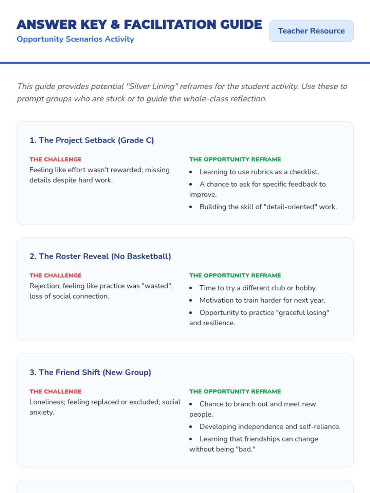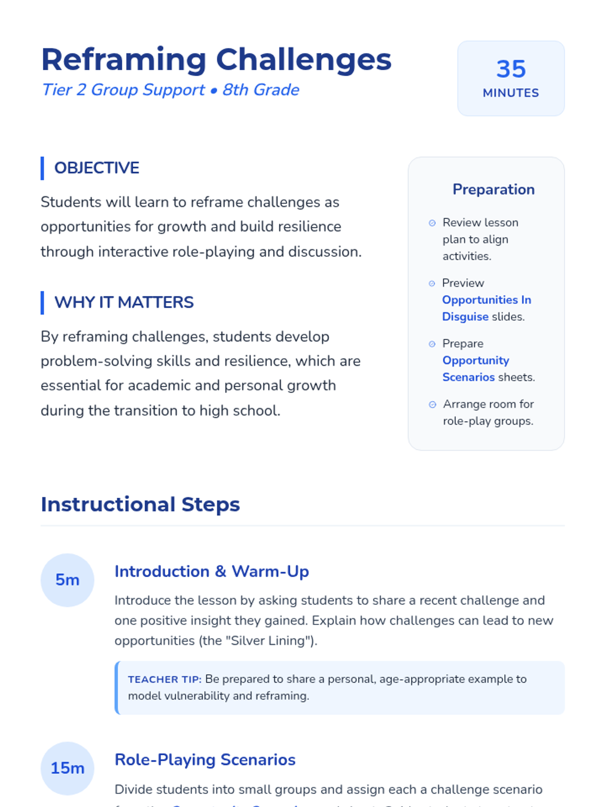 This 35-minute Tier 2 group session helps 8th-grade students develop resilience by learning to reframe difficult situations as growth opportunities through interactive role-play and discussion.