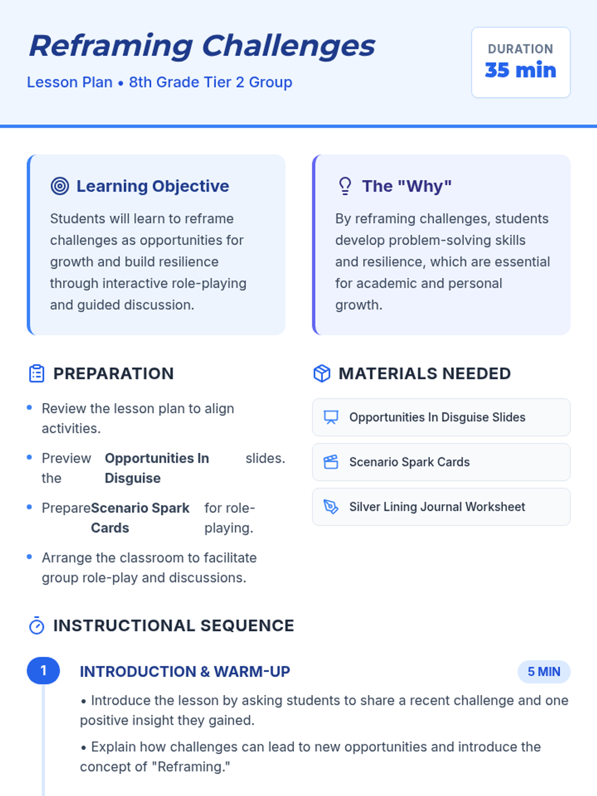 An 8th-grade Tier 2 group session focused on developing resilience by reframing challenges as opportunities for growth through role-playing and discussion.