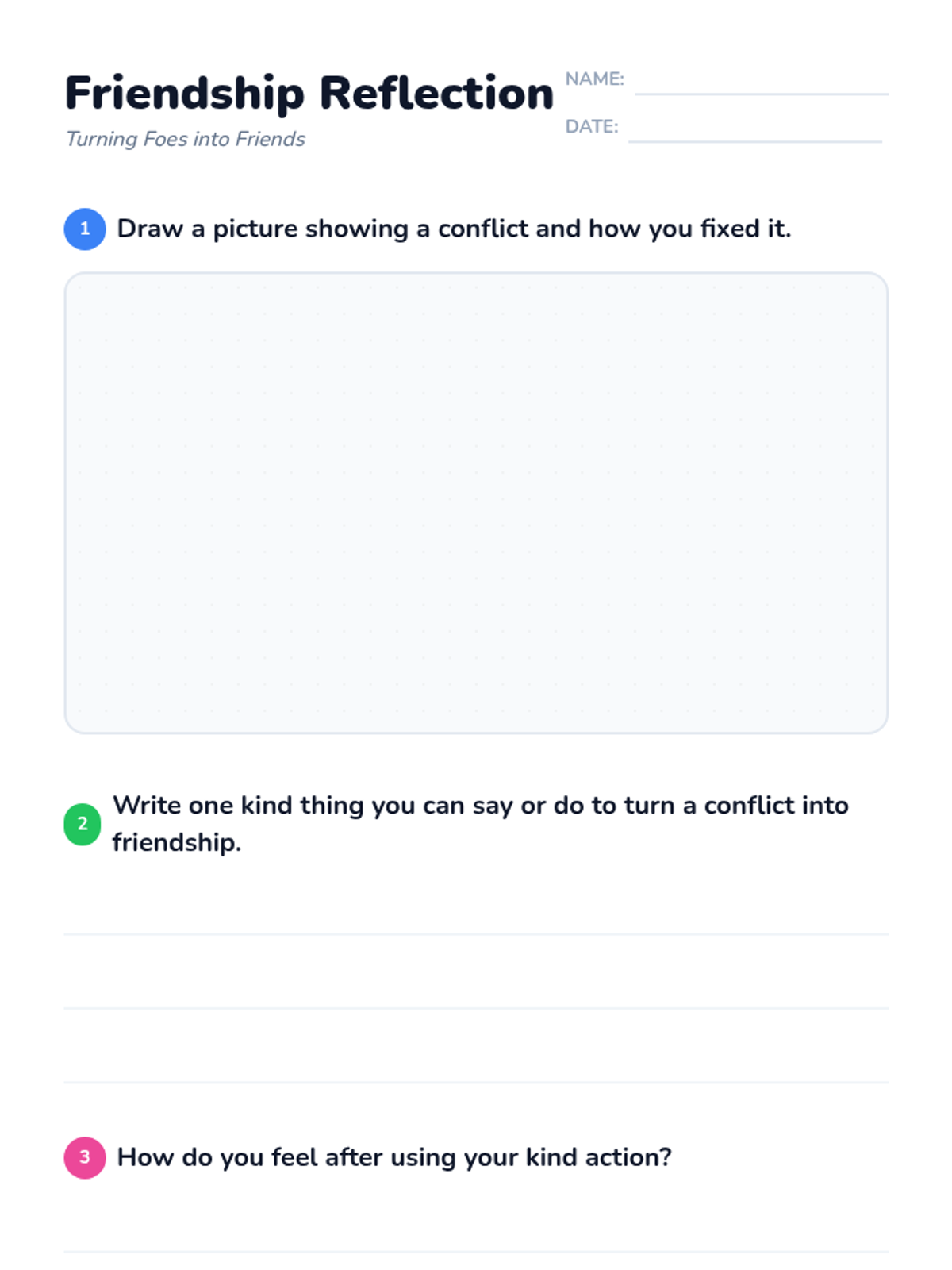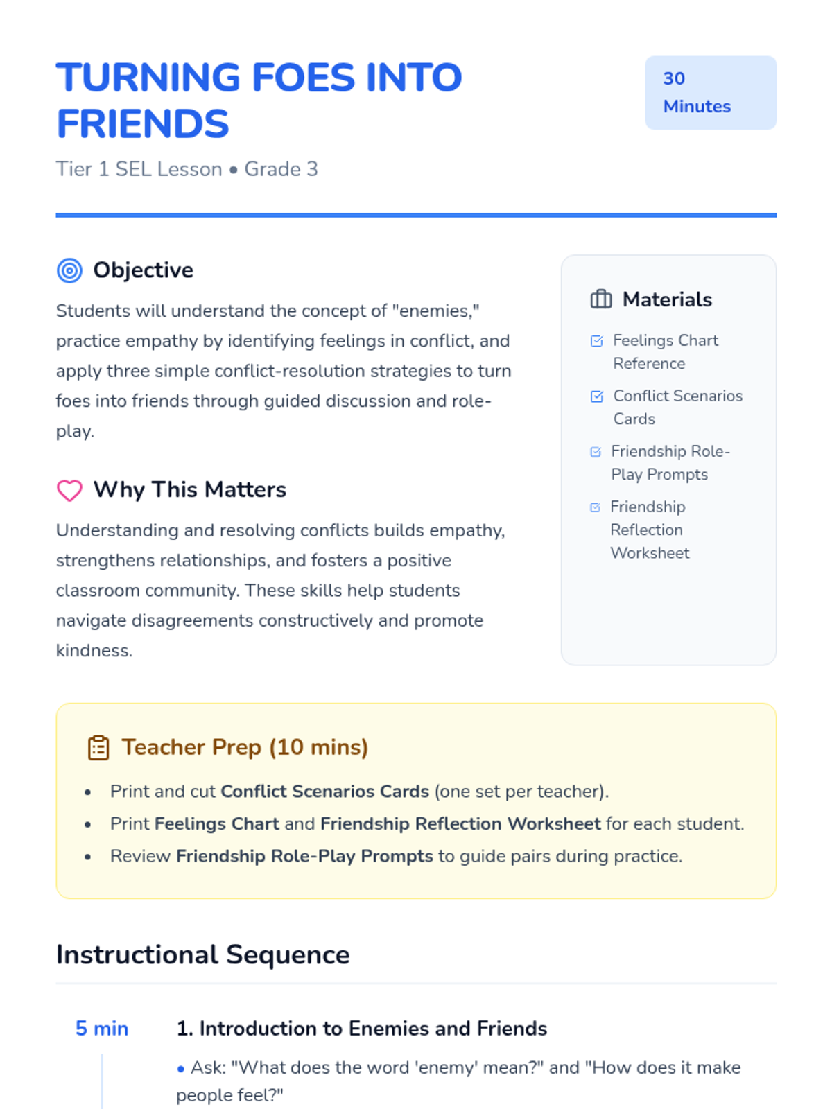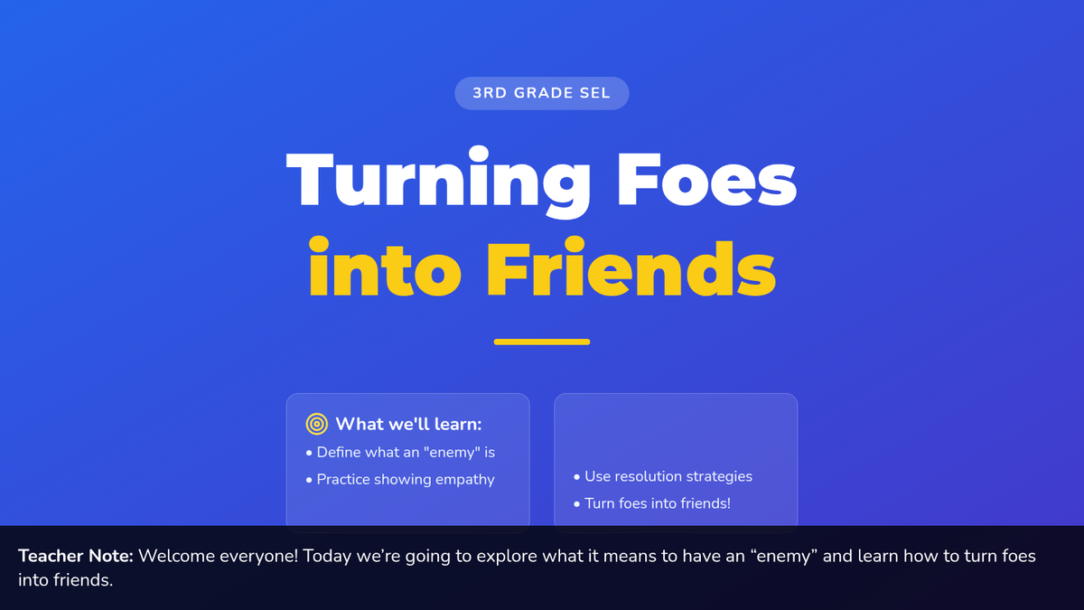 A 30-minute Tier 1 SEL lesson for 3rd graders focused on understanding conflict, building empathy, and practicing resolution strategies to transform disagreements into positive relationships.