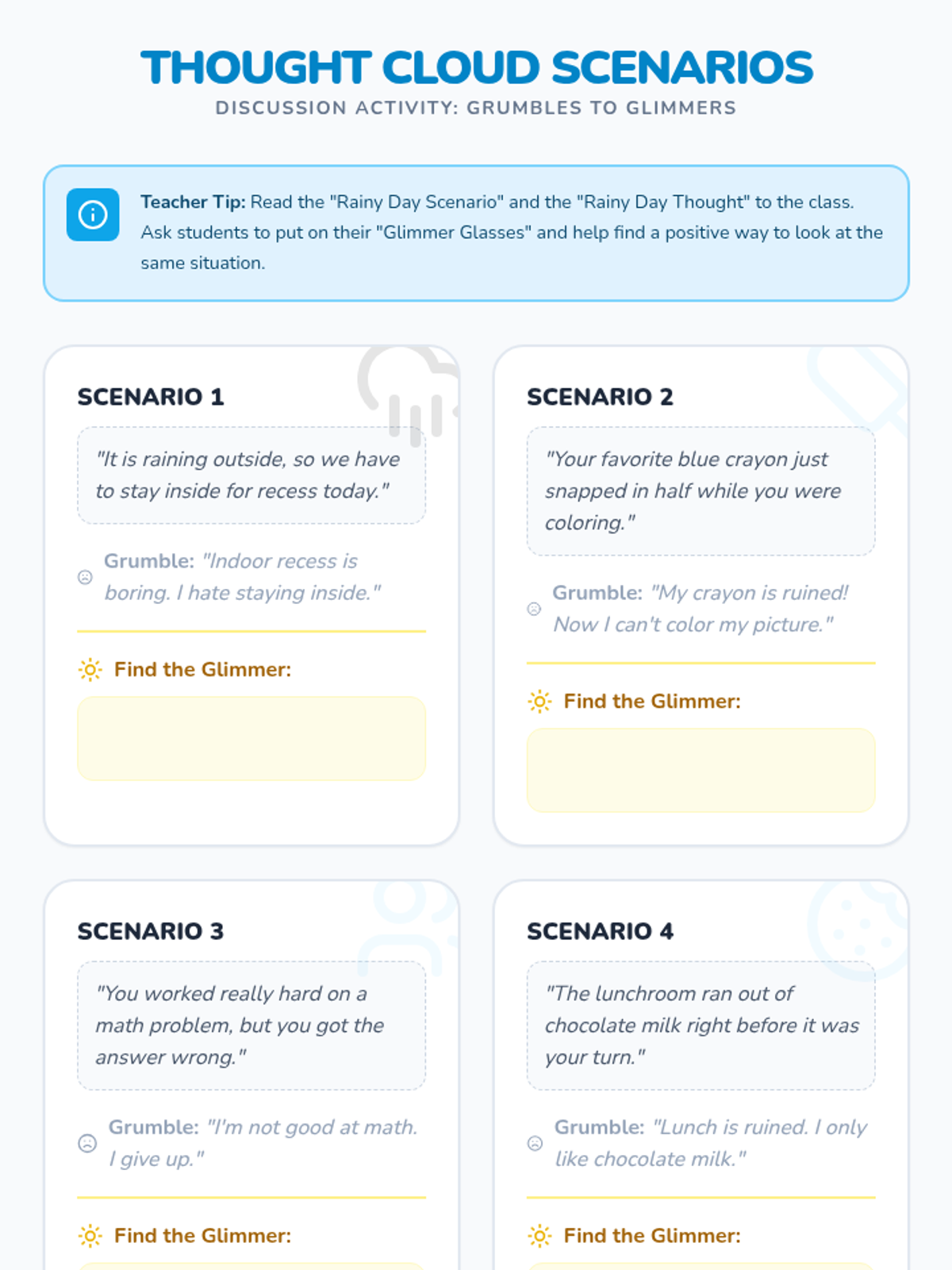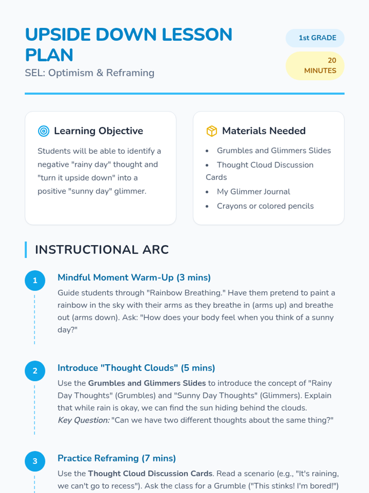 A 20-minute SEL lesson for 1st graders focusing on the power of optimism and reframing negative 'rainy day' thoughts into positive 'sunny day' perspectives. Students will practice shifting their mindset through interactive scenarios and personal reflection.