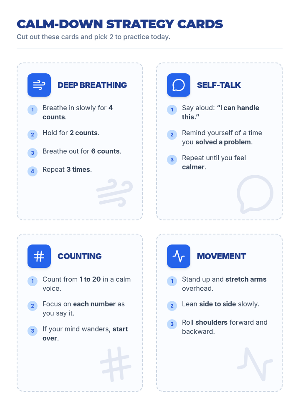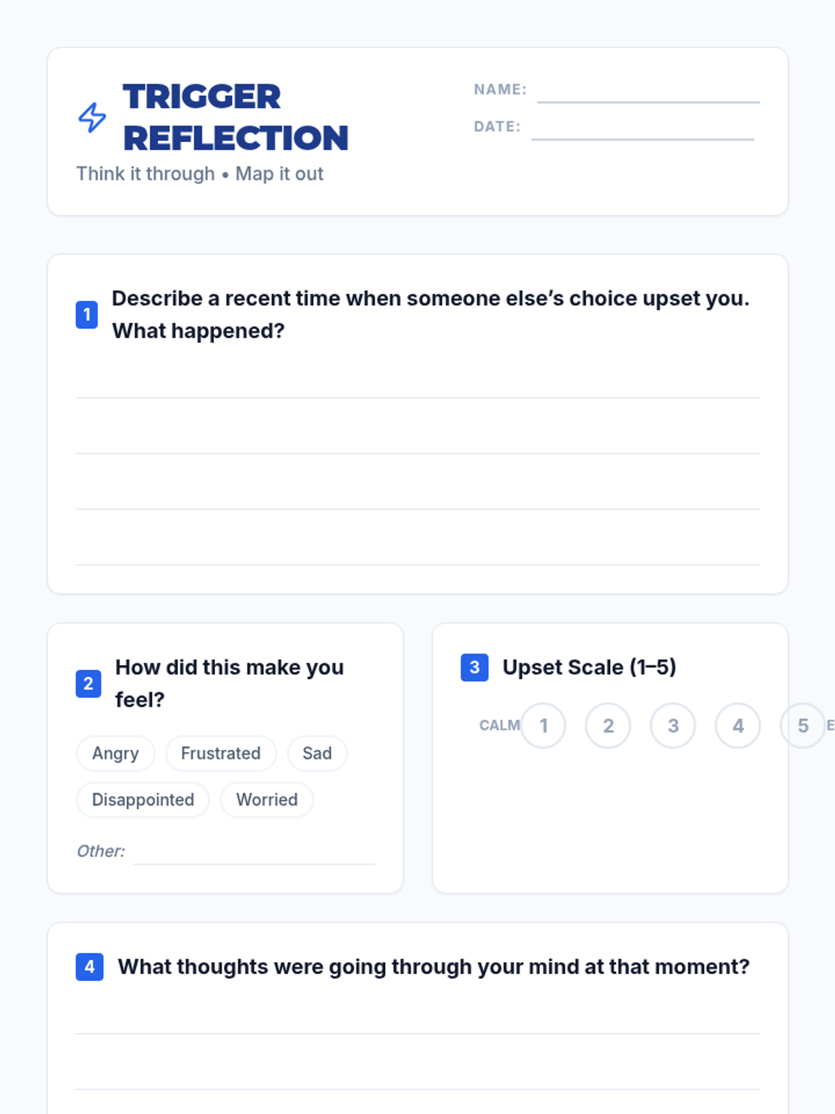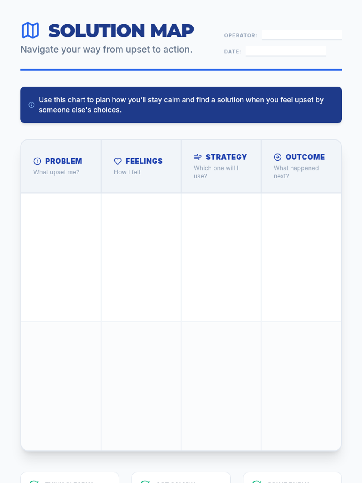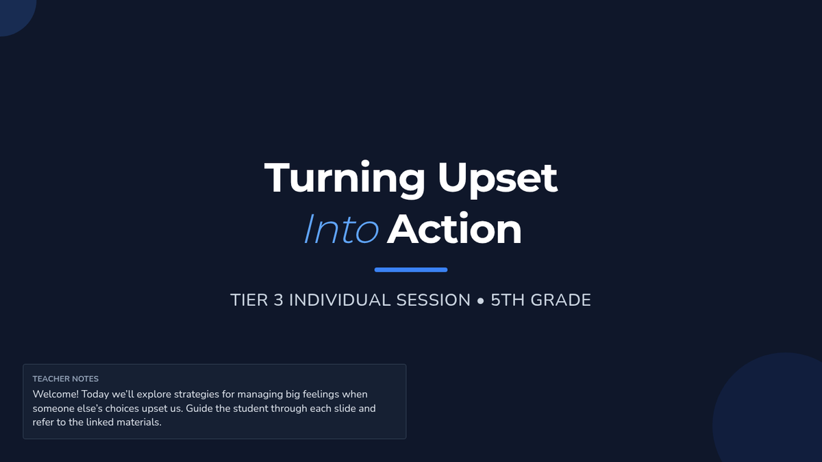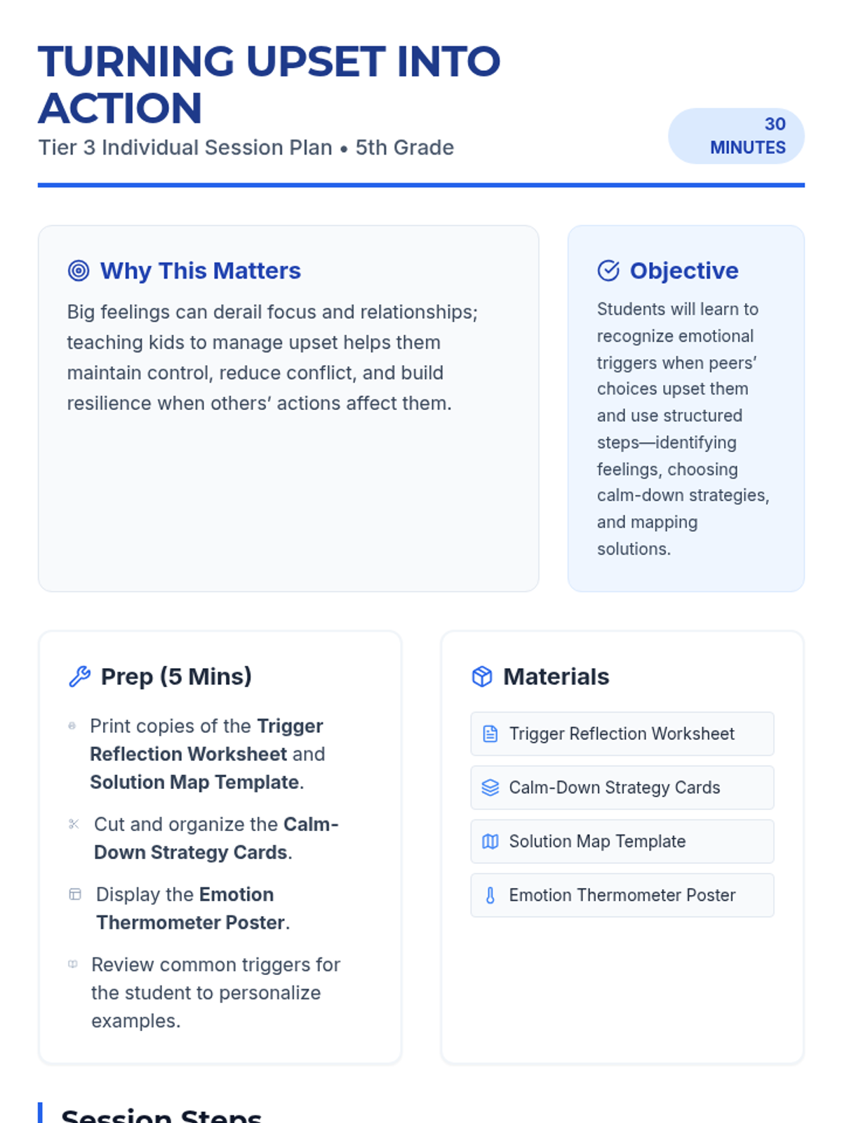 In this 30-minute individual Tier 3 session, 5th-grade students learn to identify emotional triggers and use structured calm-down strategies and solution mapping to manage big feelings caused by others' choices.
