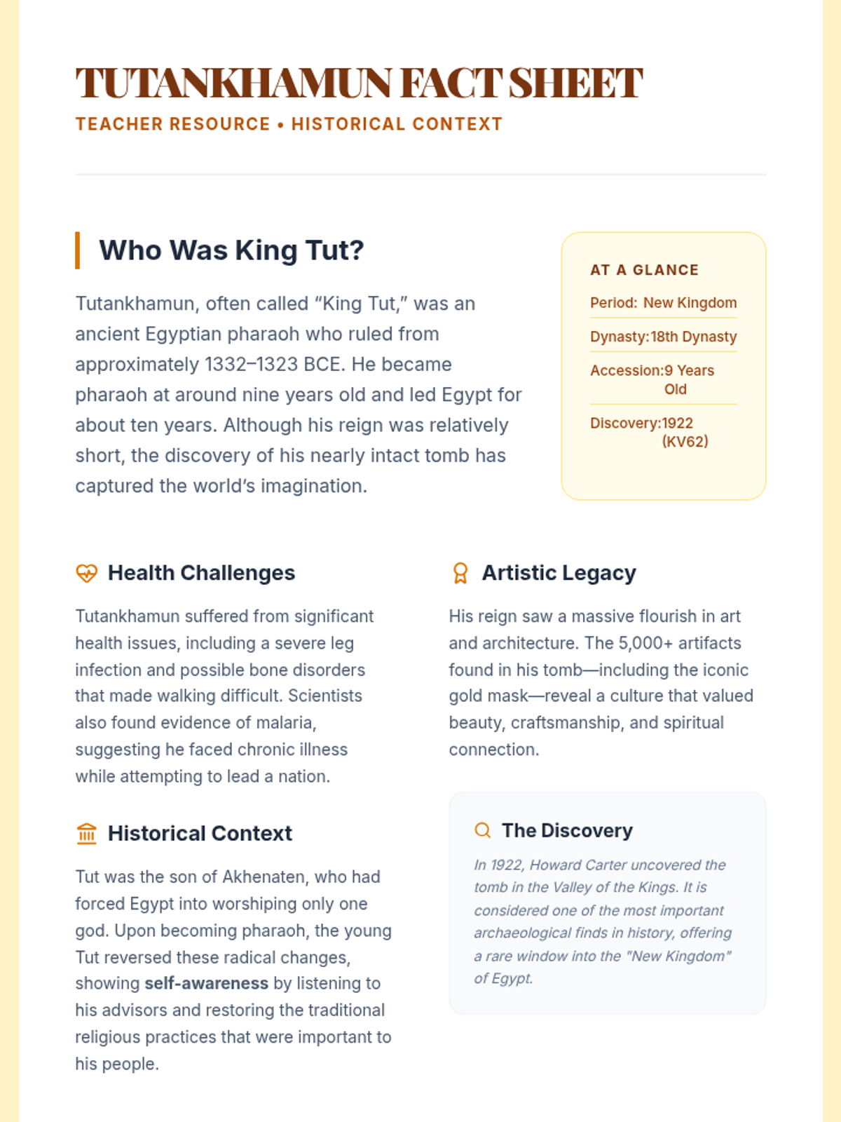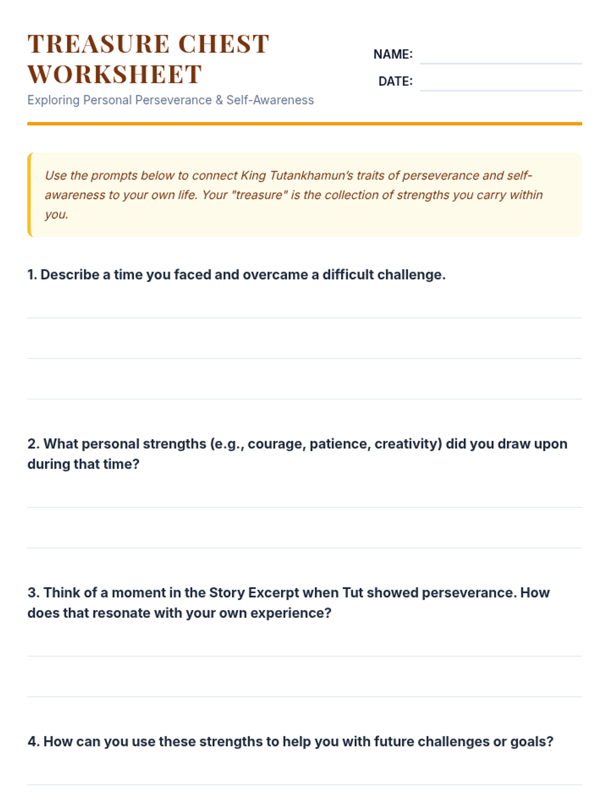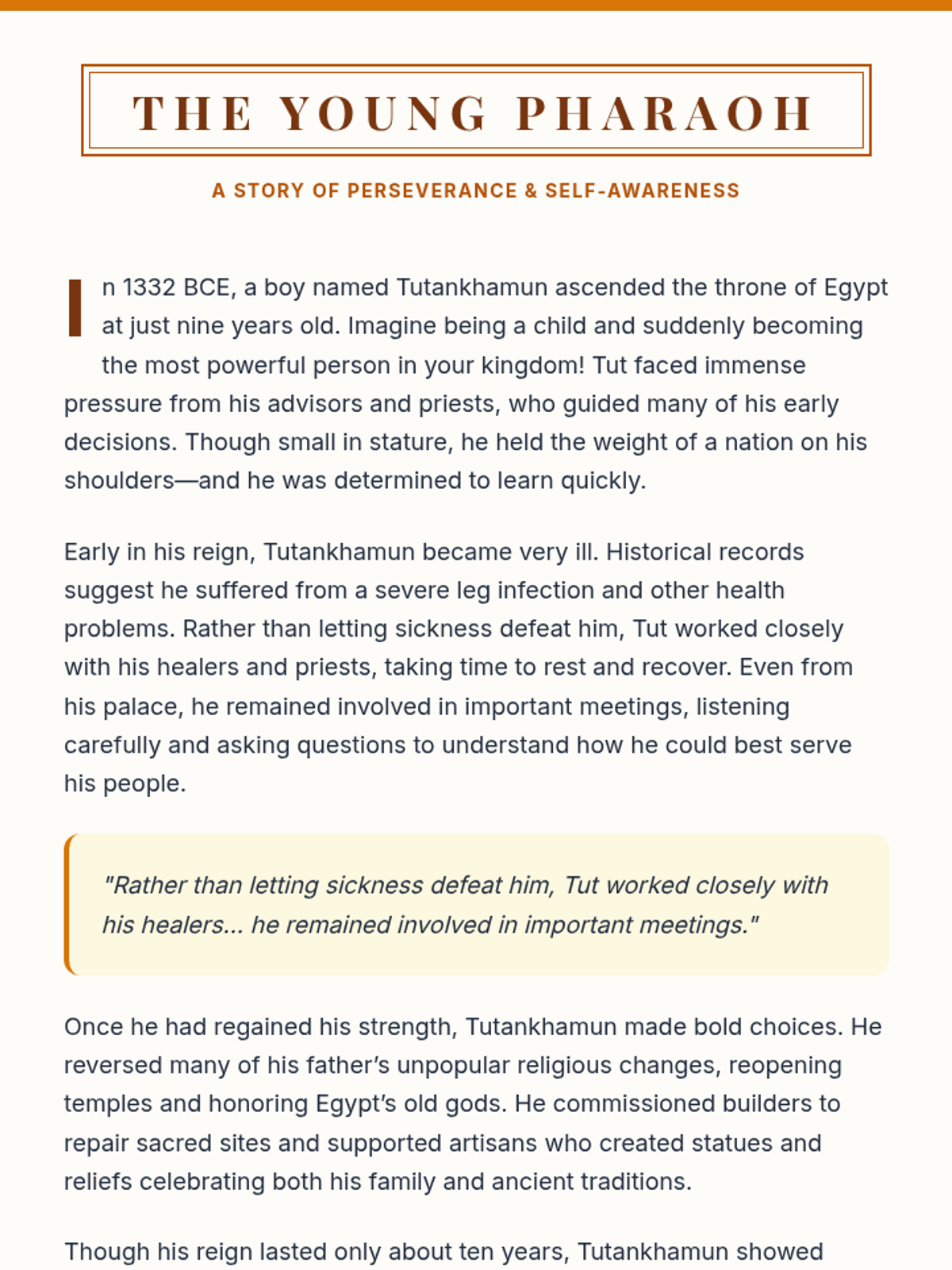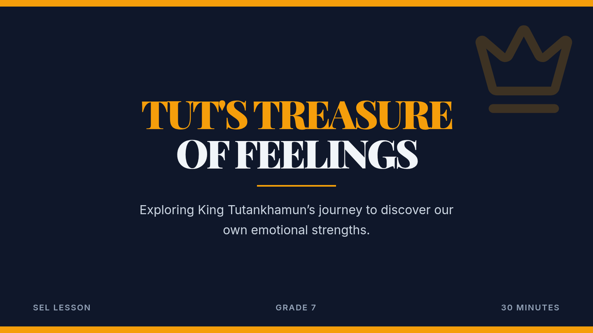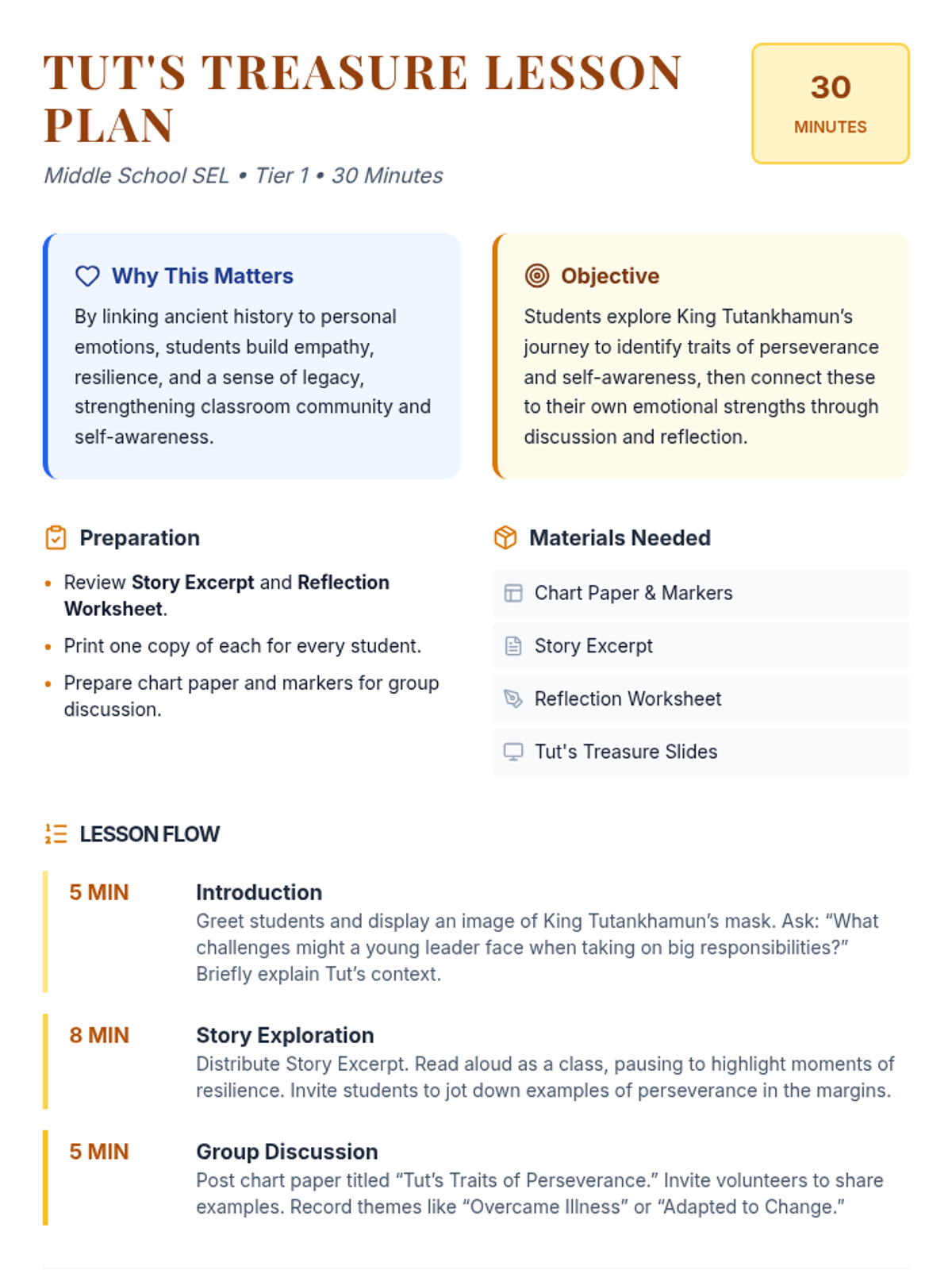 A 30-minute SEL lesson for 7th graders where students explore the story of King Tutankhamun to build perseverance, self-awareness, and empathy. Students connect ancient history to their own emotional strengths through story analysis and personal reflection.