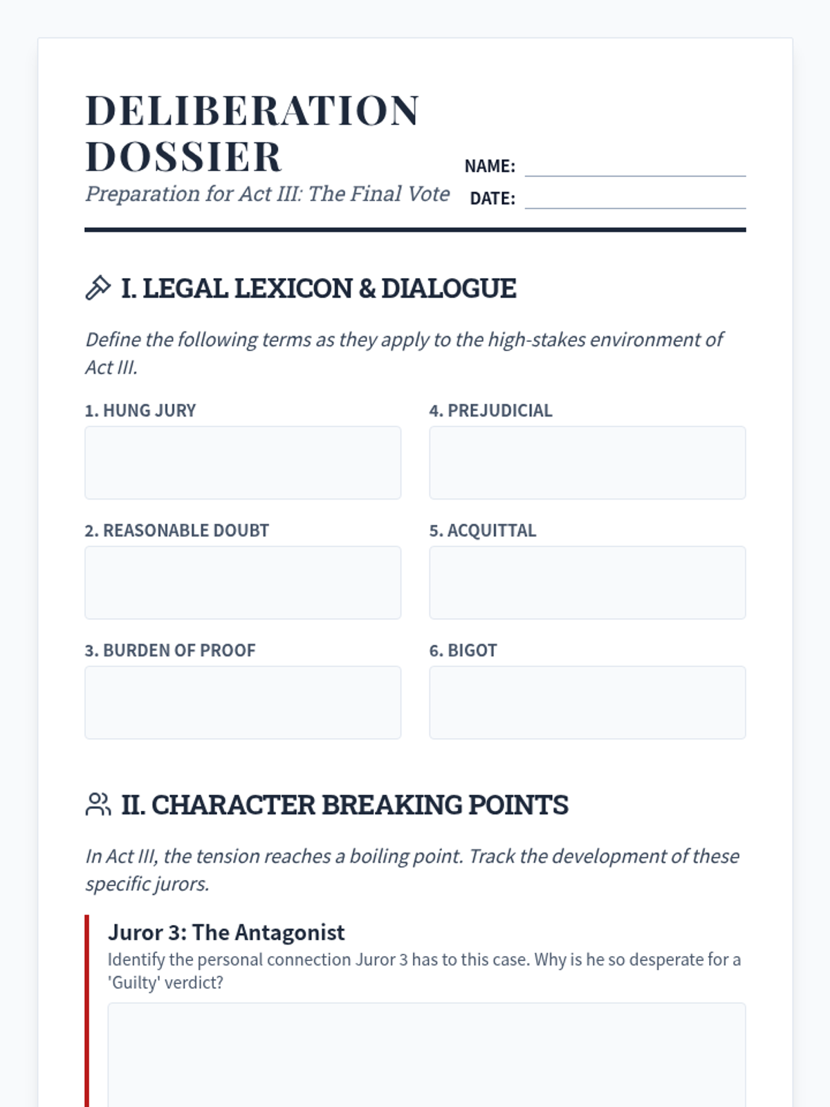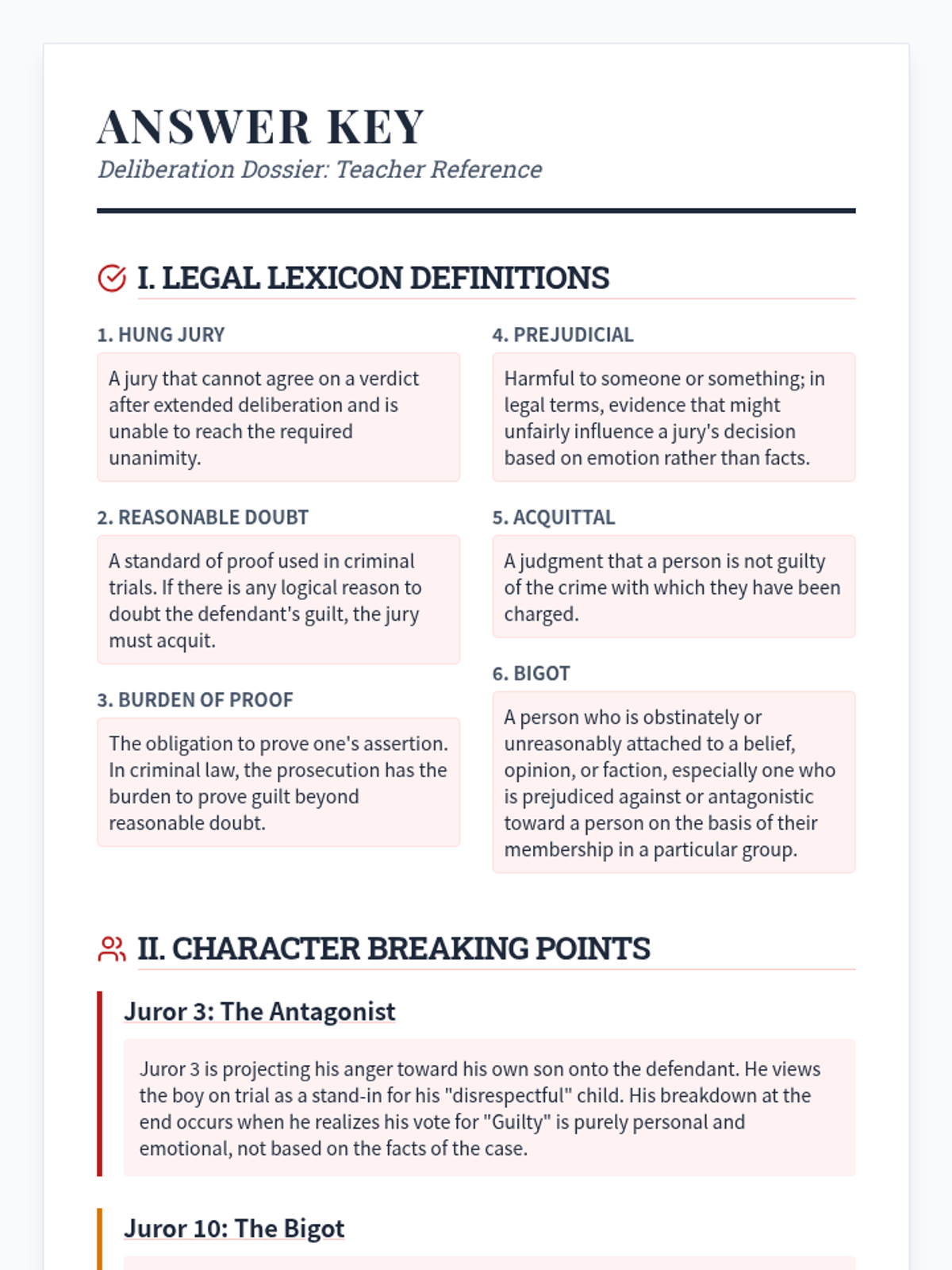 This lesson prepares students for the climactic final act of 12 Angry Men, focusing on the shifting dynamics of the jury and the sociological implications of the justice system's 'reasonable doubt' standard. Students will explore legal terminology and track the breaking points of key jurors.