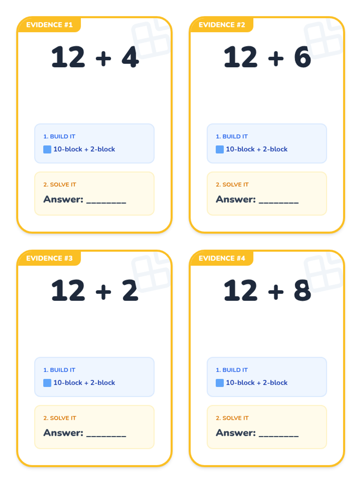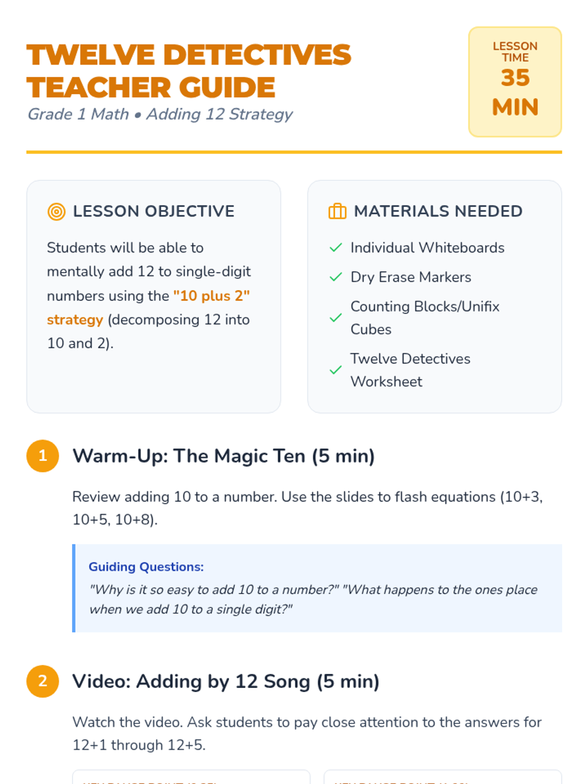 A 1st Grade math lesson that teaches students to mentally add 12 to single-digit numbers by decomposing 12 into 10 and 2. Includes a catchy song, interactive slide activities, and hands-on practice with counting blocks.