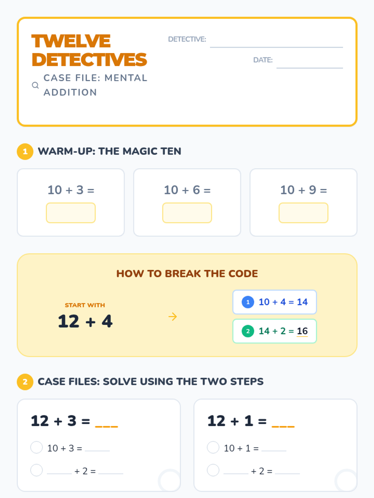 This lesson introduces addition within 20 through the 'Make Ten' strategy and Number Bonds. Students progress from using physical counters to visual ten frames and finally to abstract equations.