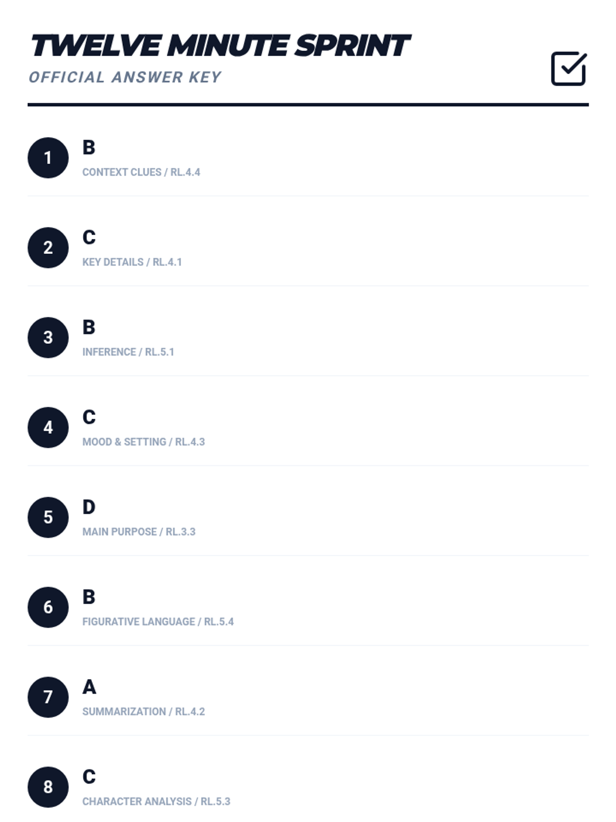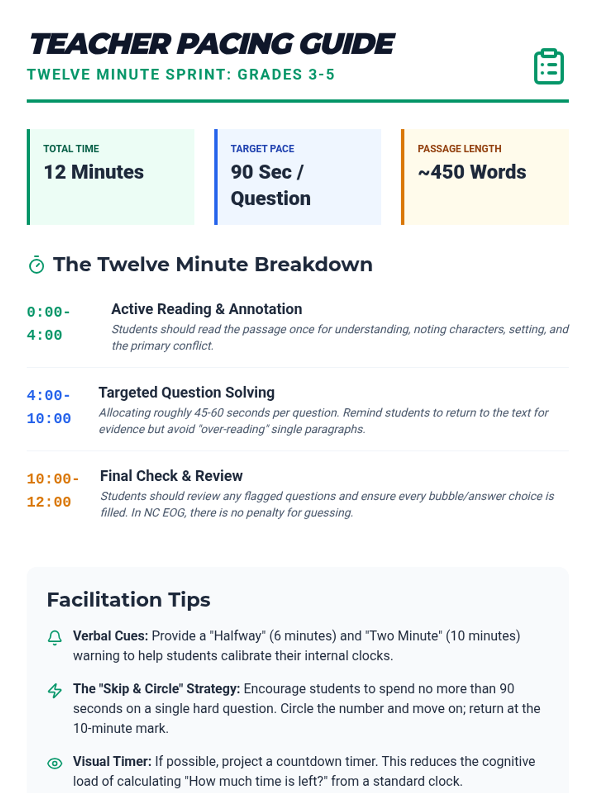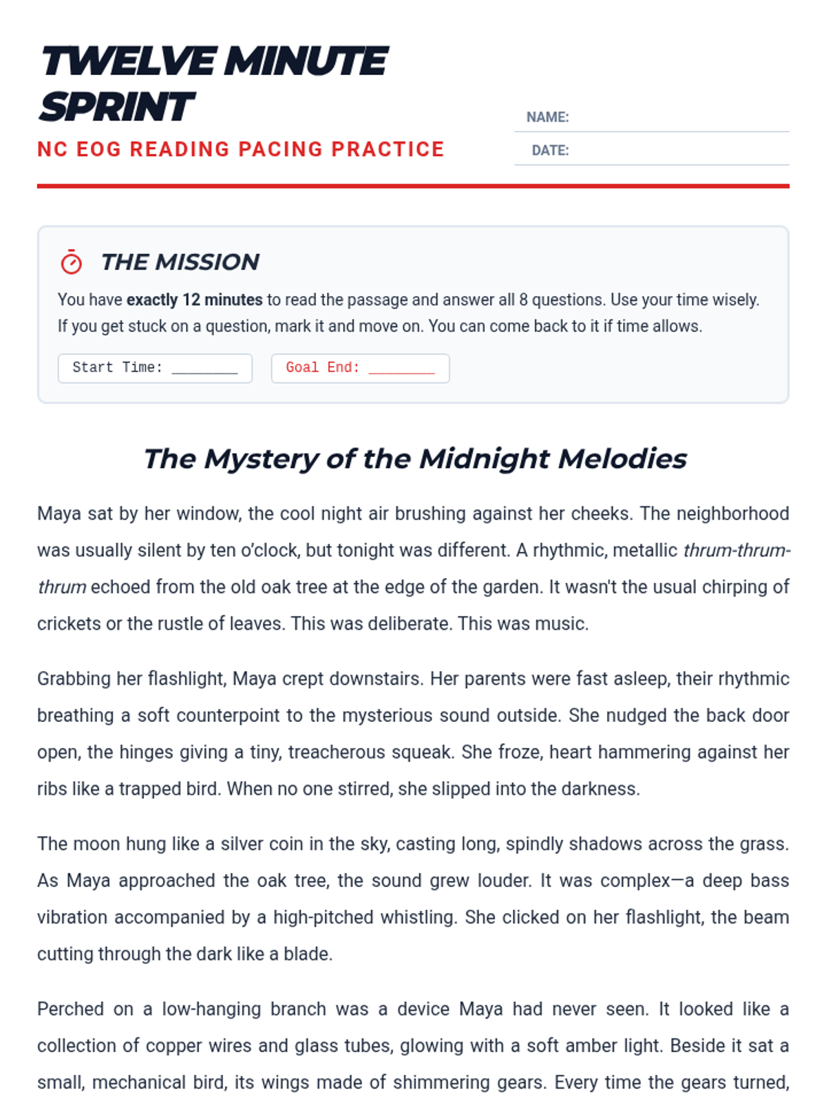 A timed reading practice session designed to prepare students for the NC EOG by completing a passage and eight questions in exactly twelve minutes, followed by a pacing reflection.