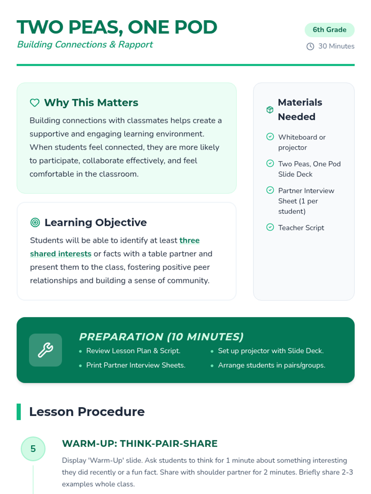 This 30-minute lesson for 6th-grade students helps them build rapport and discover commonalities with their table partners through an engaging interview activity. It fosters a positive classroom environment and strengthens peer connections.
