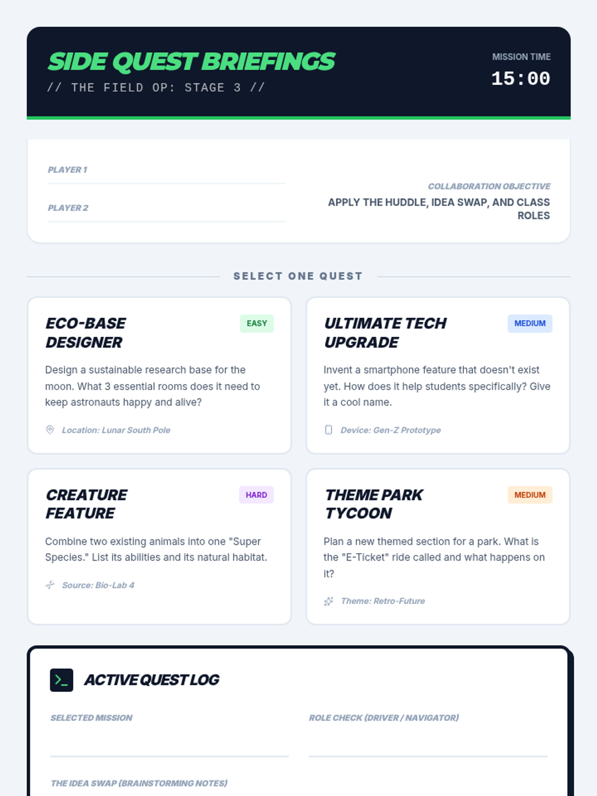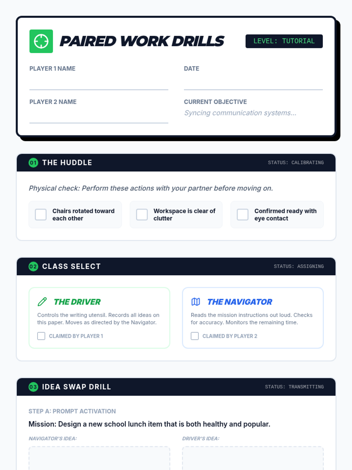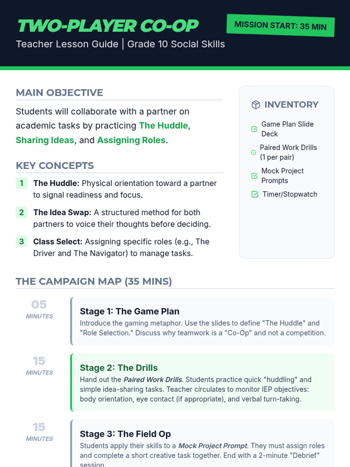 This lesson uses a gaming metaphor ('Two-Player Co-Op') to teach 10th-grade students essential collaboration skills like huddling, sharing ideas, and assigning roles for academic tasks. It is designed to support IEP objectives related to peer interaction and social skills.