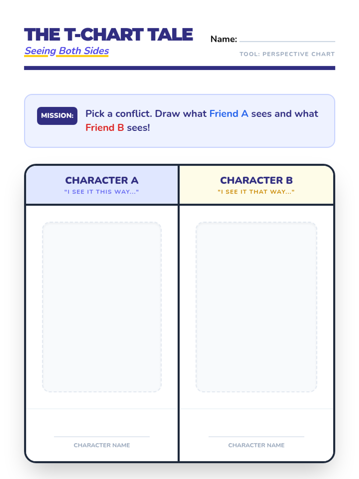 The class creates a T-chart comparing two characters' views of a conflict. Students draw what Character A sees versus what Character B sees, using the 'two-colored object' experiment as a hook.