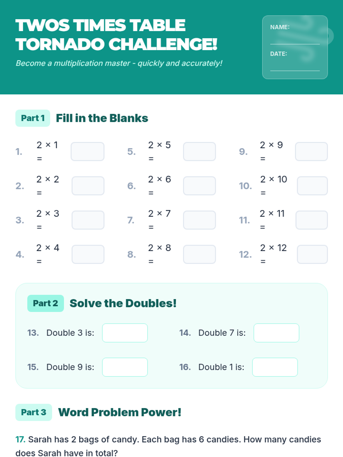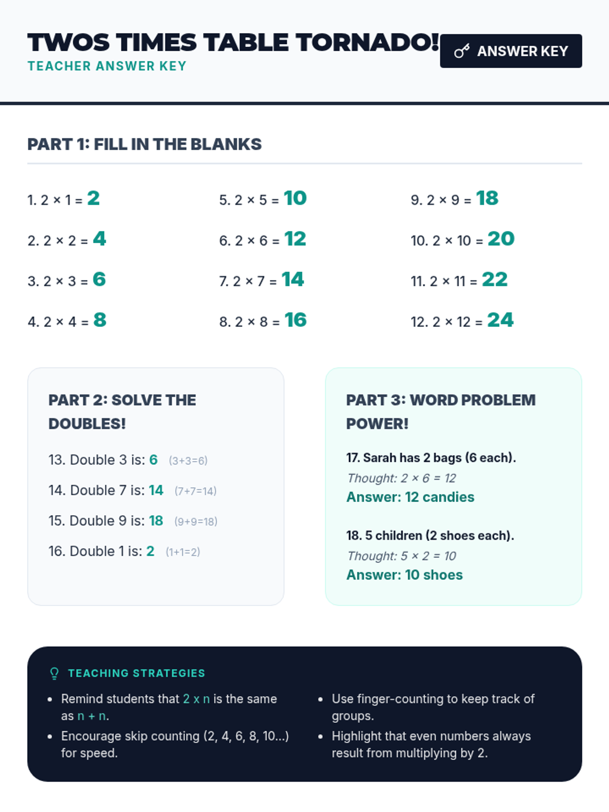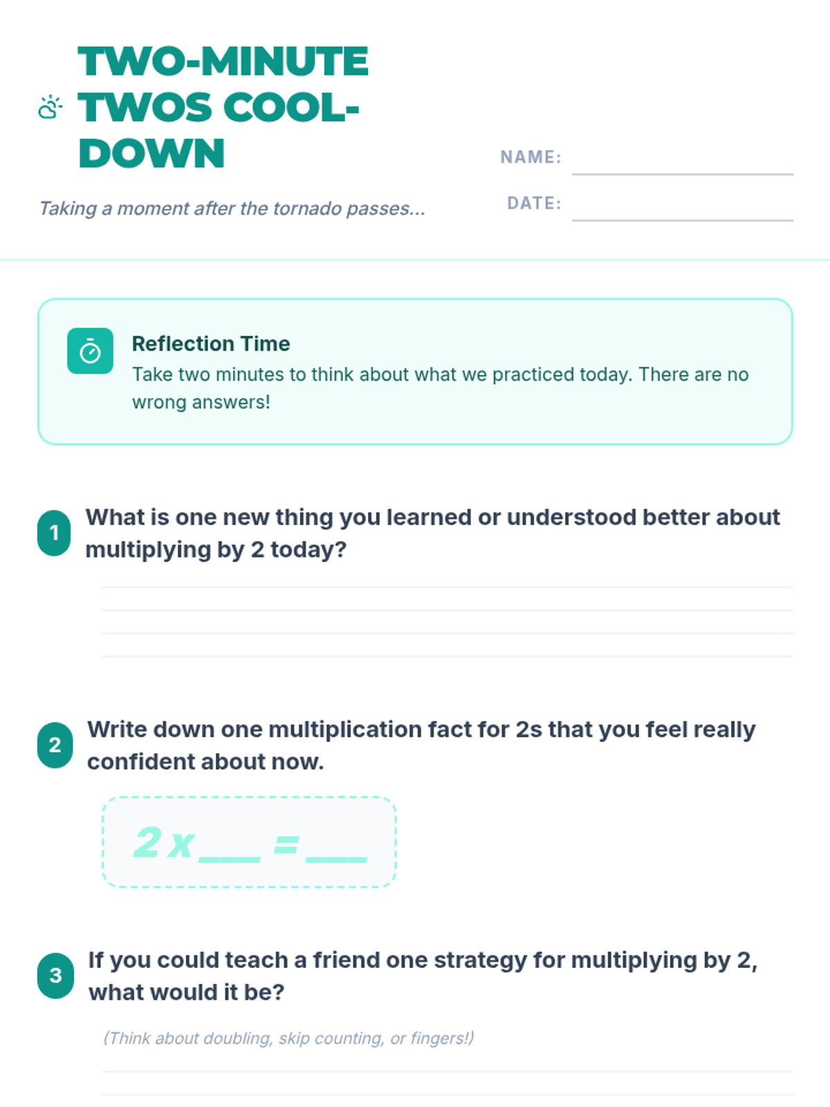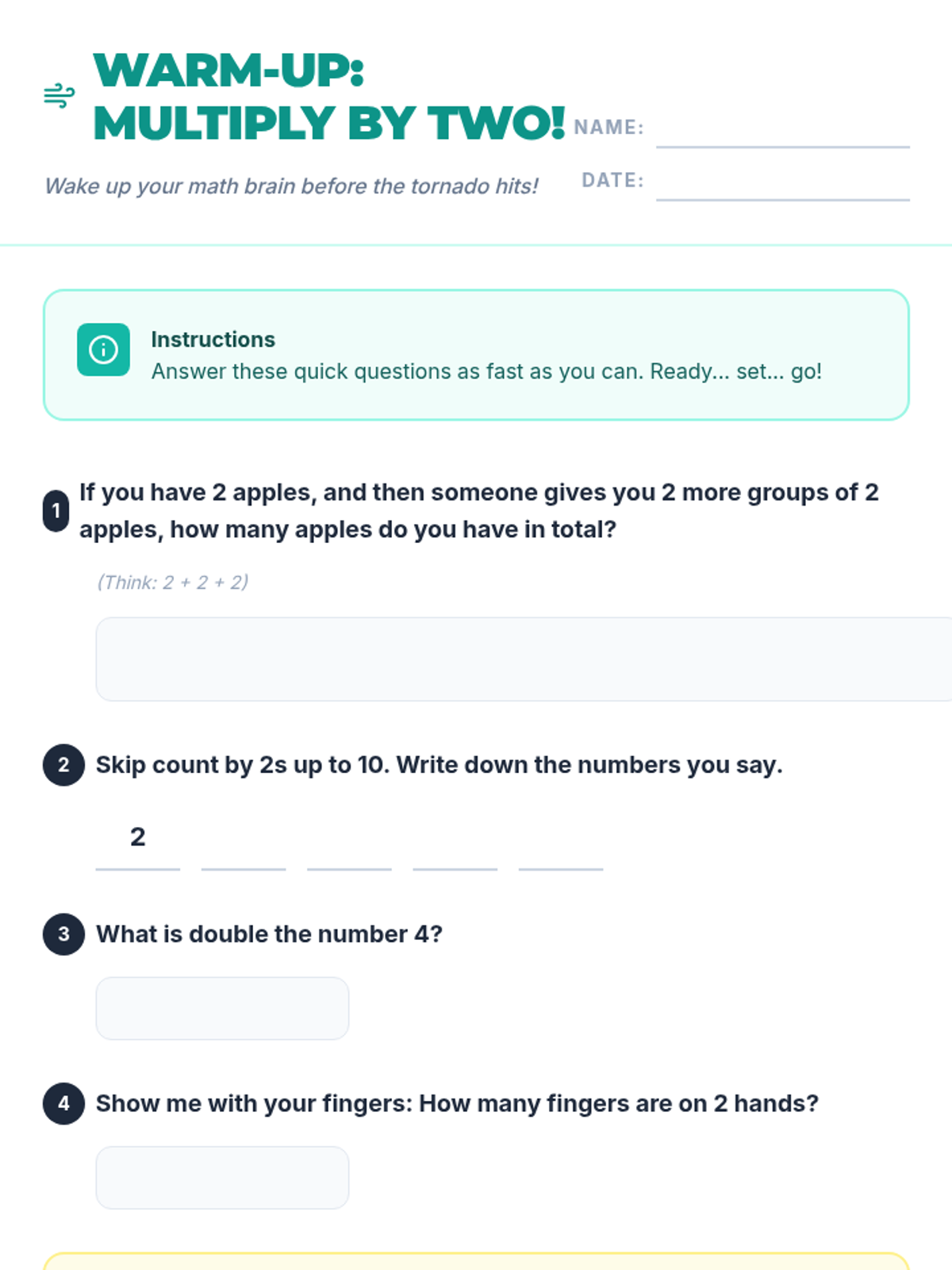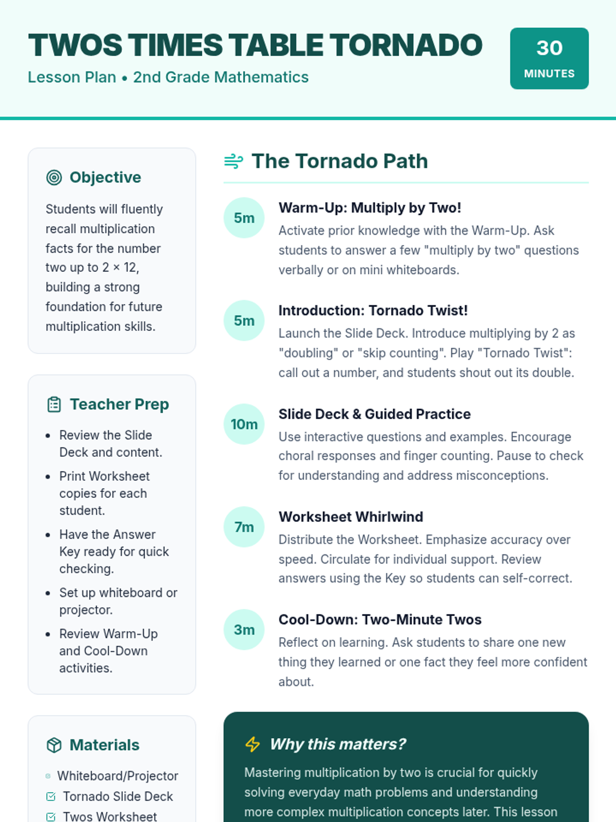 A fast-paced, engaging 30-minute lesson for 2nd graders to master their 2s times tables through 'doubling' and skip counting, featuring a 'tornado' theme to build fluency.
