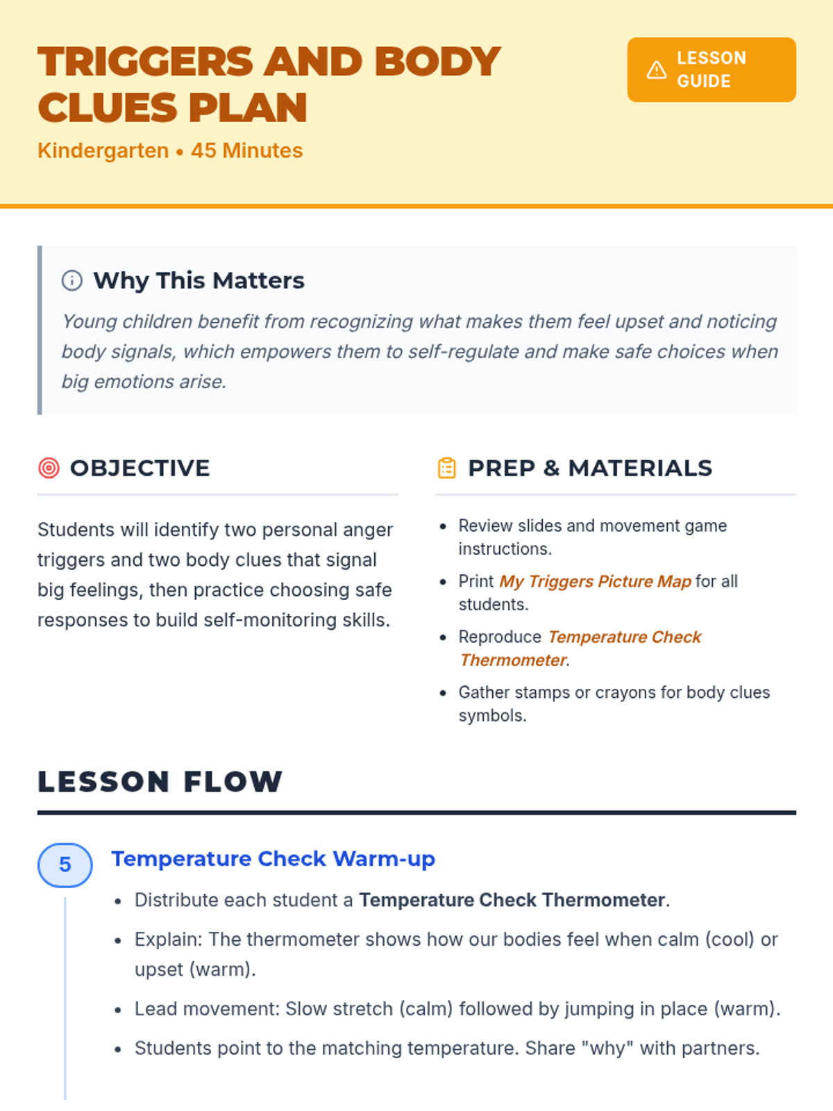A 45-minute Kindergarten lesson focused on identifying personal anger triggers and body clues to build self-regulation and safe-choice skills.
