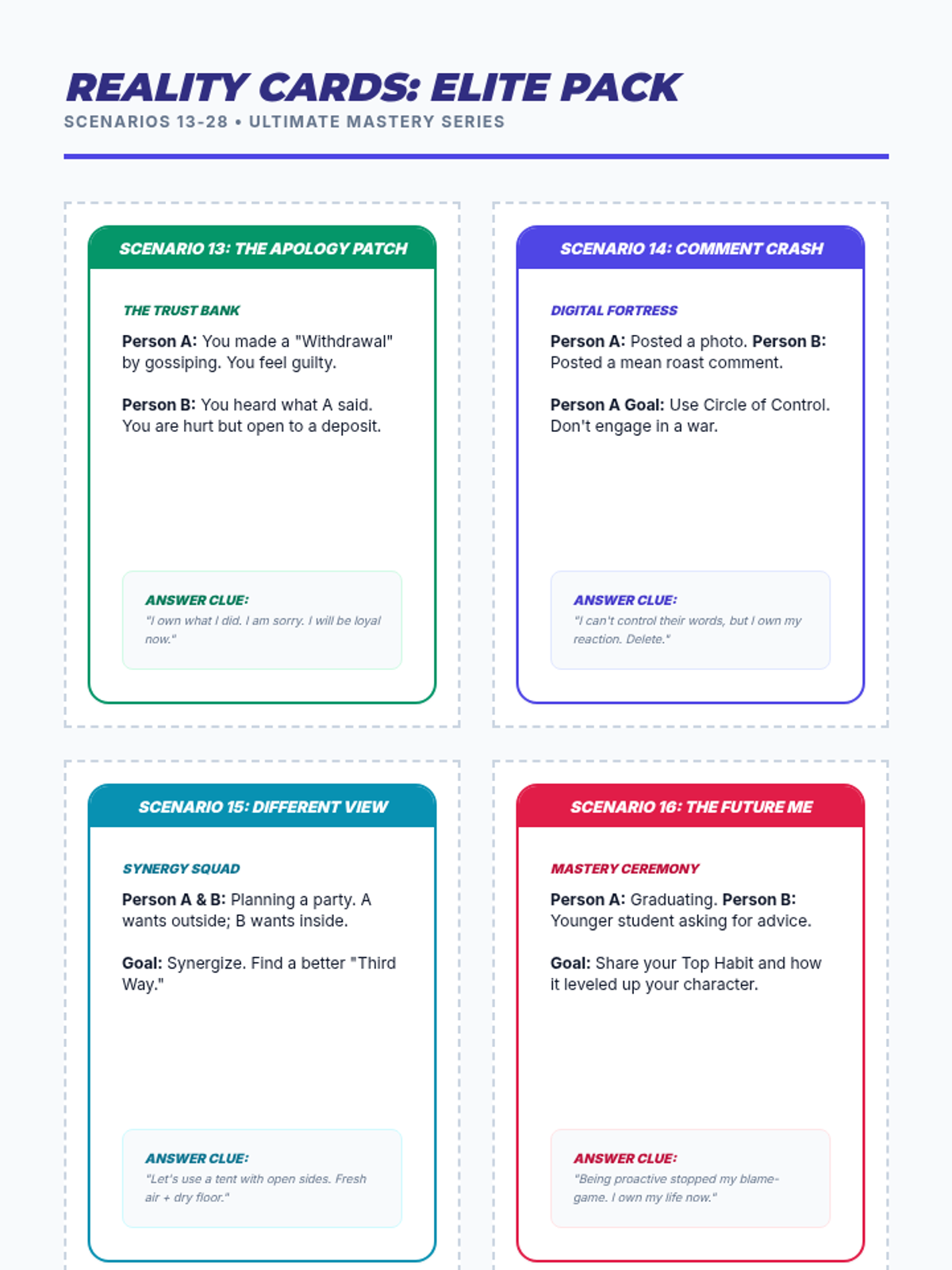 Practical team-based synergy challenges to apply collaborative problem-solving skills.