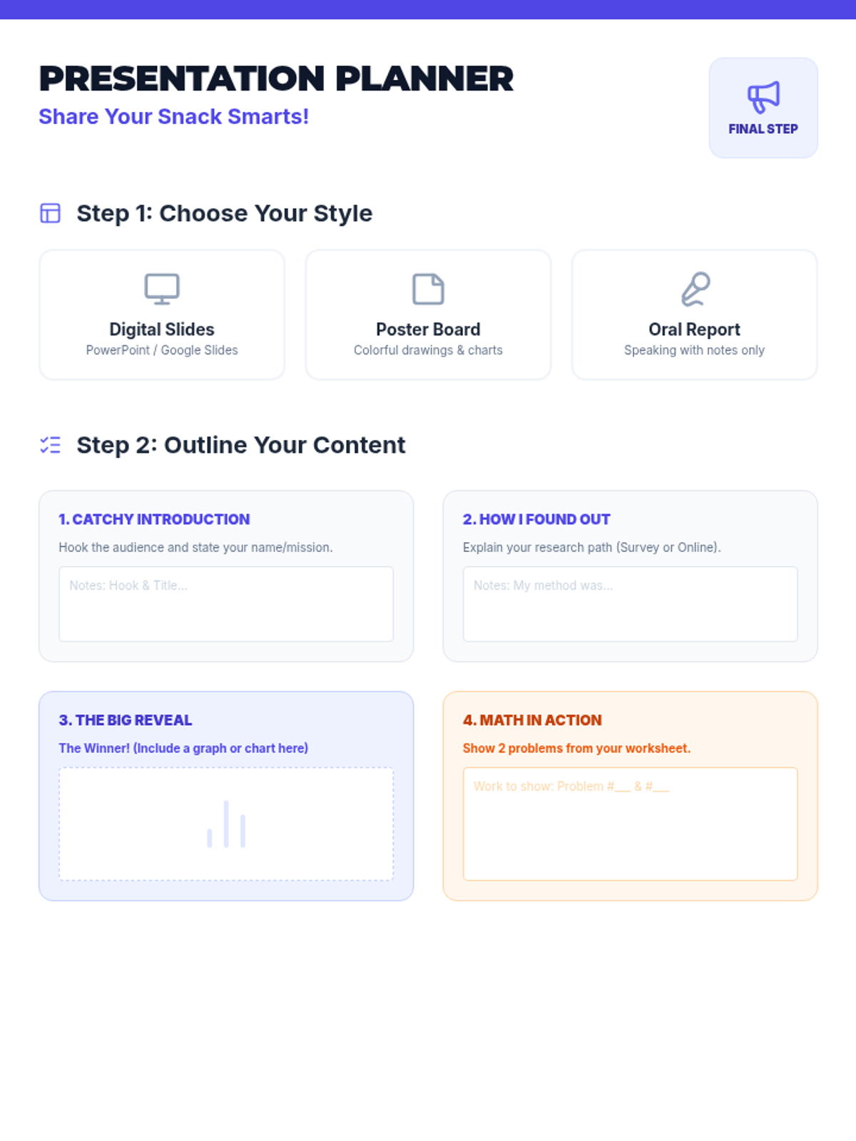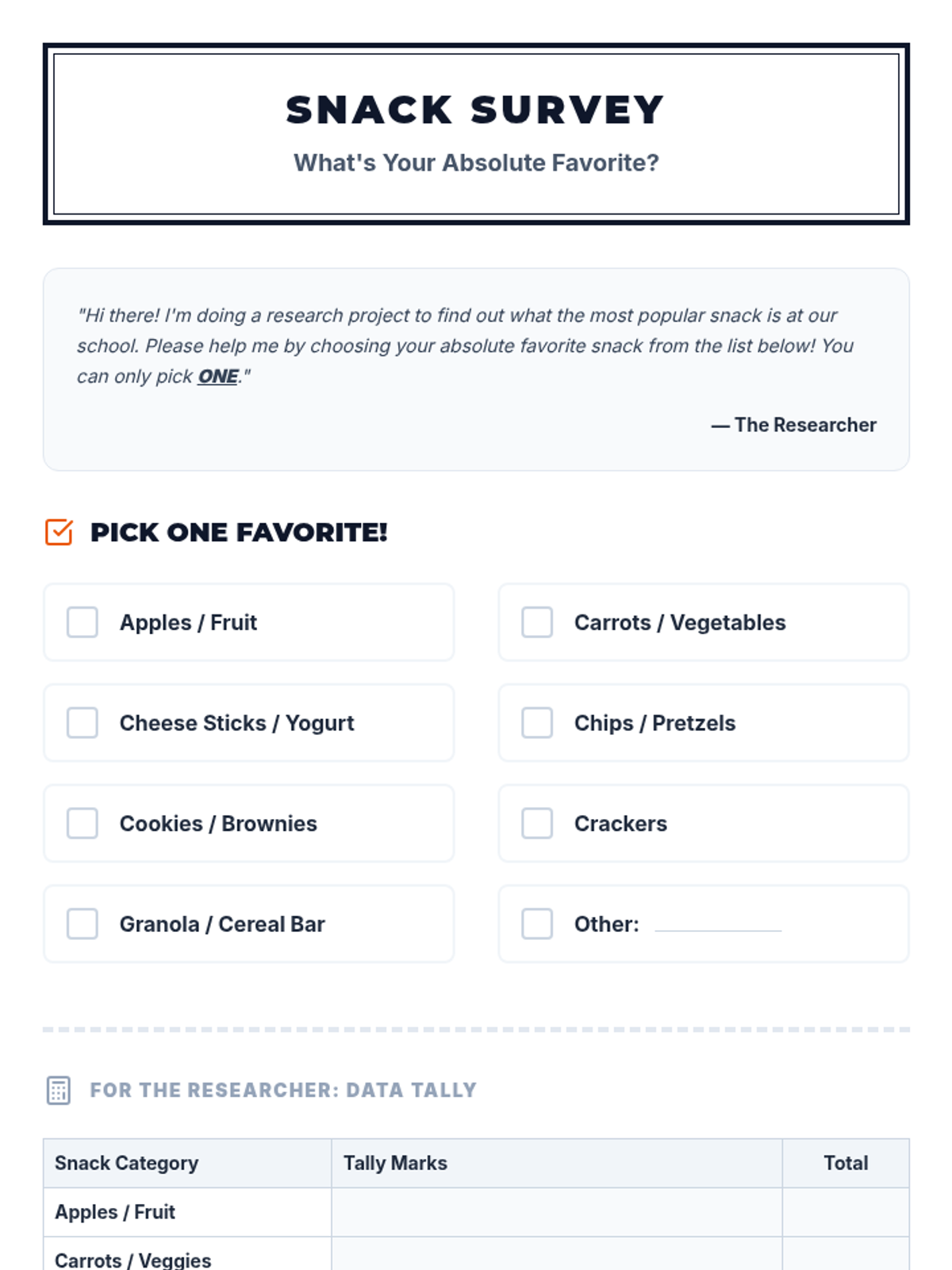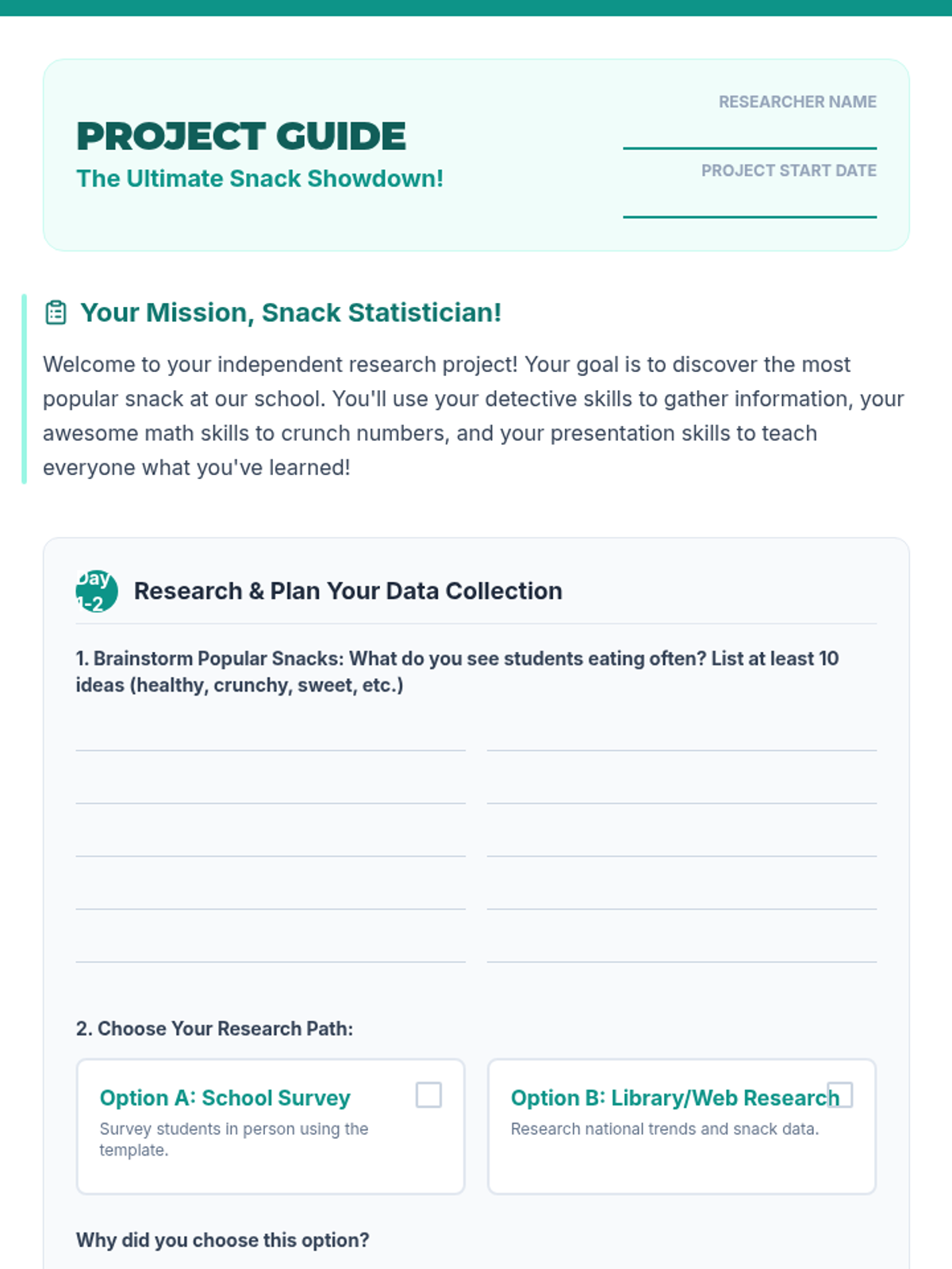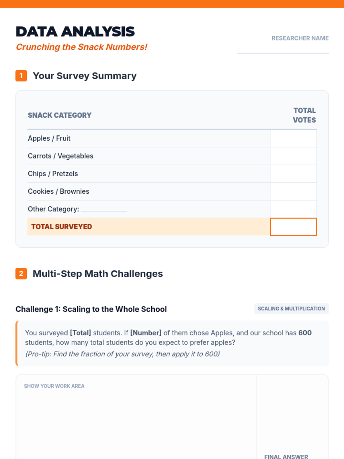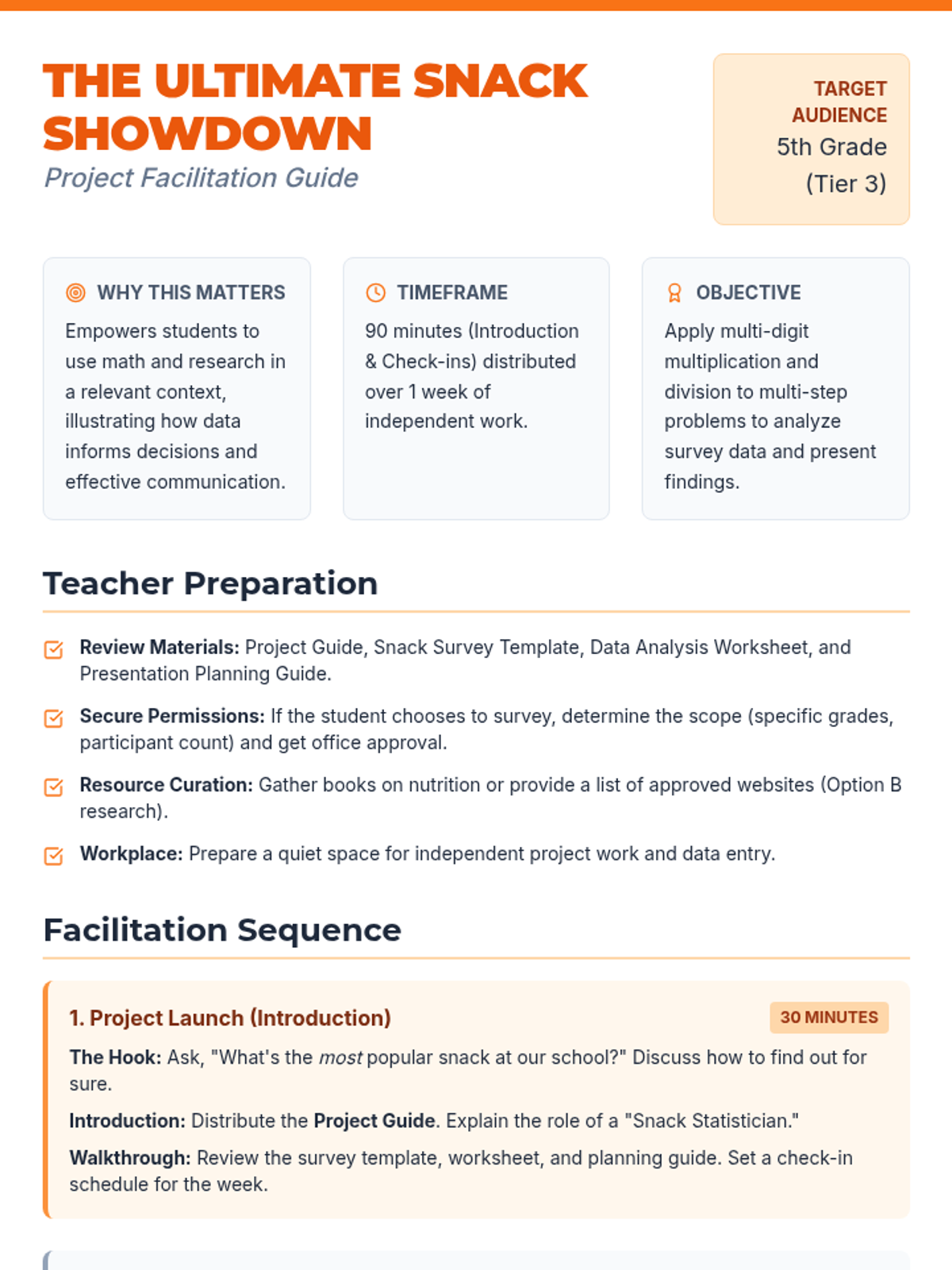 A comprehensive 5th-grade Tier 3 research project where a student investigates the most popular school snack, applying multi-digit multiplication and division to analyze real-world data and presenting their findings.
