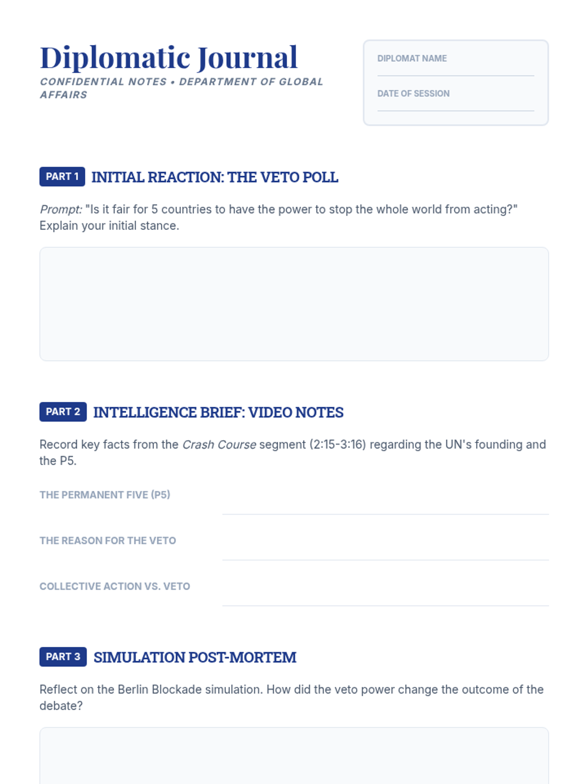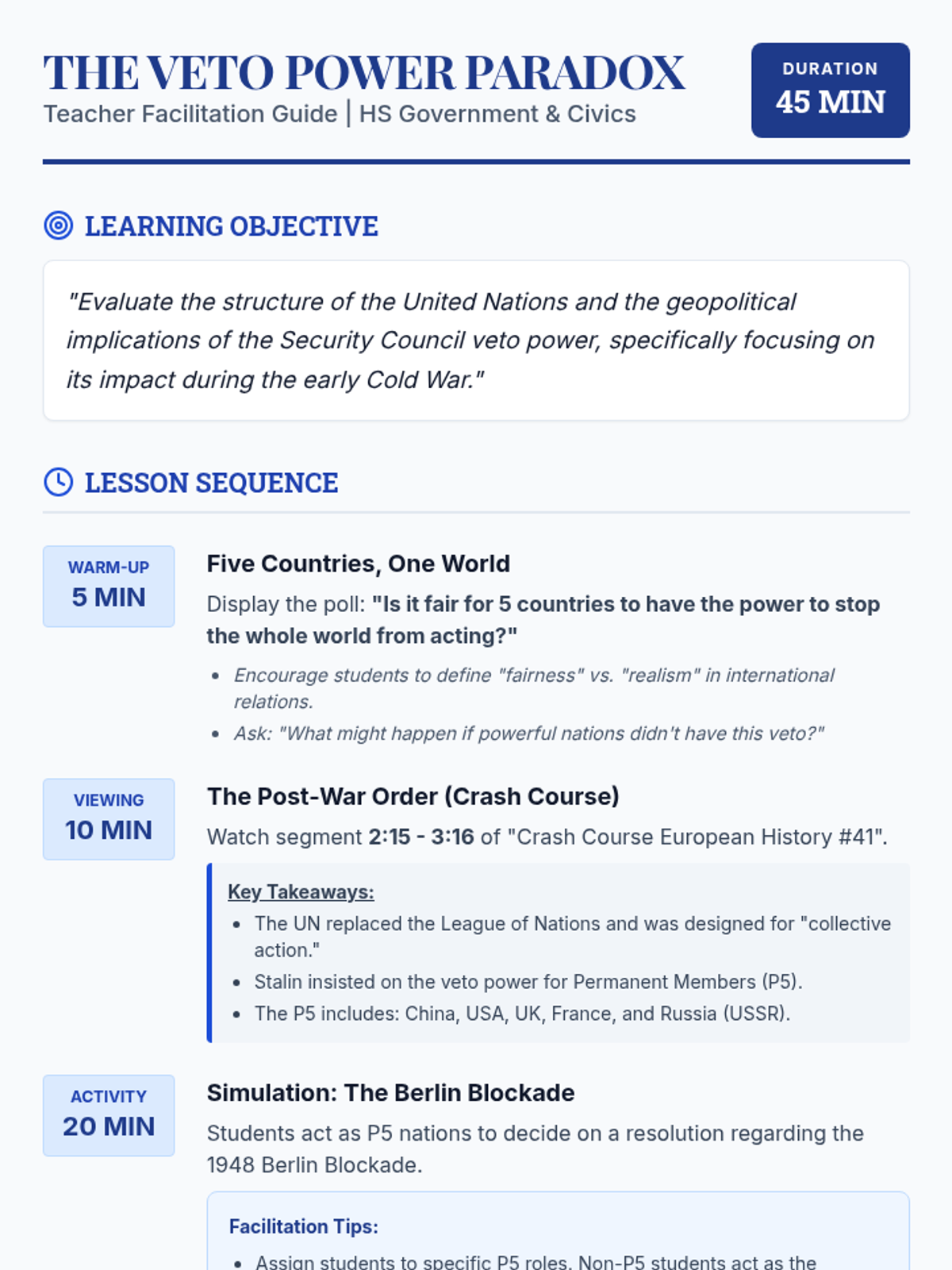 A high school civics lesson evaluating the structural power dynamics of the UN Security Council through a Cold War simulation of the Berlin Blockade. Students analyze the origins and modern implications of the P5 veto power.