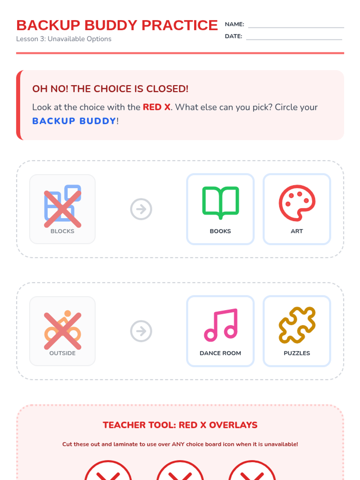 Students practice recognizing symbols for unavailable activities and learning to select a 'backup' option without distress.