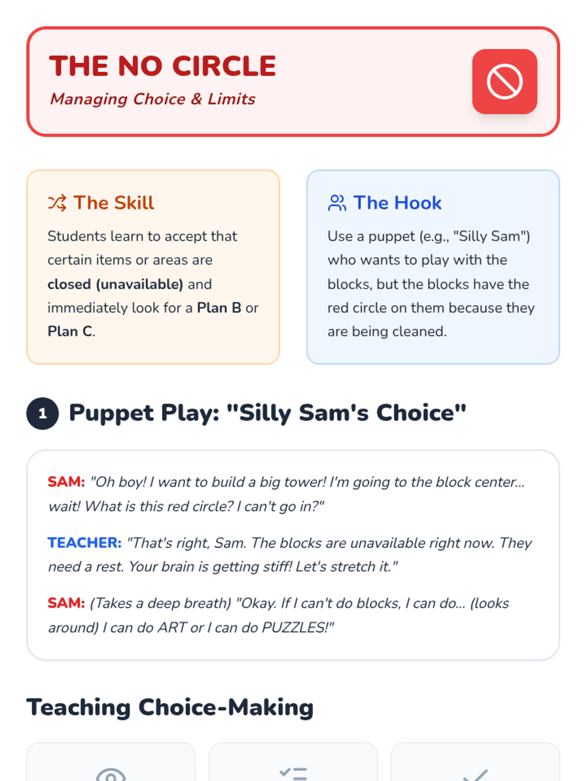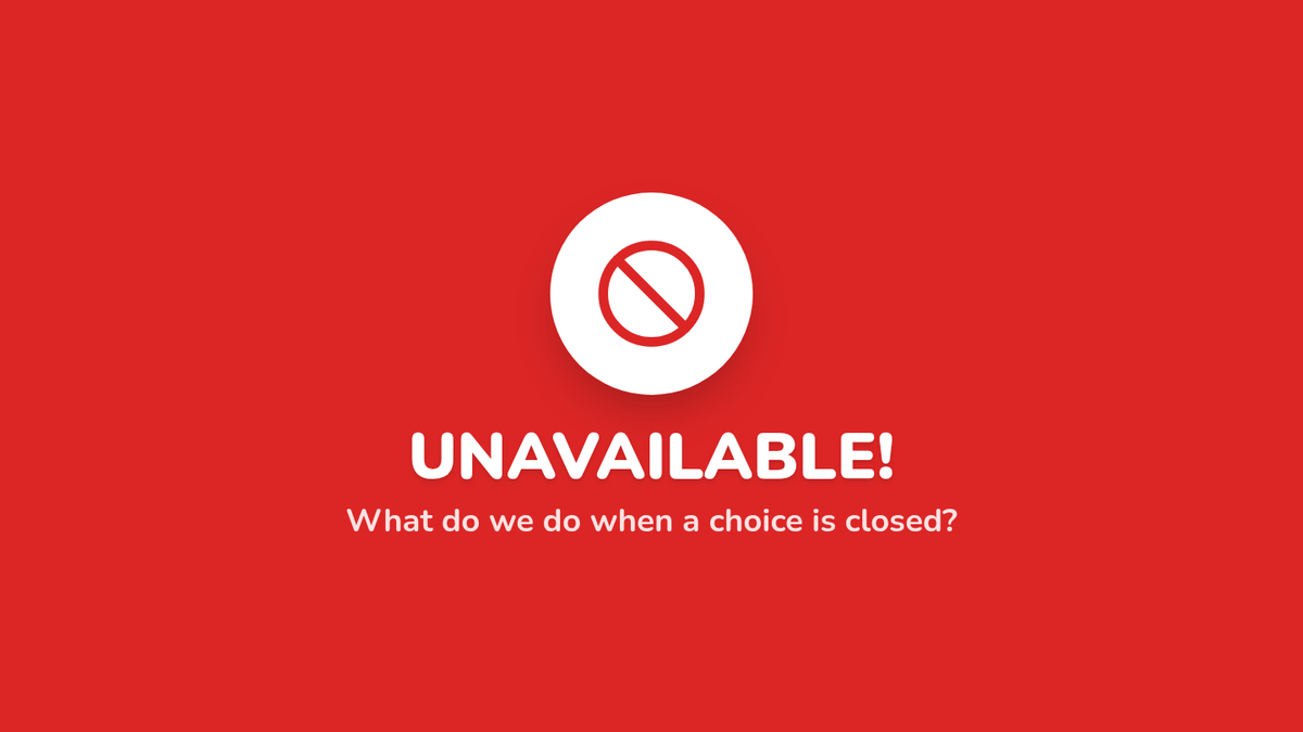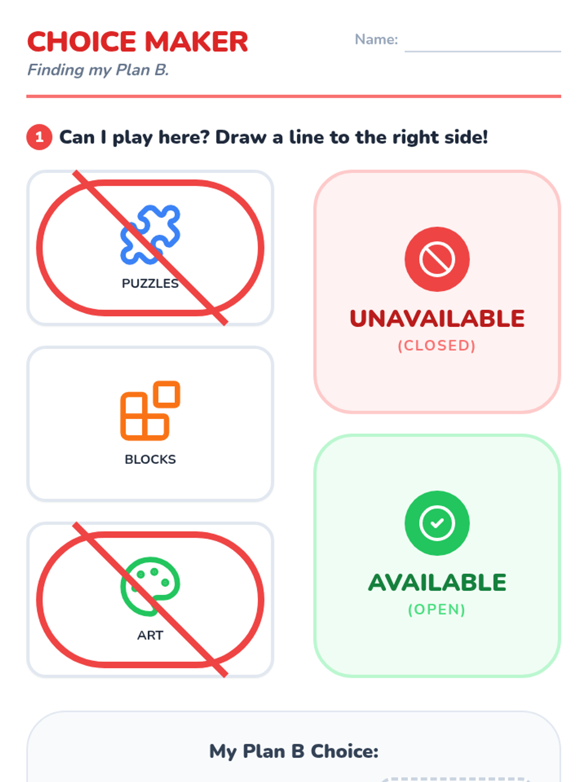 Students learn to identify 'Unavailable' symbols on choices or centers. They practice selecting two alternative activities instead of fixating on a closed option.