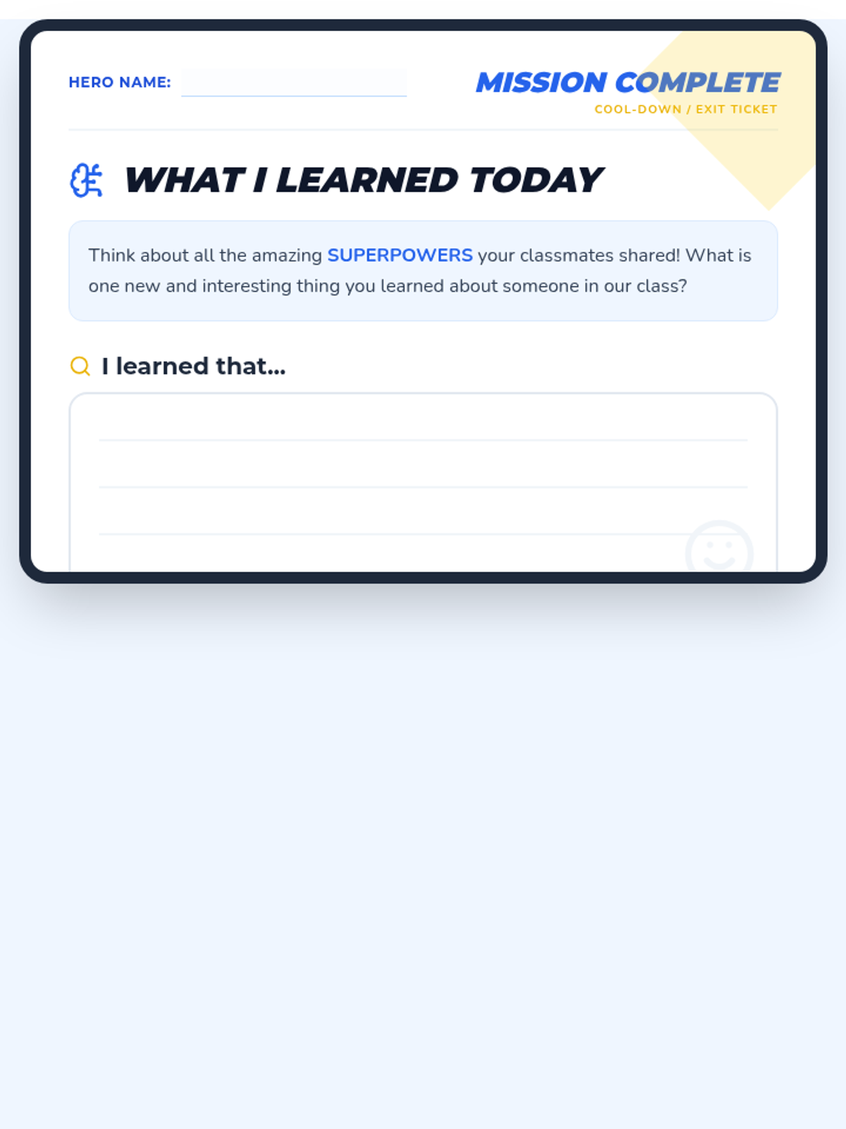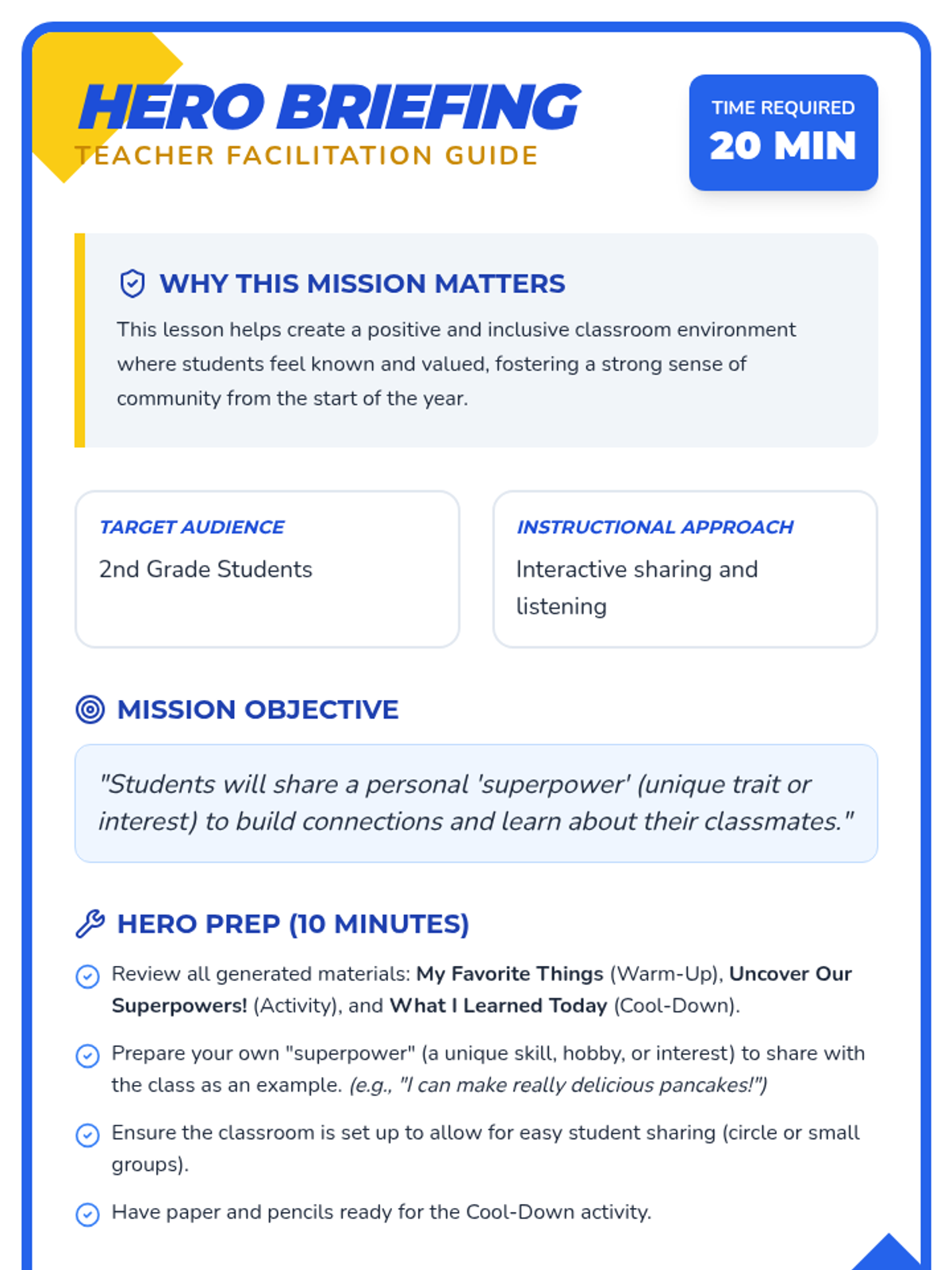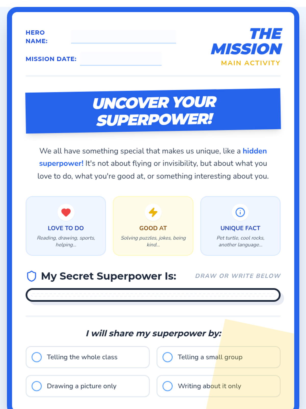 A 20-minute community-building lesson for 2nd graders to discover their classmates' unique 'superpowers' through sharing and reflection.