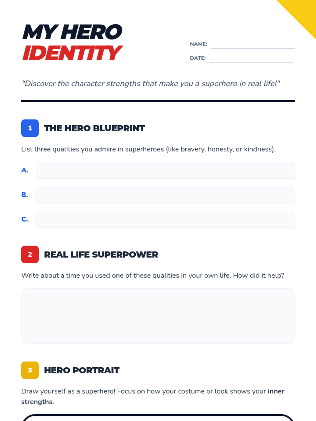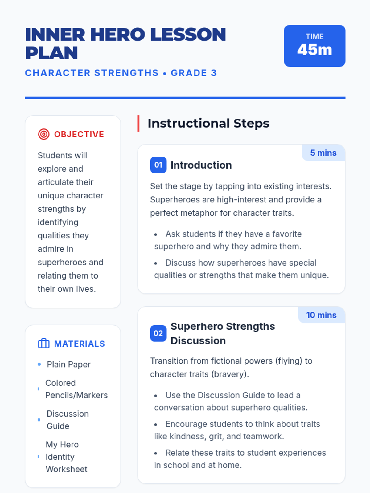 A lesson for 3rd-grade students to identify and celebrate their personal character strengths by exploring the qualities of superheroes and applying them to their own lives through creative arts and storytelling.