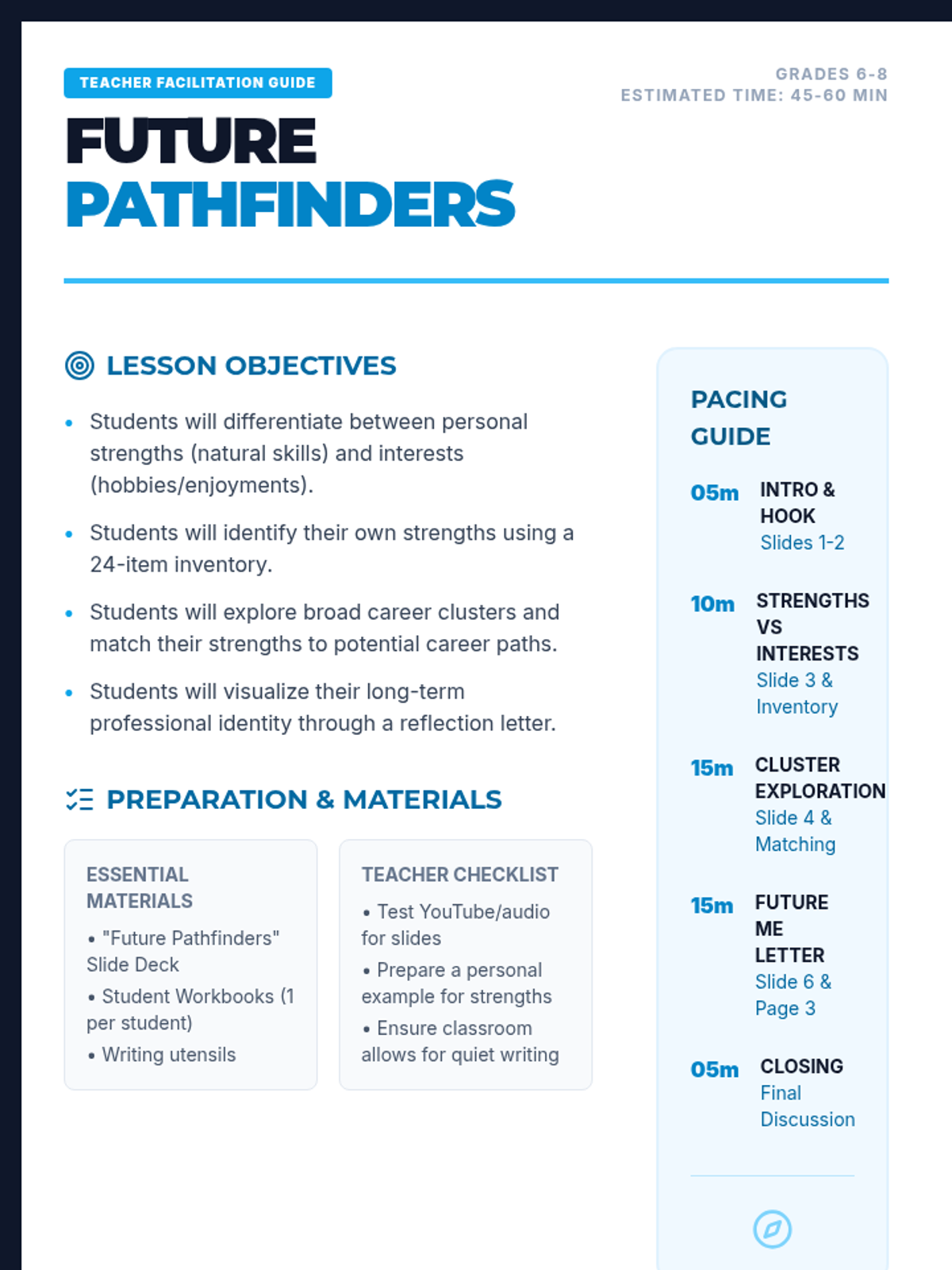 A comprehensive career exploration lesson for middle schoolers to discover their personal strengths, explore career clusters, and visualize their future selves.