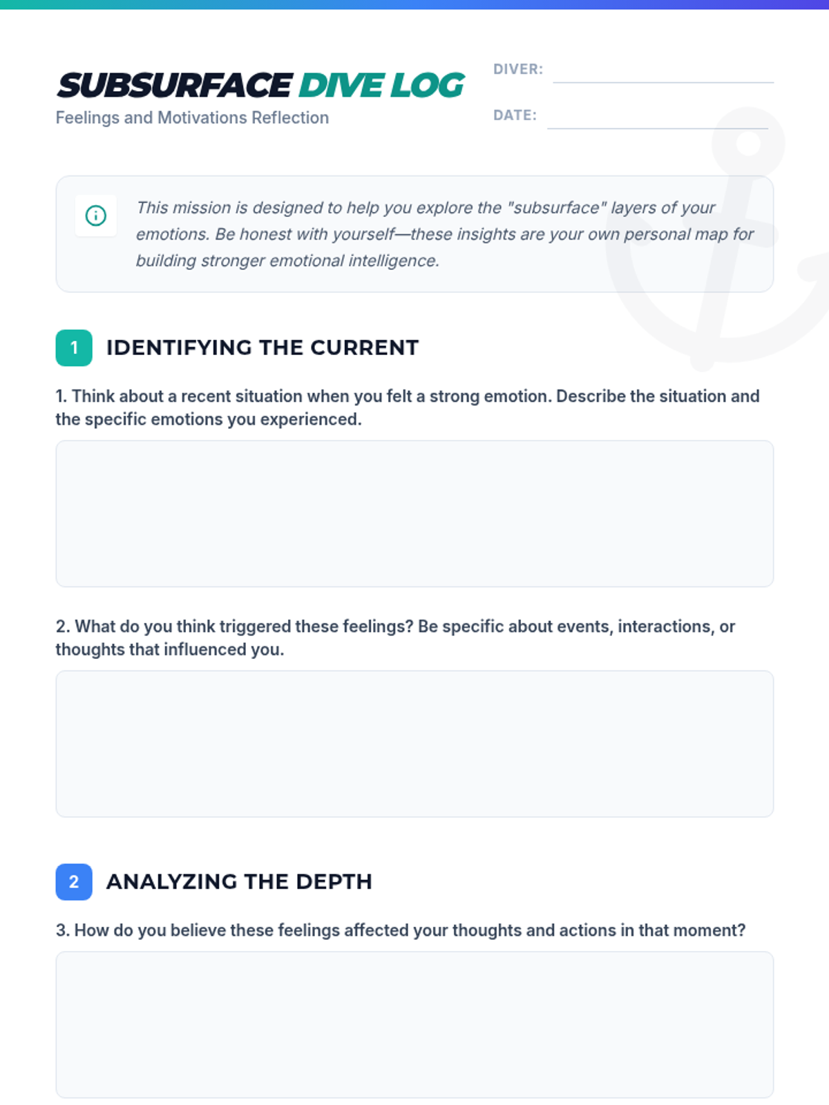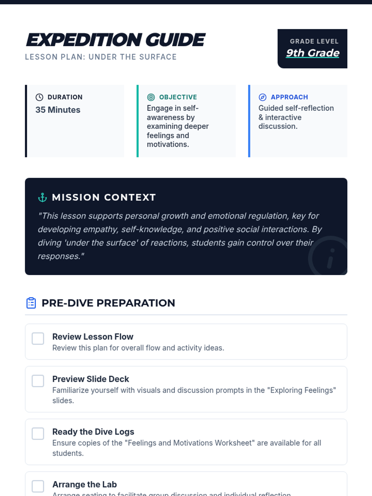 A lesson designed for 9th-grade students to explore their deeper feelings, motivations, and triggers through guided self-reflection and the metaphor of diving 'under the surface'. Students will build emotional intelligence by identifying patterns in their reactions and developing positive coping strategies.