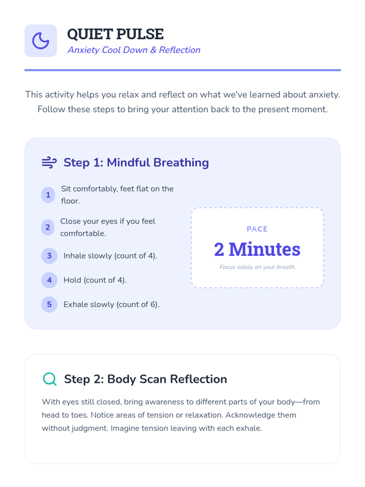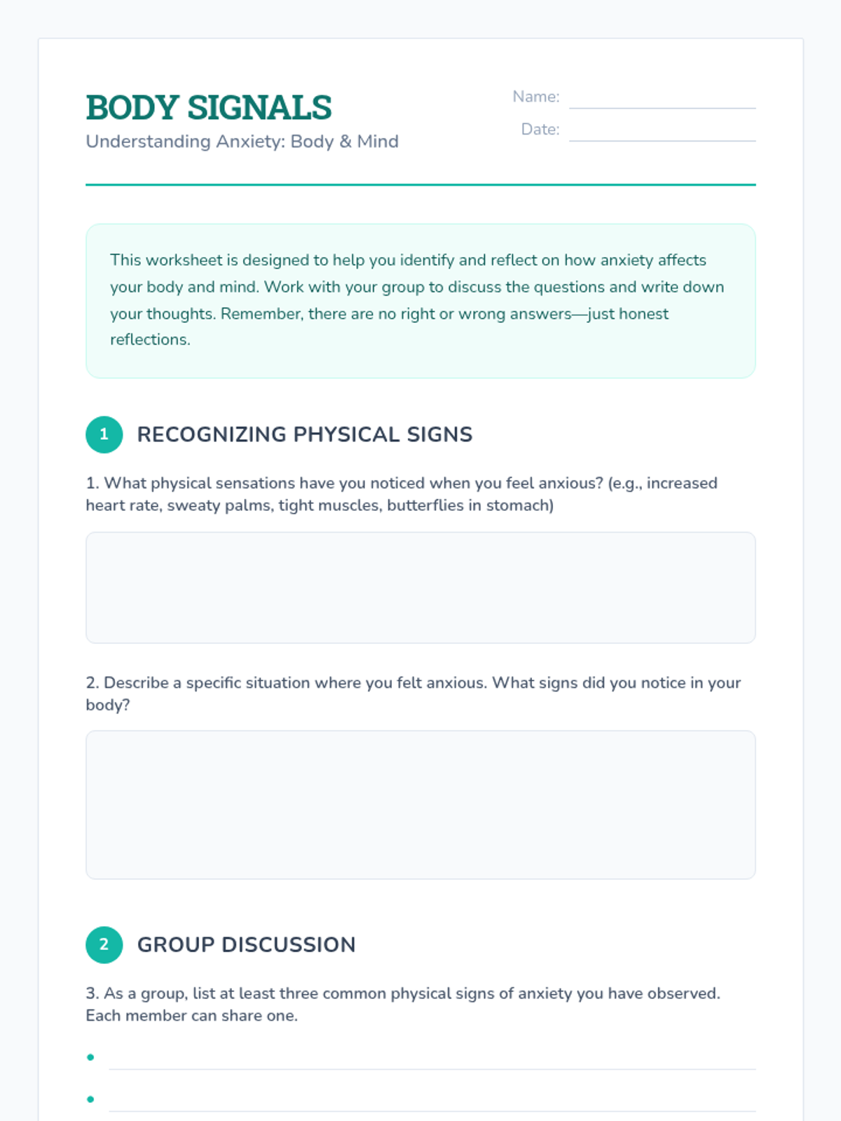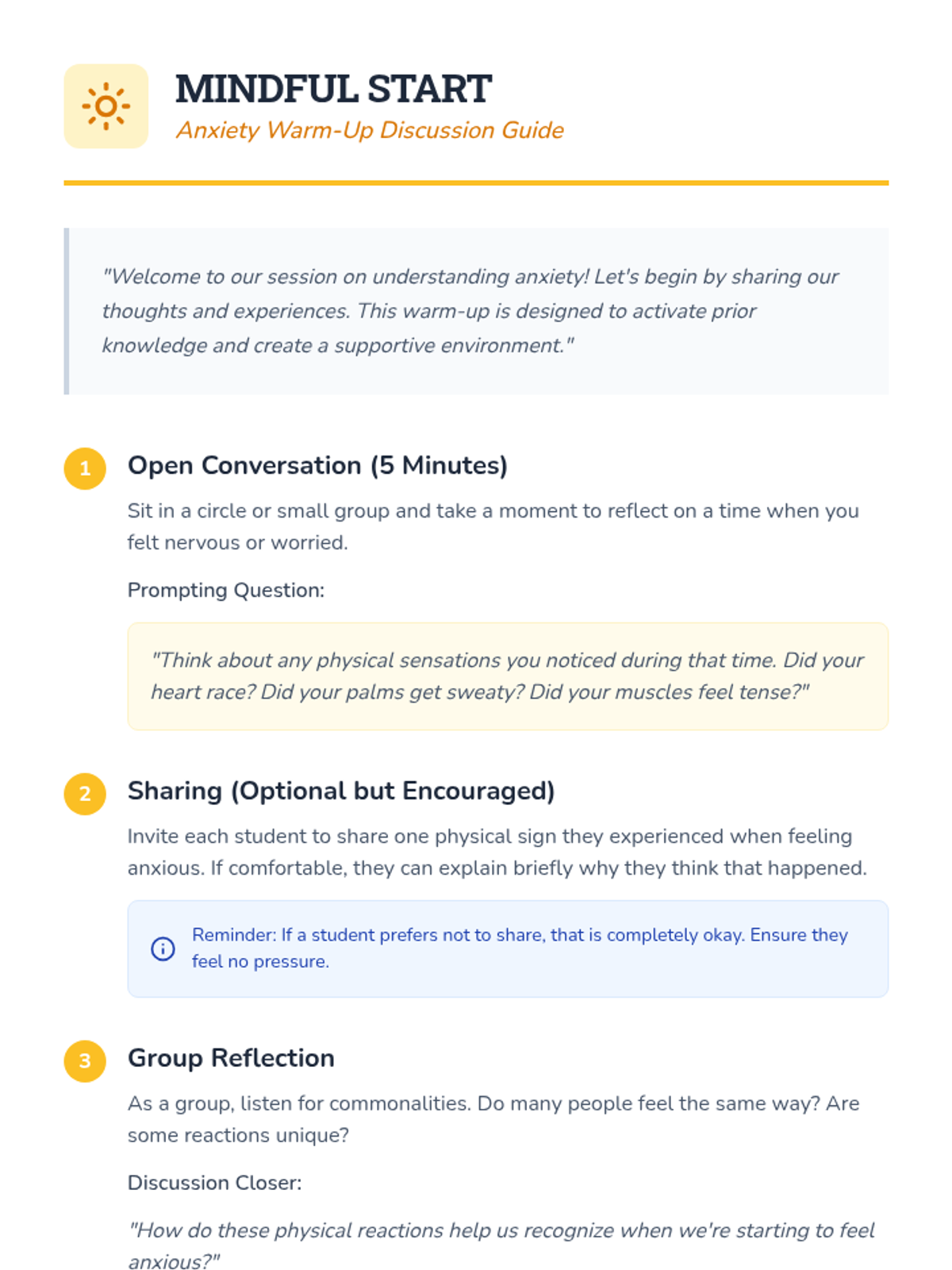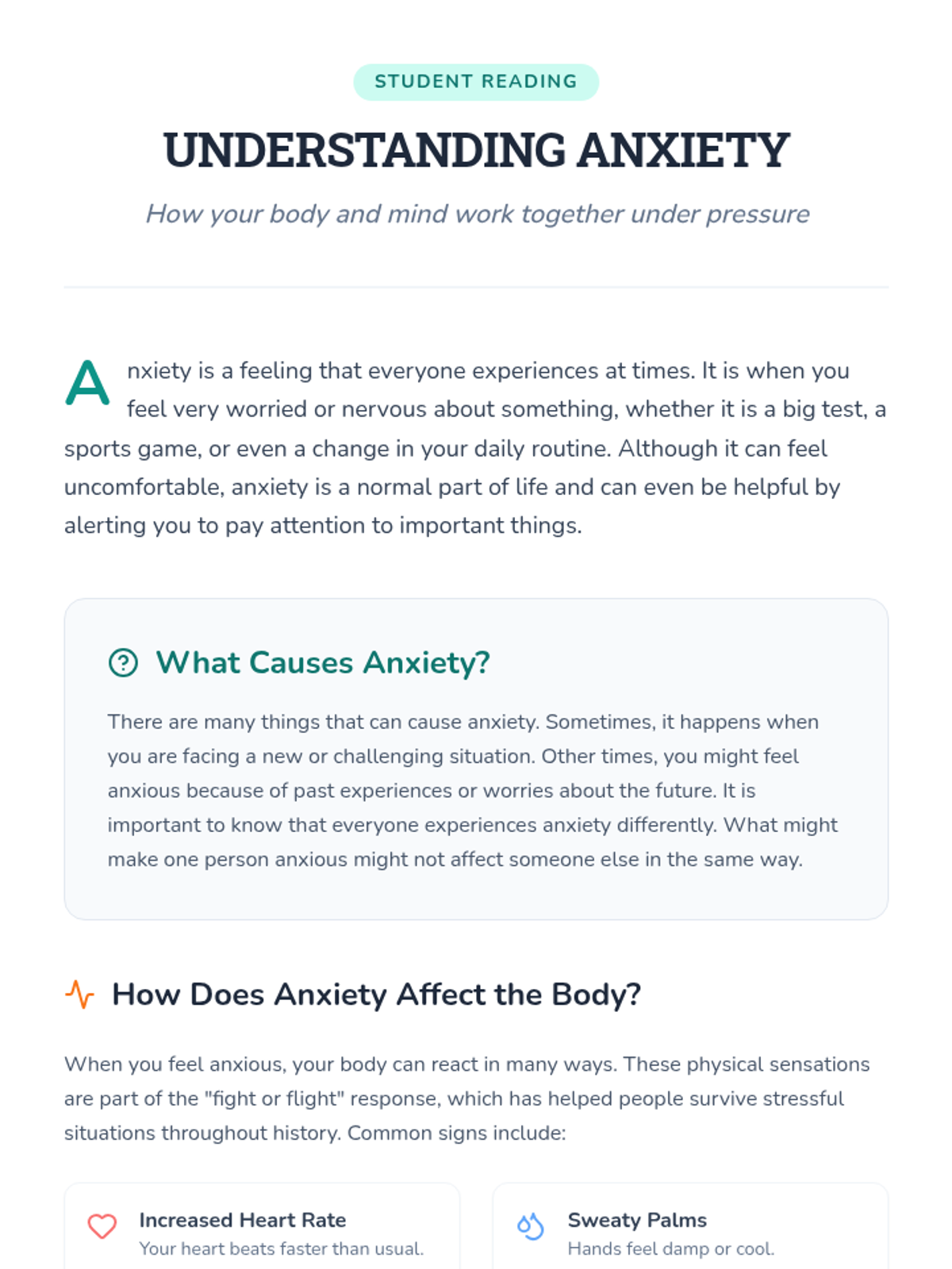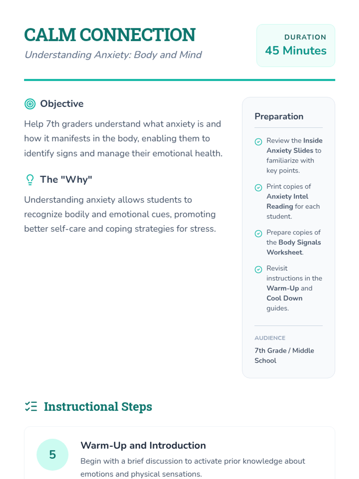 A 45-minute small group lesson for 7th graders focused on identifying the physical and mental signs of anxiety and developing basic coping strategies.