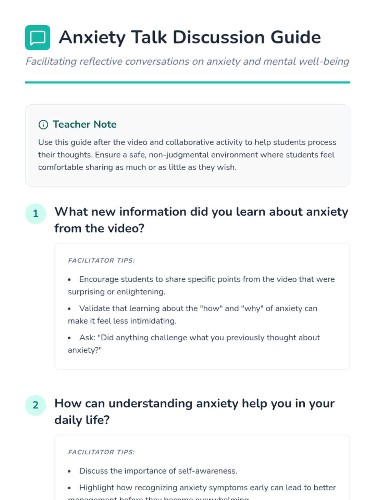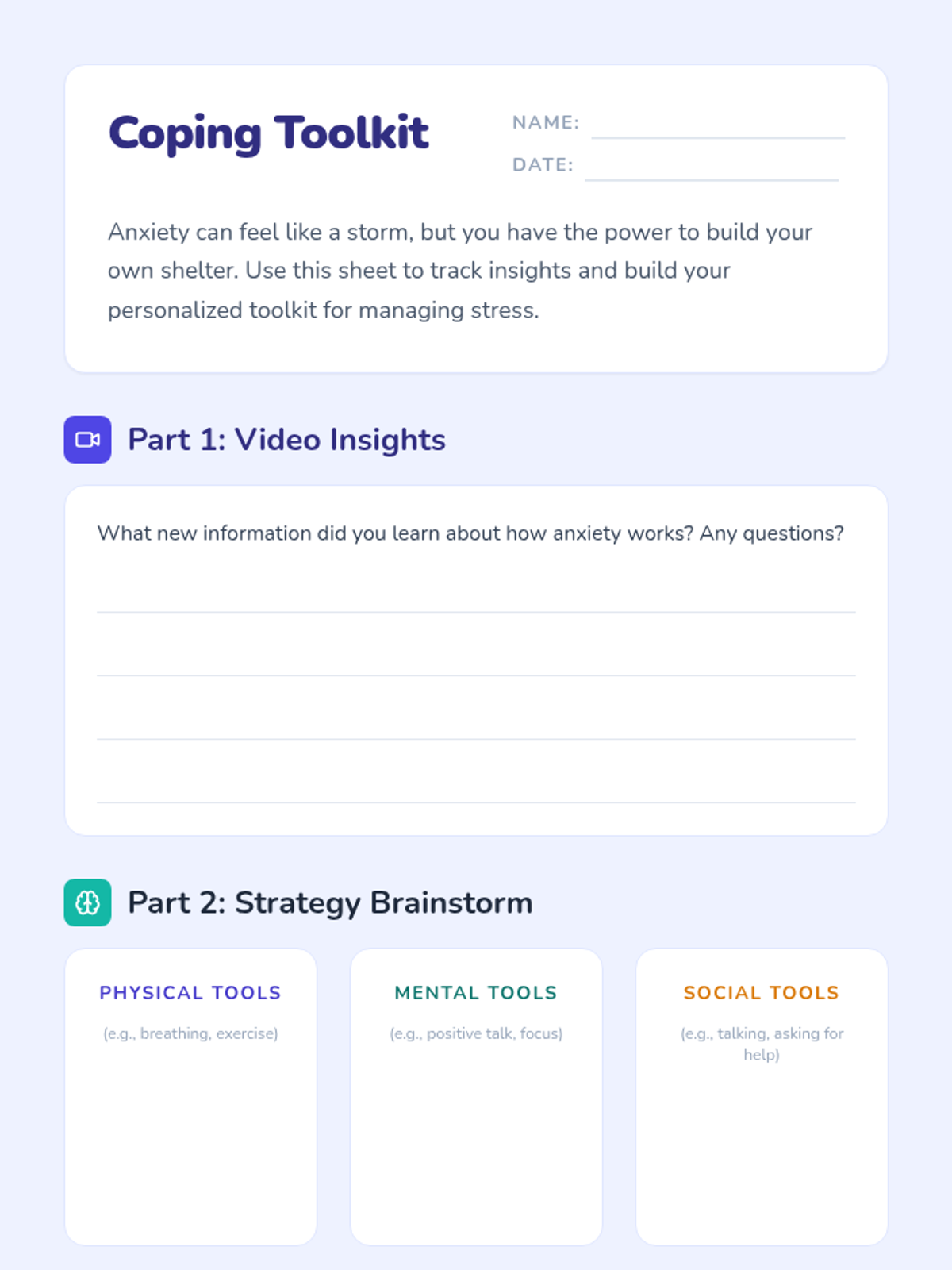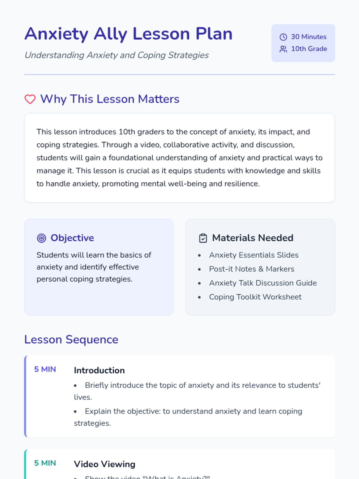 A 30-minute introductory lesson for 10th graders on understanding anxiety and developing practical coping strategies through video, collaboration, and discussion.