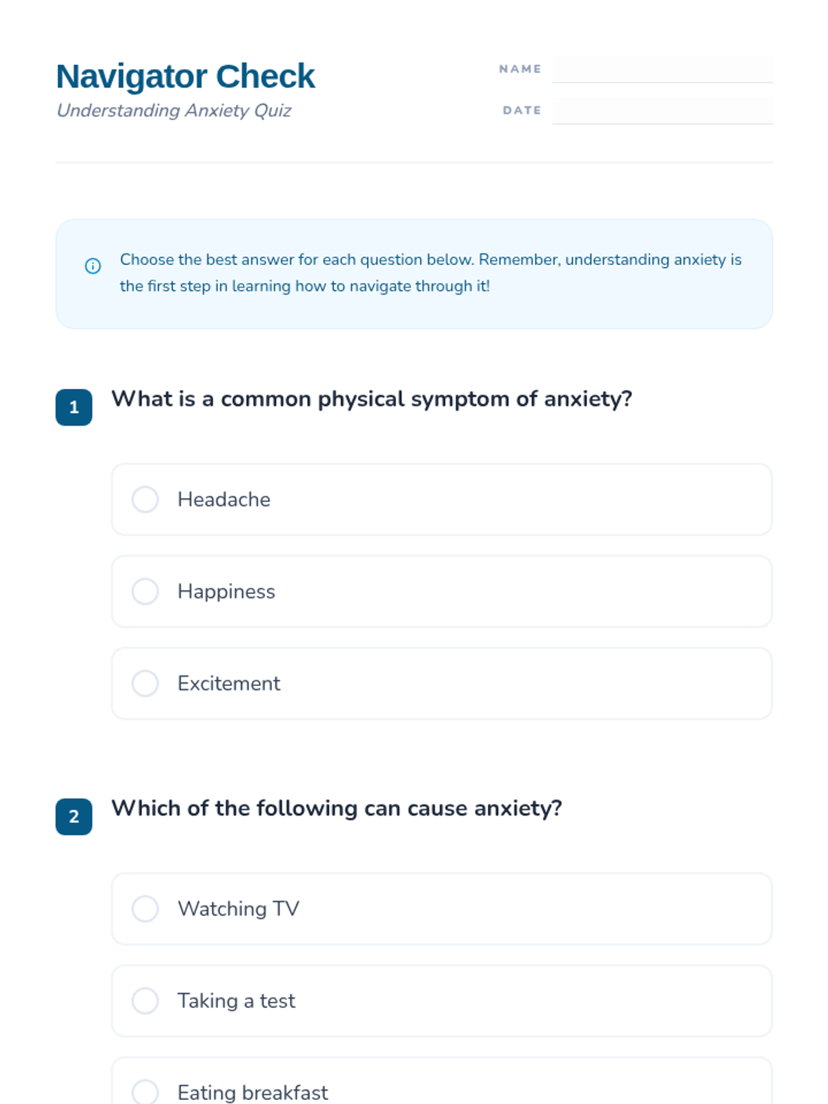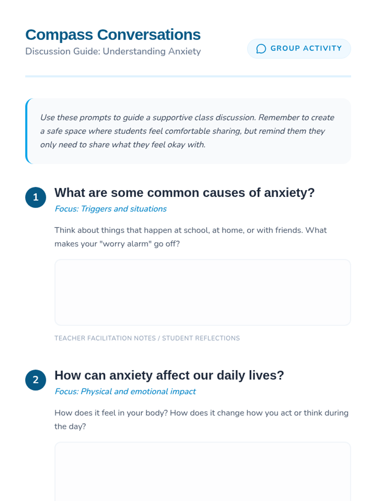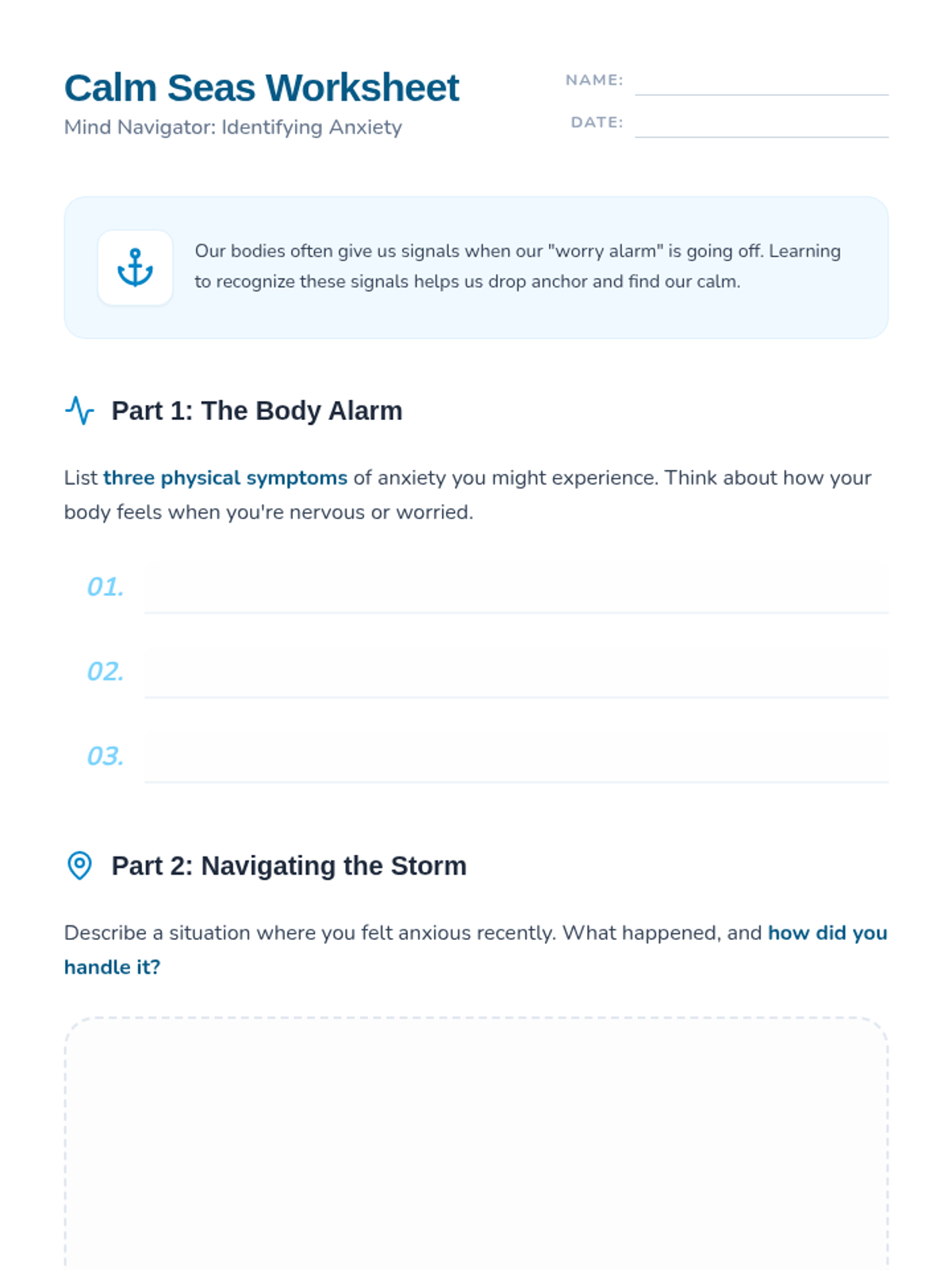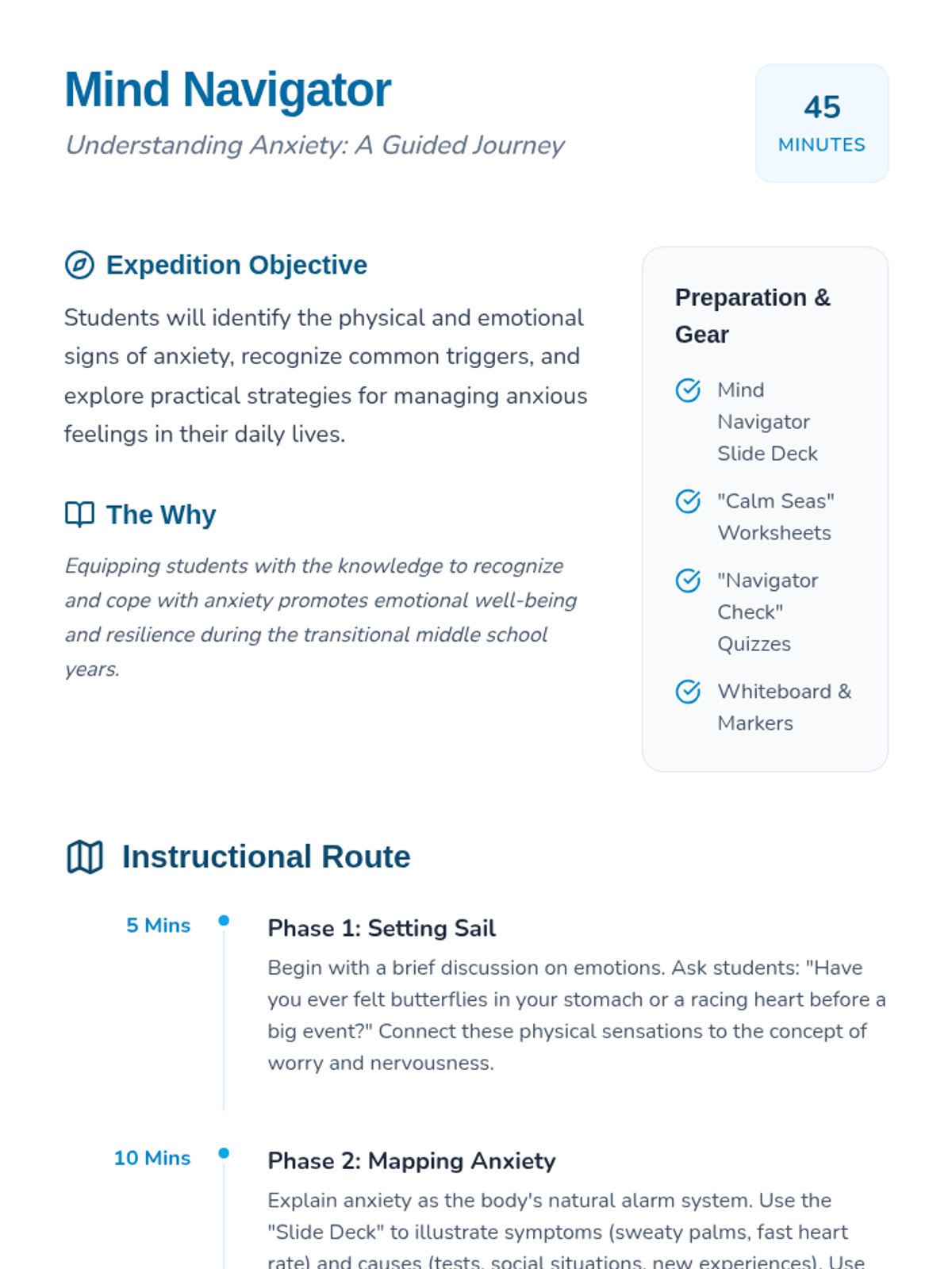 This lesson introduces 6th-grade students to anxiety, covering its causes, physical and emotional symptoms, and practical management strategies through discussion and interactive activities.