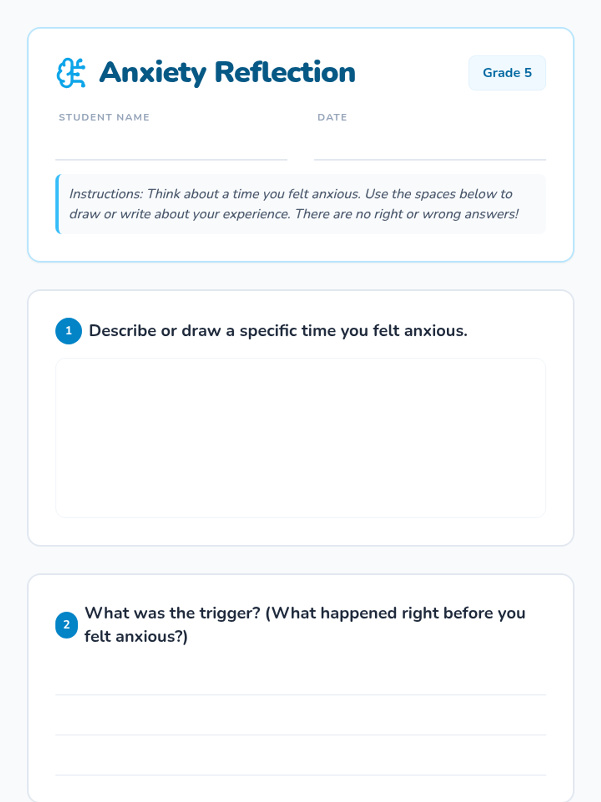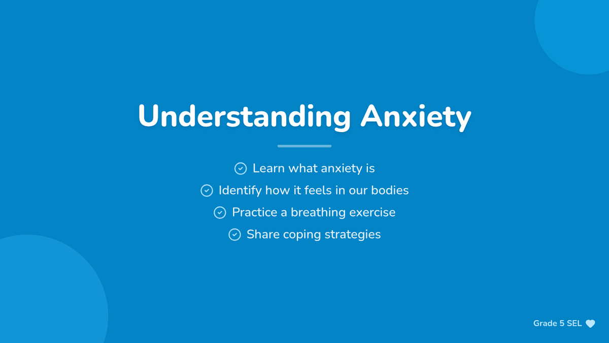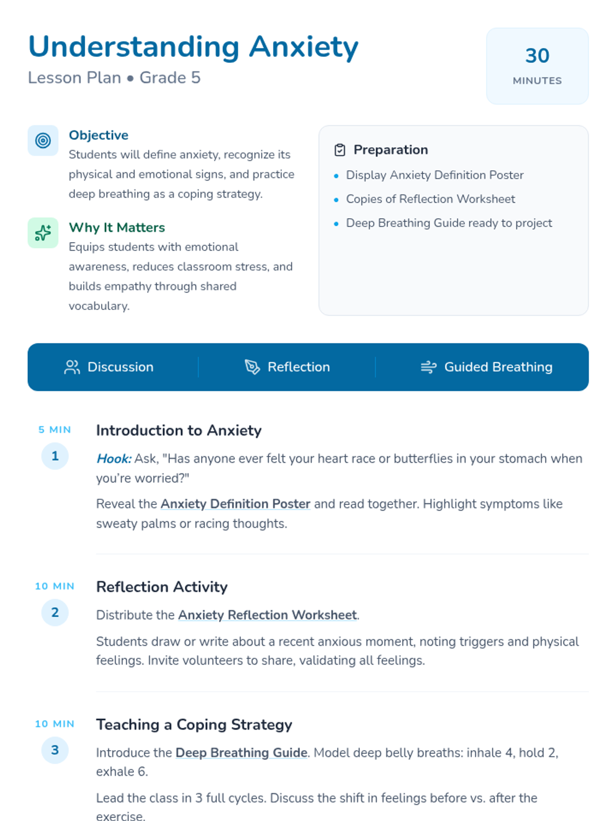 A 30-minute social-emotional lesson for 5th graders exploring the nature of anxiety, physical symptoms, and practical coping mechanisms through reflection and deep breathing exercises.