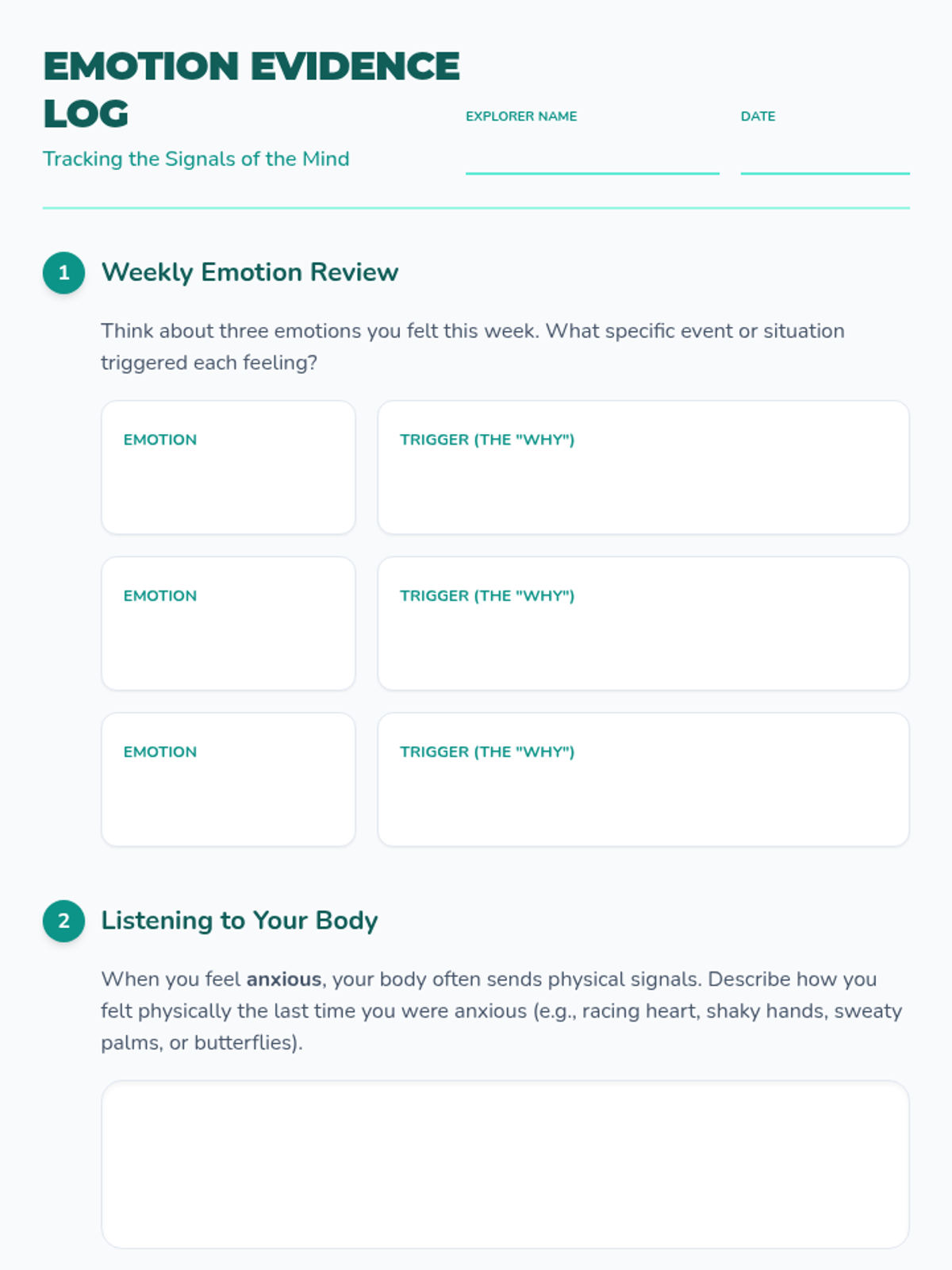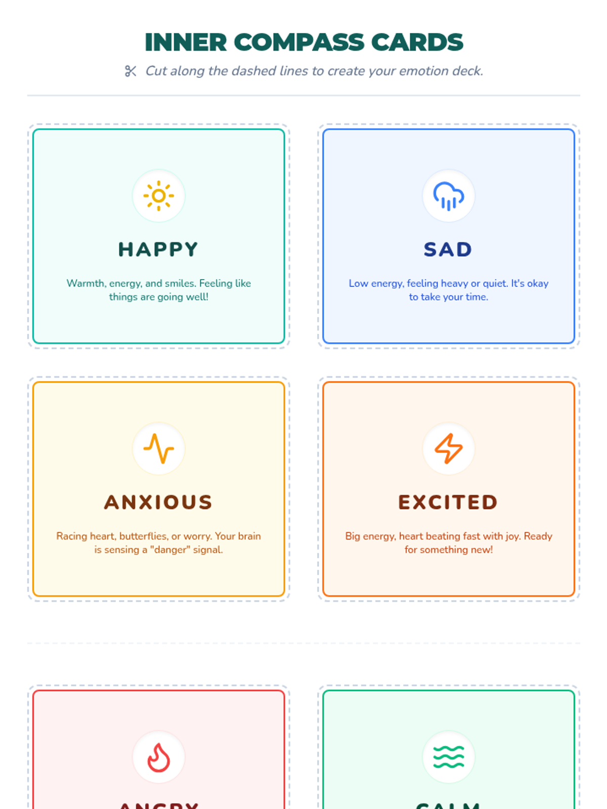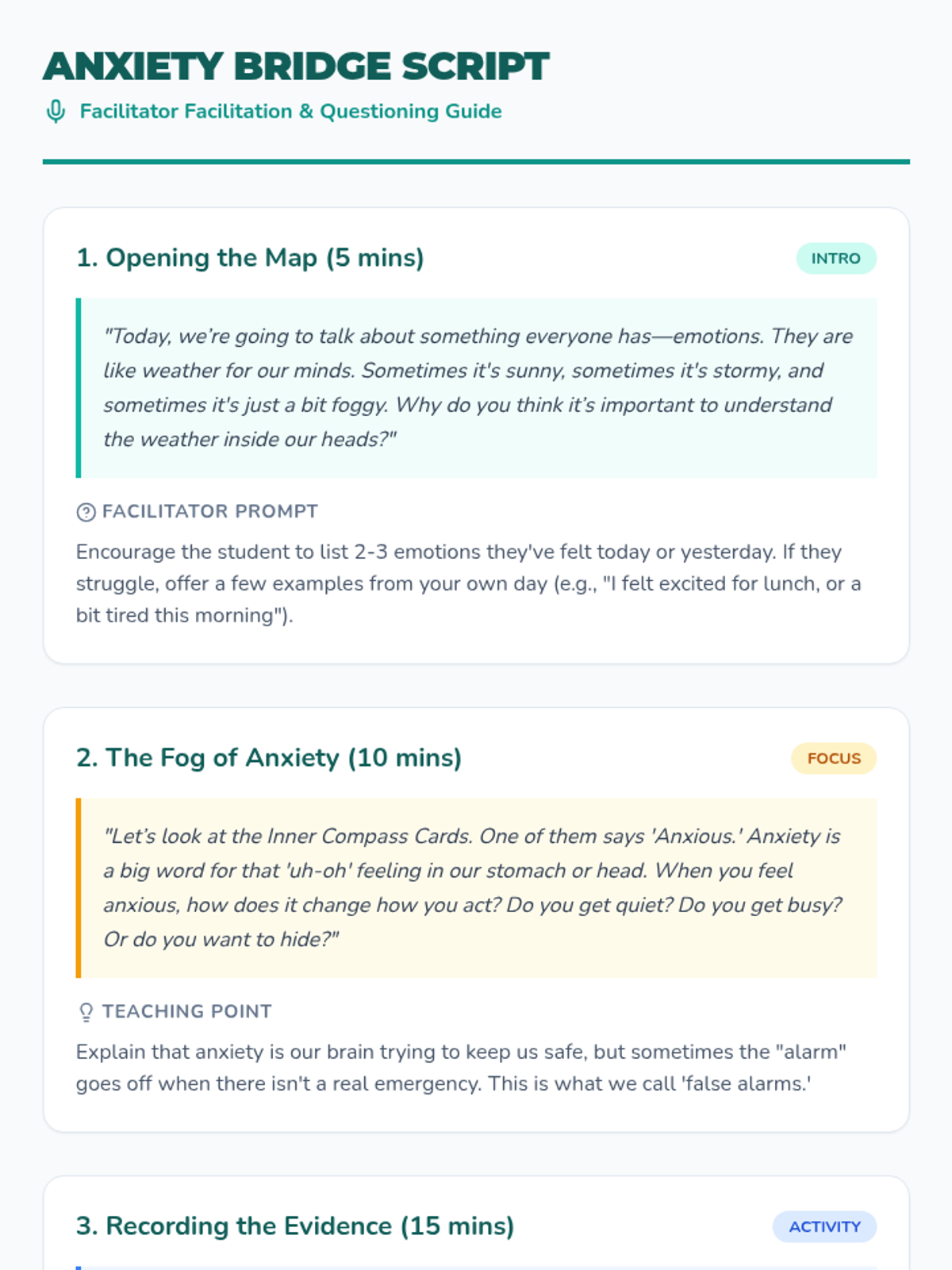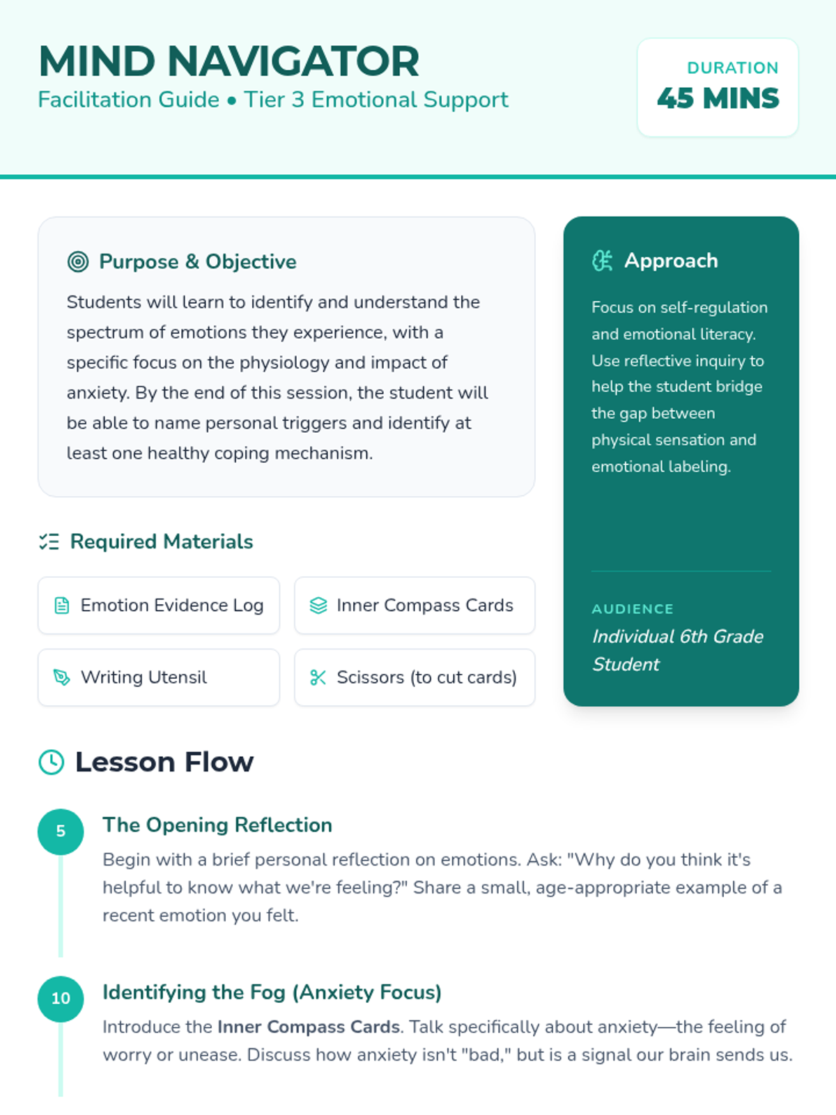 A Tier 3 individual lesson for 6th-grade students to identify emotions, specifically anxiety, and explore healthy coping mechanisms through personal reflection and interactive cards.