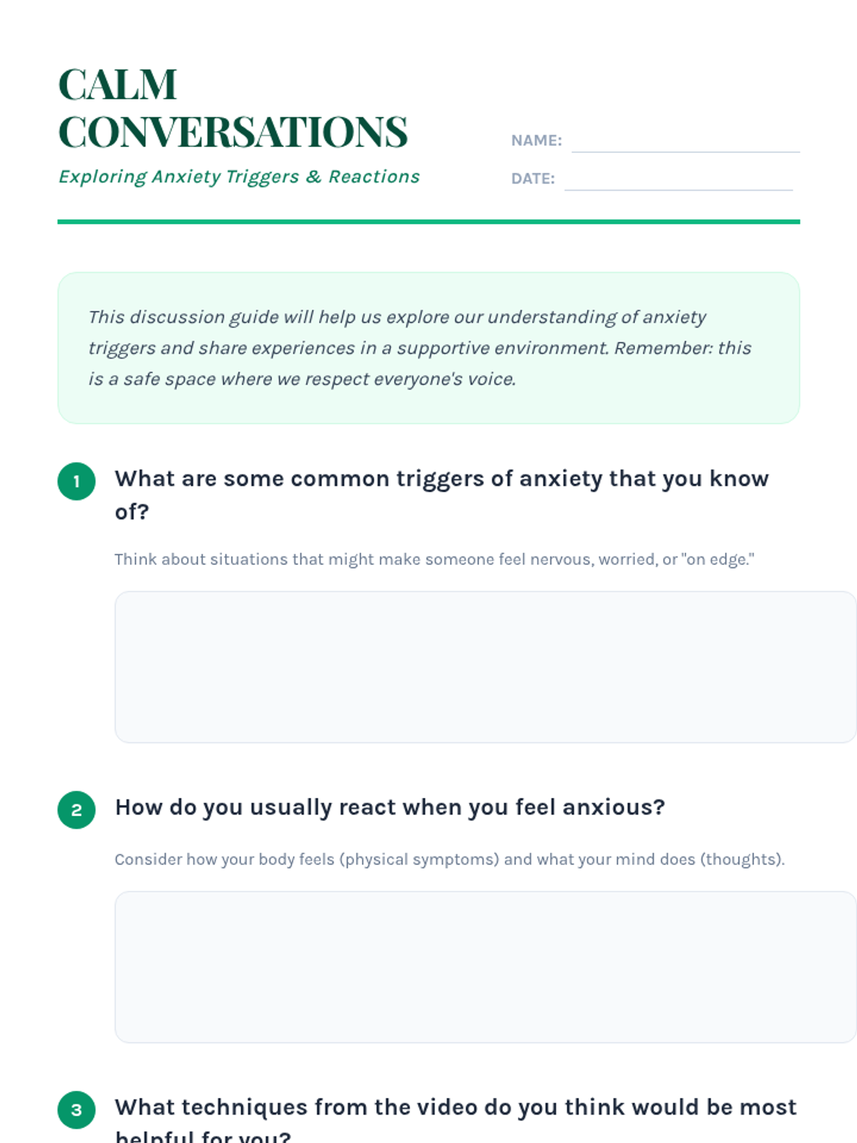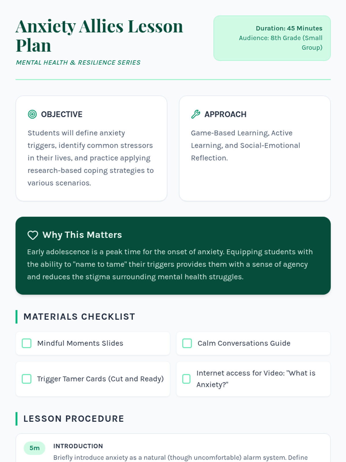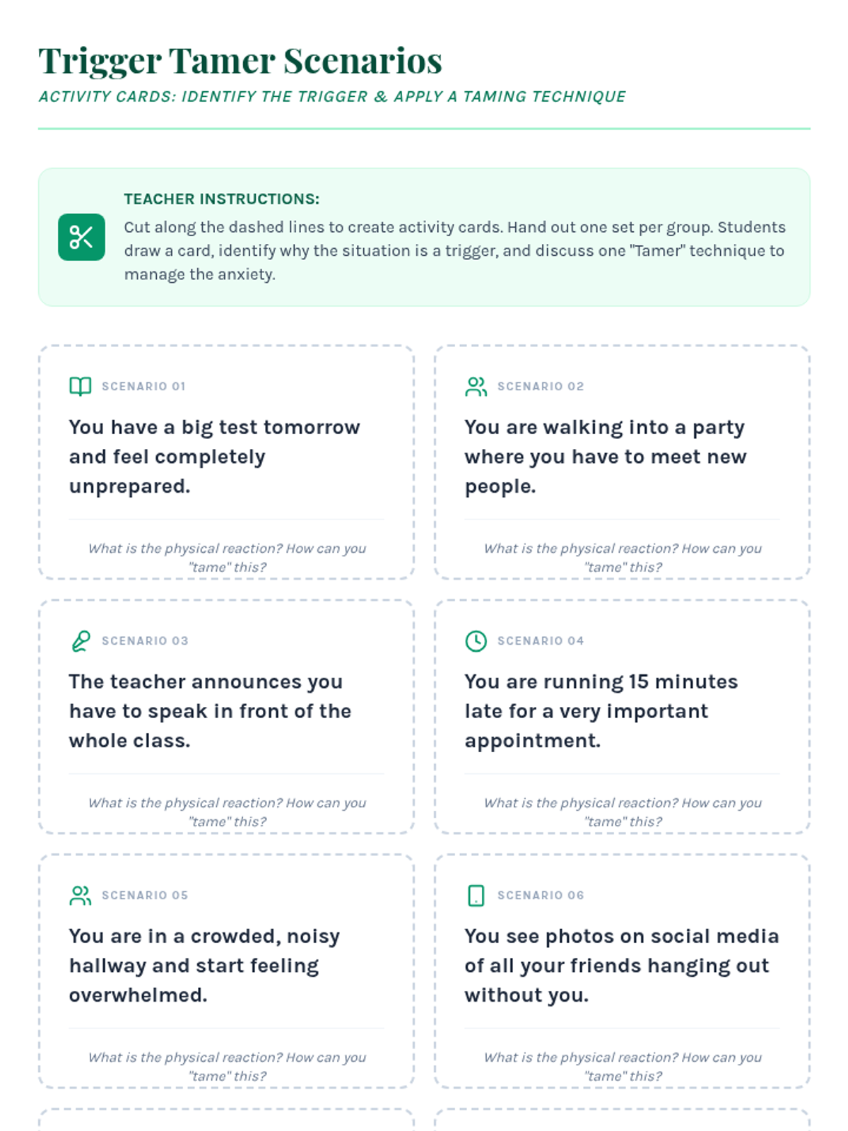 Students will explore the concept of anxiety triggers and learn practical techniques to manage anxiety through discussion, video, and a scenario-based card game. This lesson equips 8th graders with the tools to identify stressors and build mental resilience.