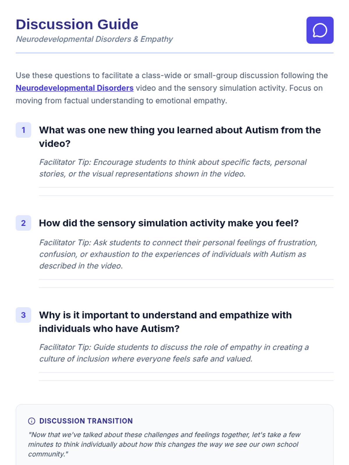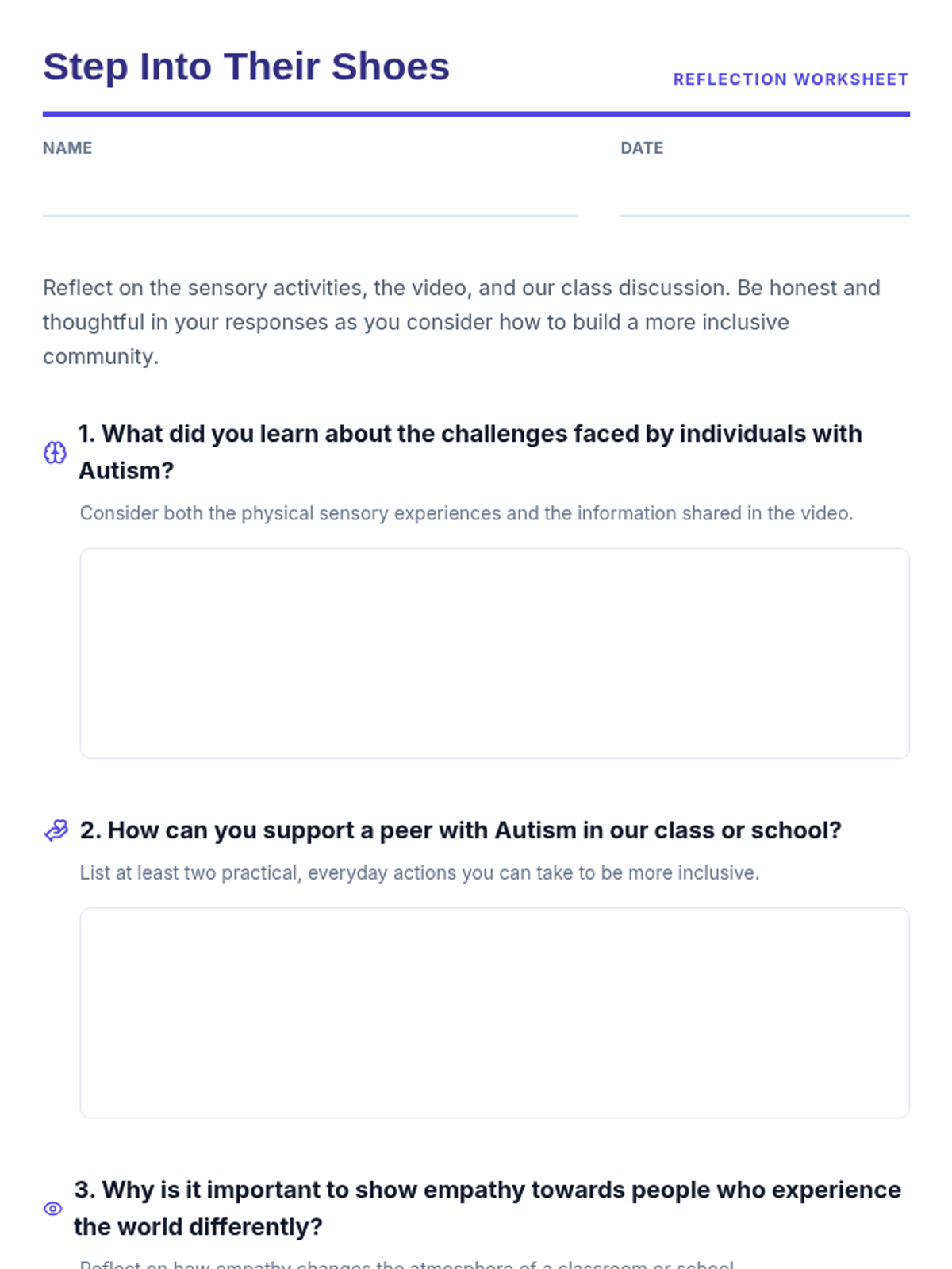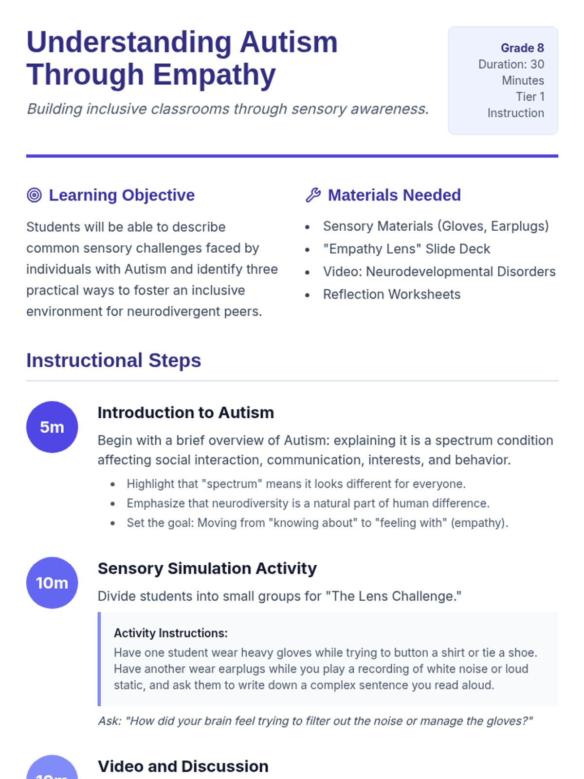 A 30-minute lesson for Grade 8 students designed to foster empathy and understanding for neurodiversity through sensory simulation activities and guided reflection. Students explore the spectrum of Autism and learn practical ways to support an inclusive environment.