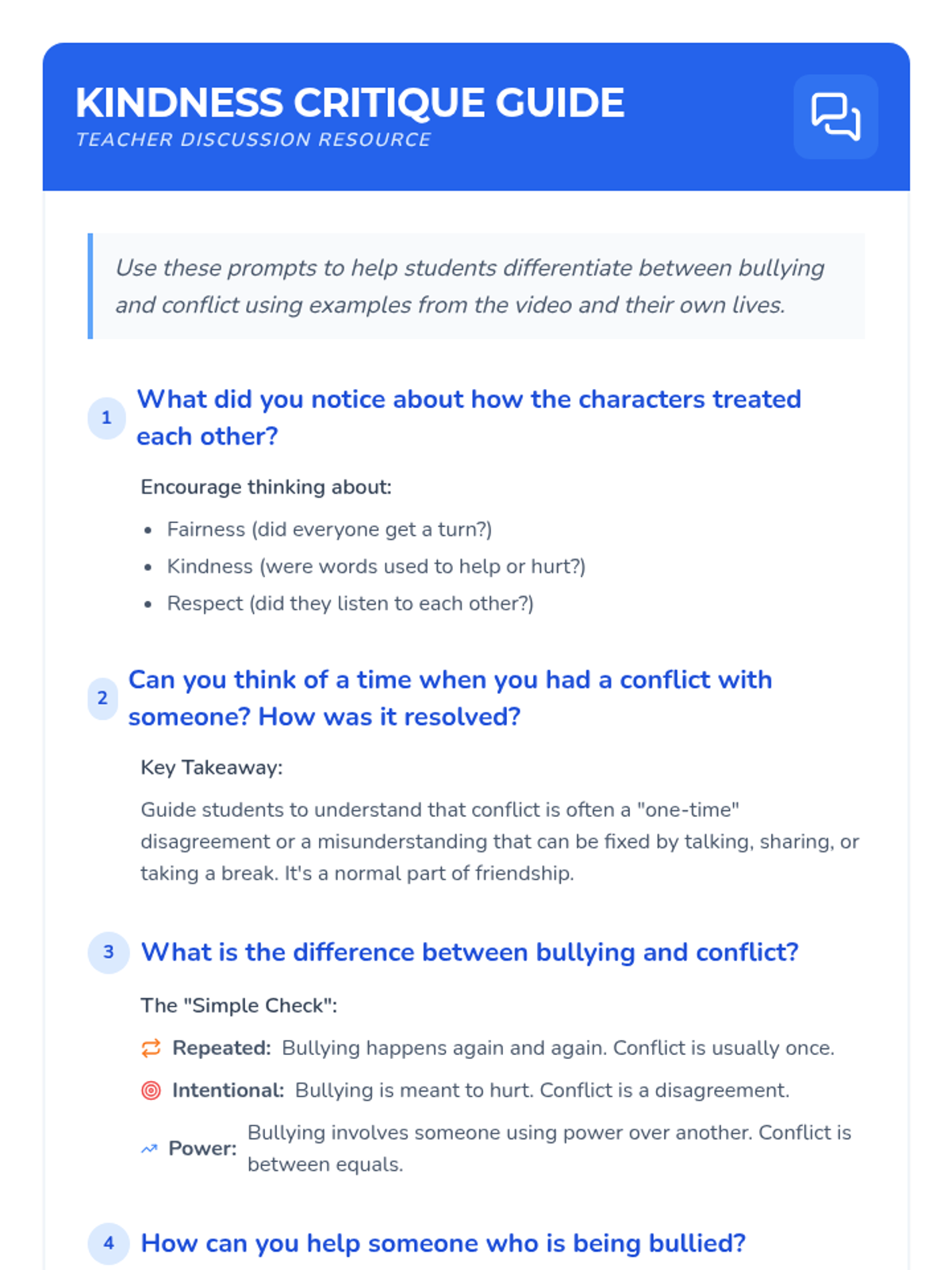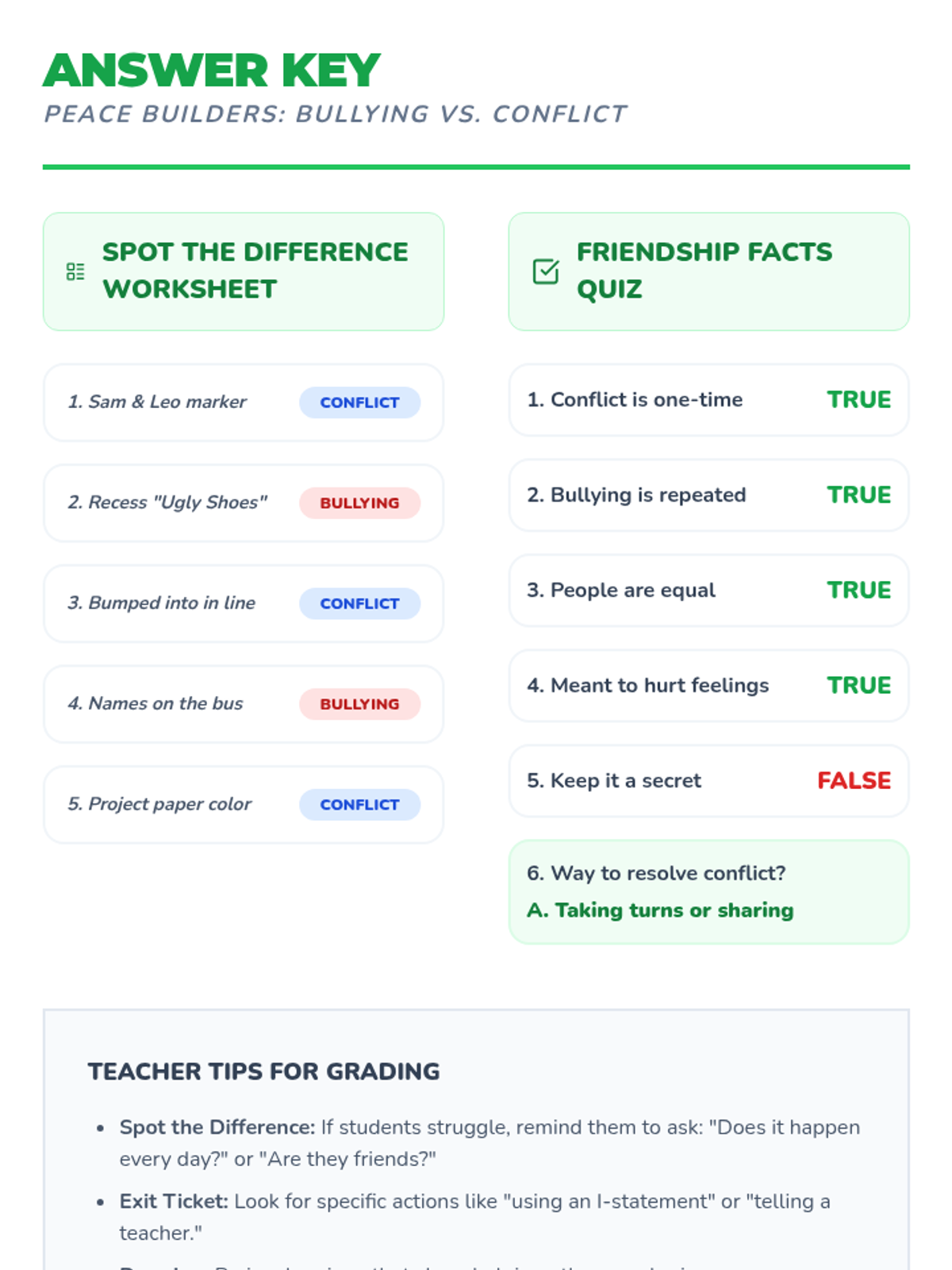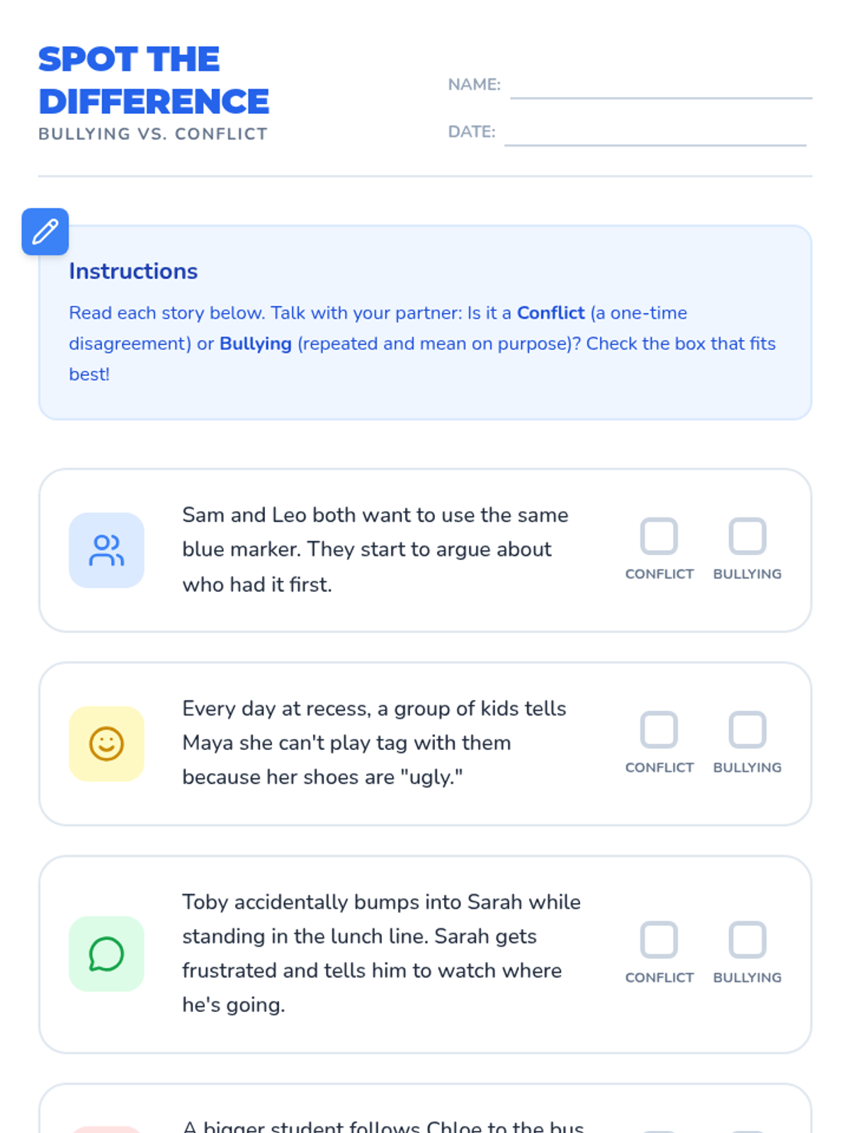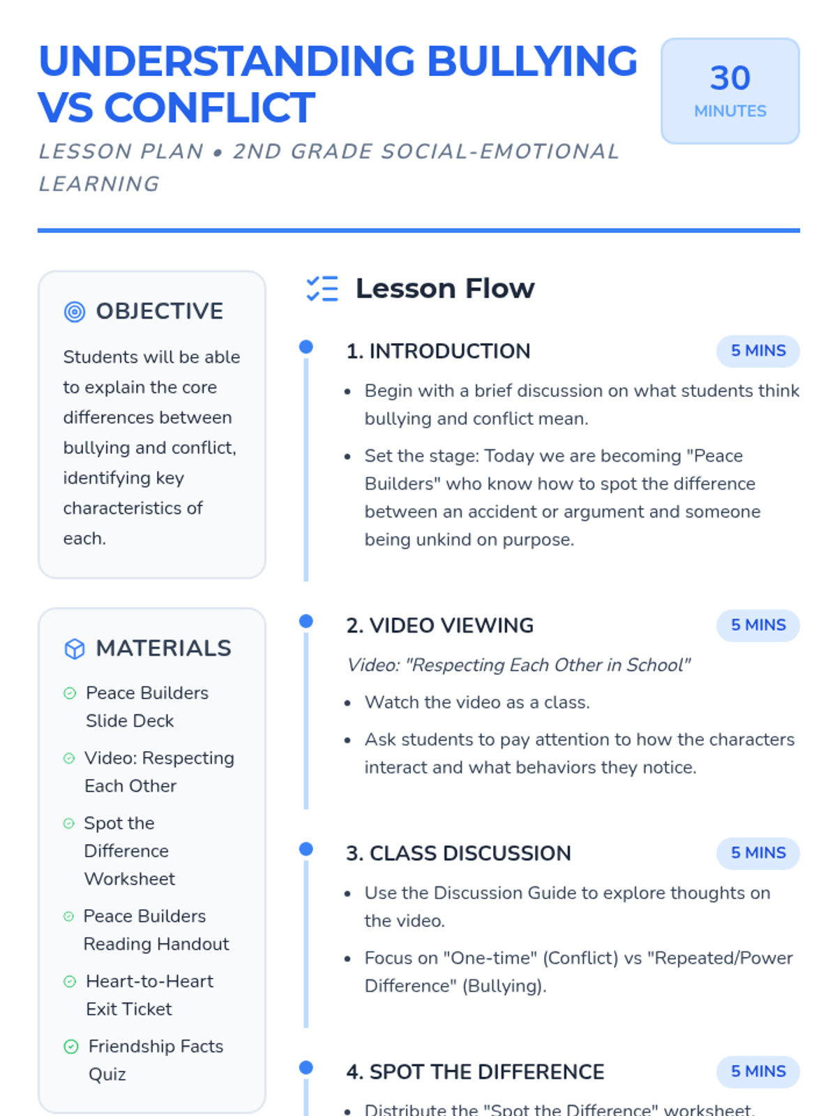 This lesson helps 2nd graders understand the difference between bullying and conflict through engaging activities and discussions. Students learn to identify repeated, intentional harm versus one-time disagreements to foster a respectful classroom.