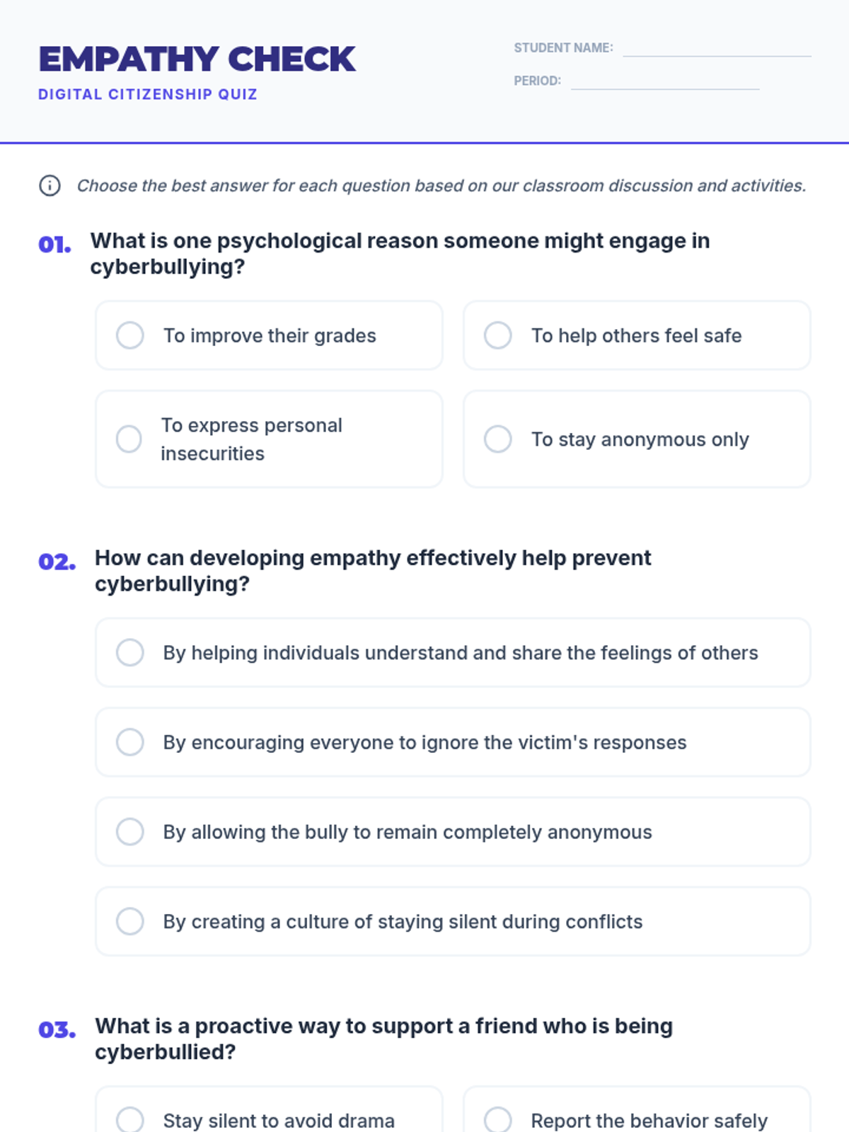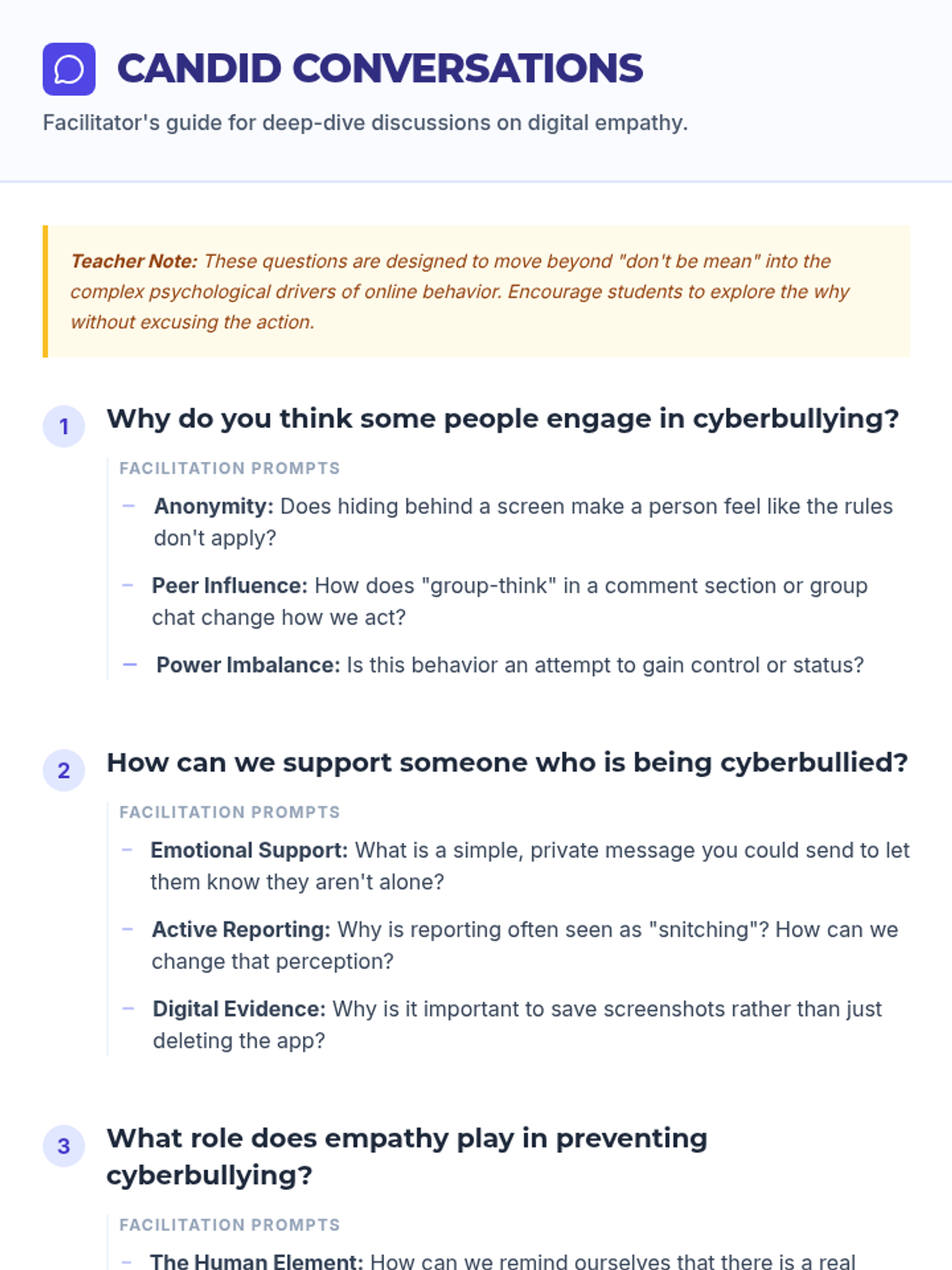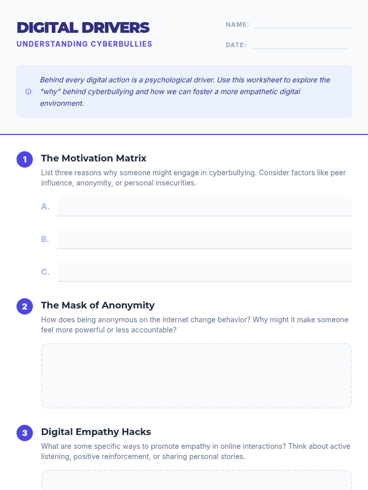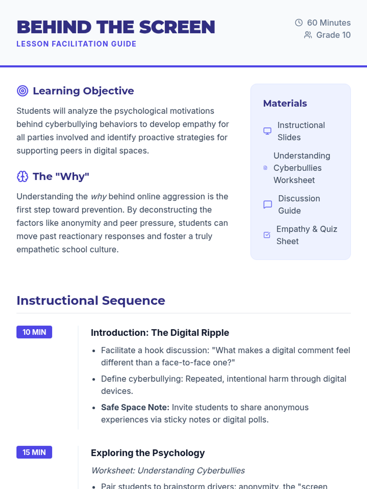 A 10th-grade lesson exploring the psychological drivers behind cyberbullying, designed to foster empathy and proactive peer support through role-play and reflection.
