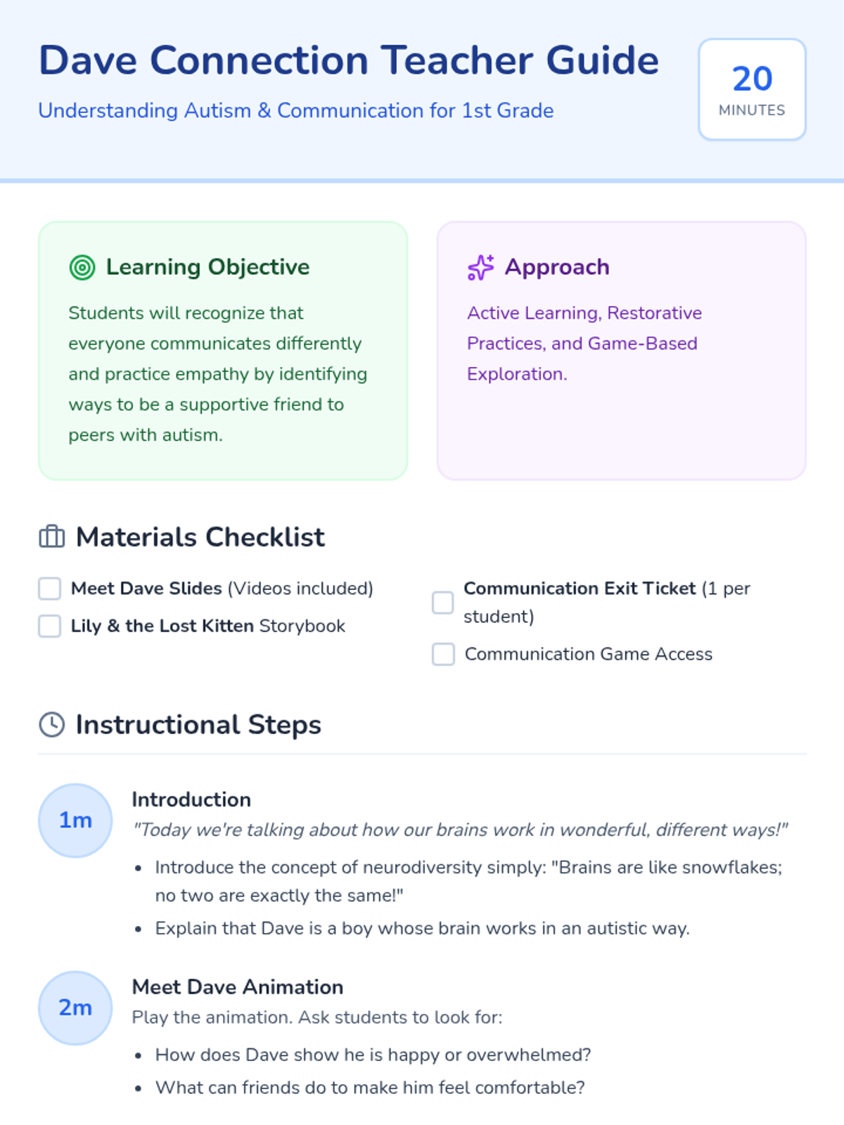 This lesson introduces first graders to autism and neurodiversity through the story of Dave. Students learn about different ways of communicating, practice empathy through a story about a lost kitten, and reflect on how to be supportive friends.