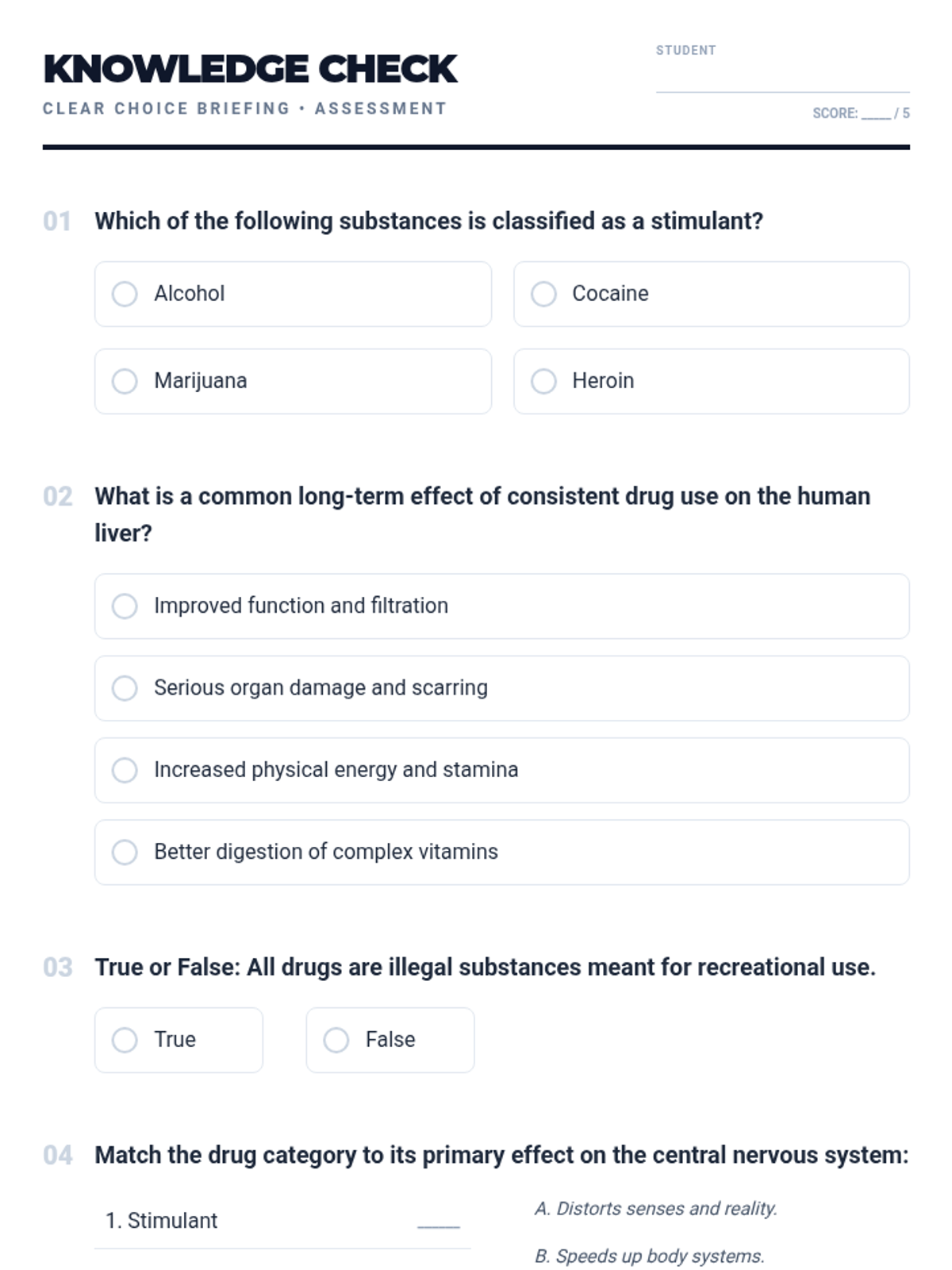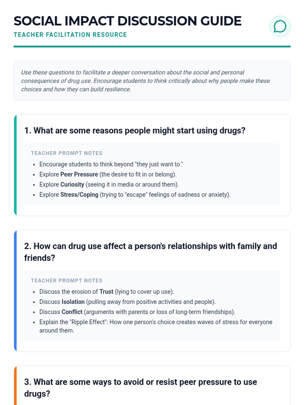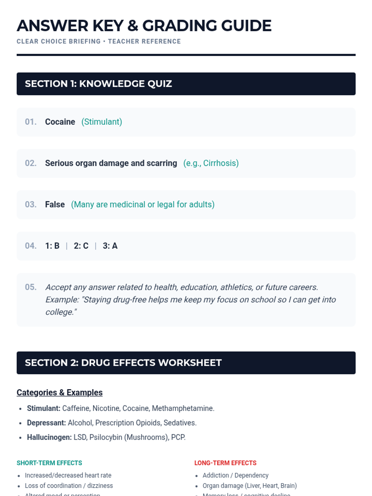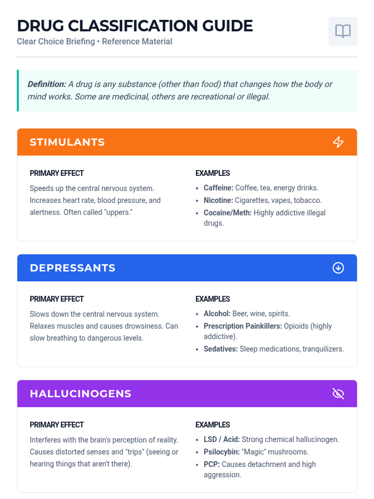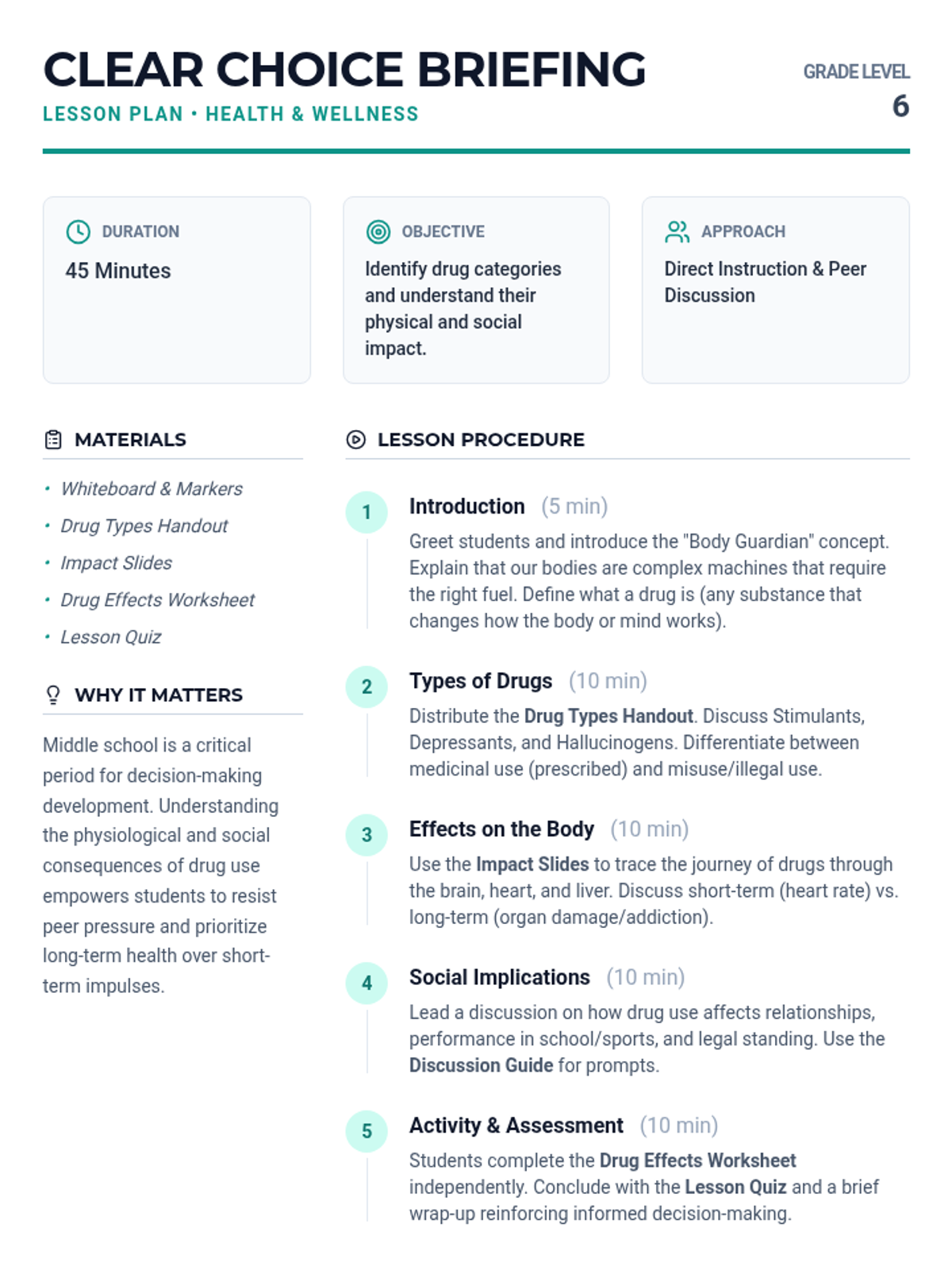 A comprehensive 6th-grade lesson exploring the categories of drugs, their physiological effects on the body, and the social consequences of drug use to help students make informed, healthy decisions.
