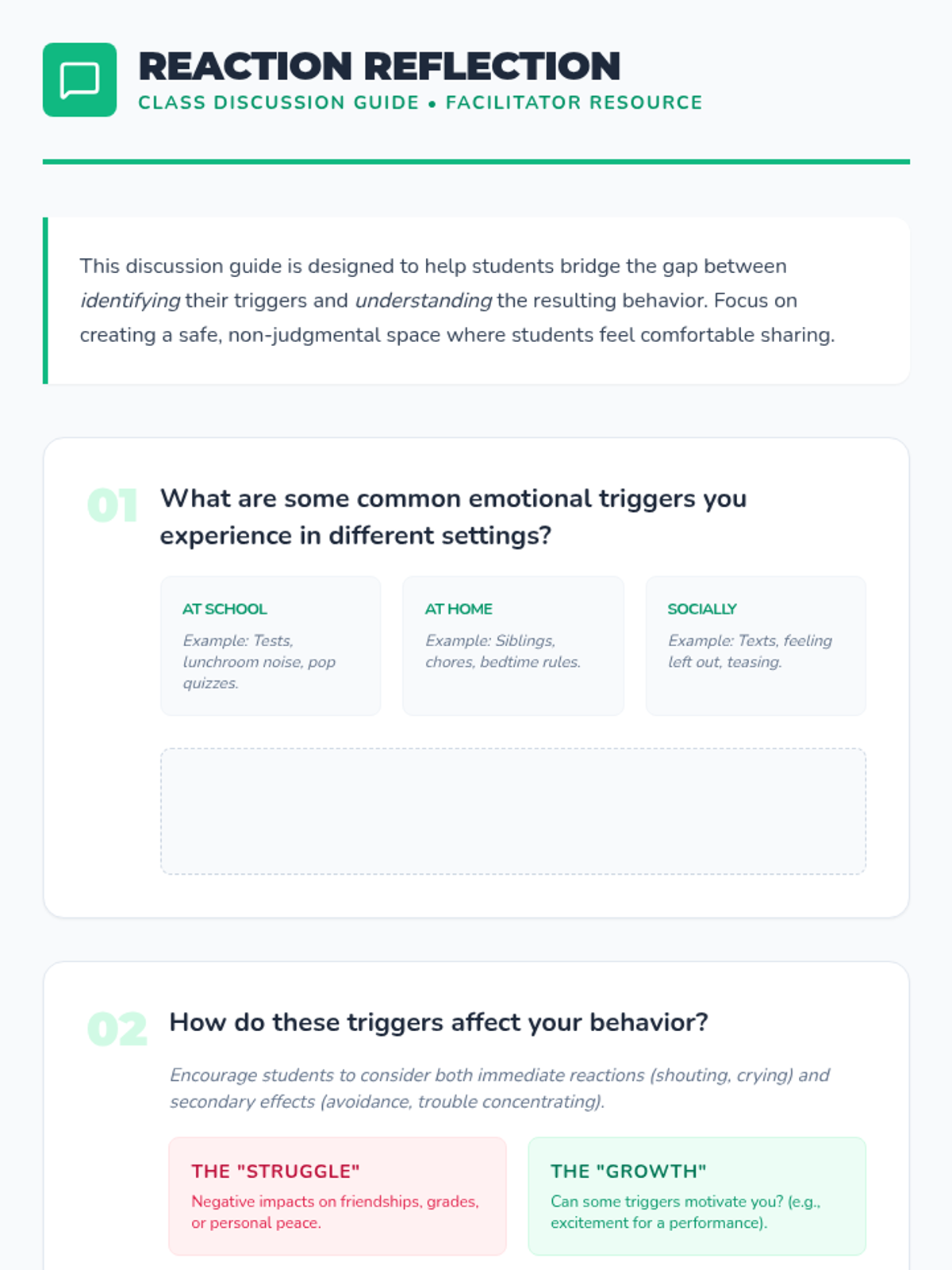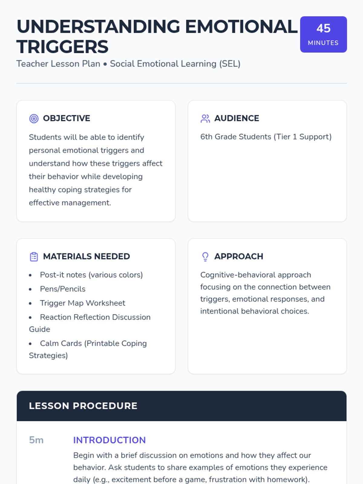 A 45-minute social-emotional learning lesson for 6th graders focused on identifying personal emotional triggers and developing healthy coping strategies to manage reactions effectively.