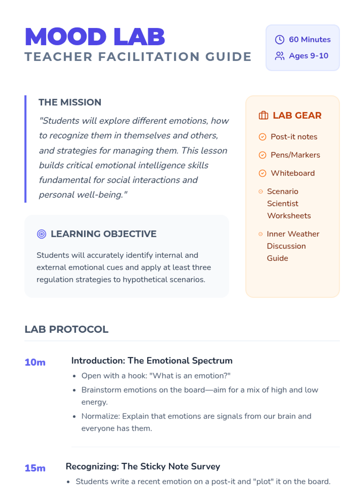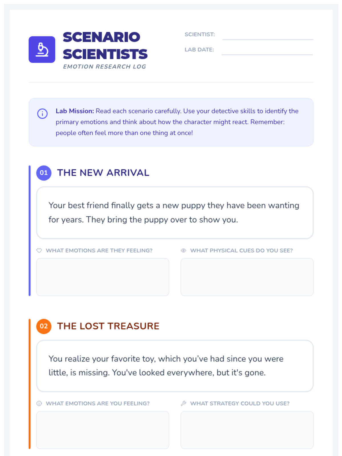 Students will explore different emotions, how to recognize them in themselves and others, and strategies for managing them through interactive discussion and scenario analysis.