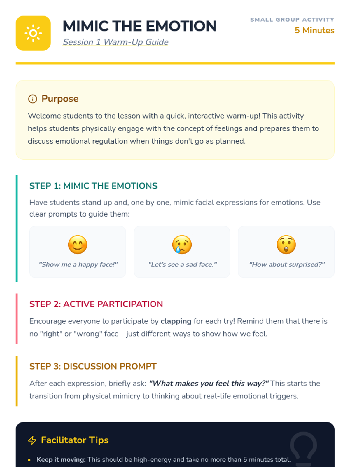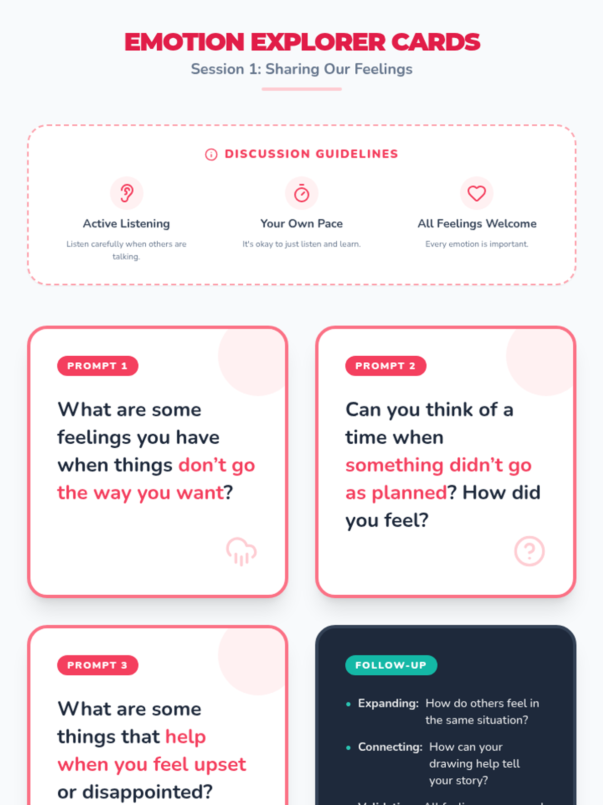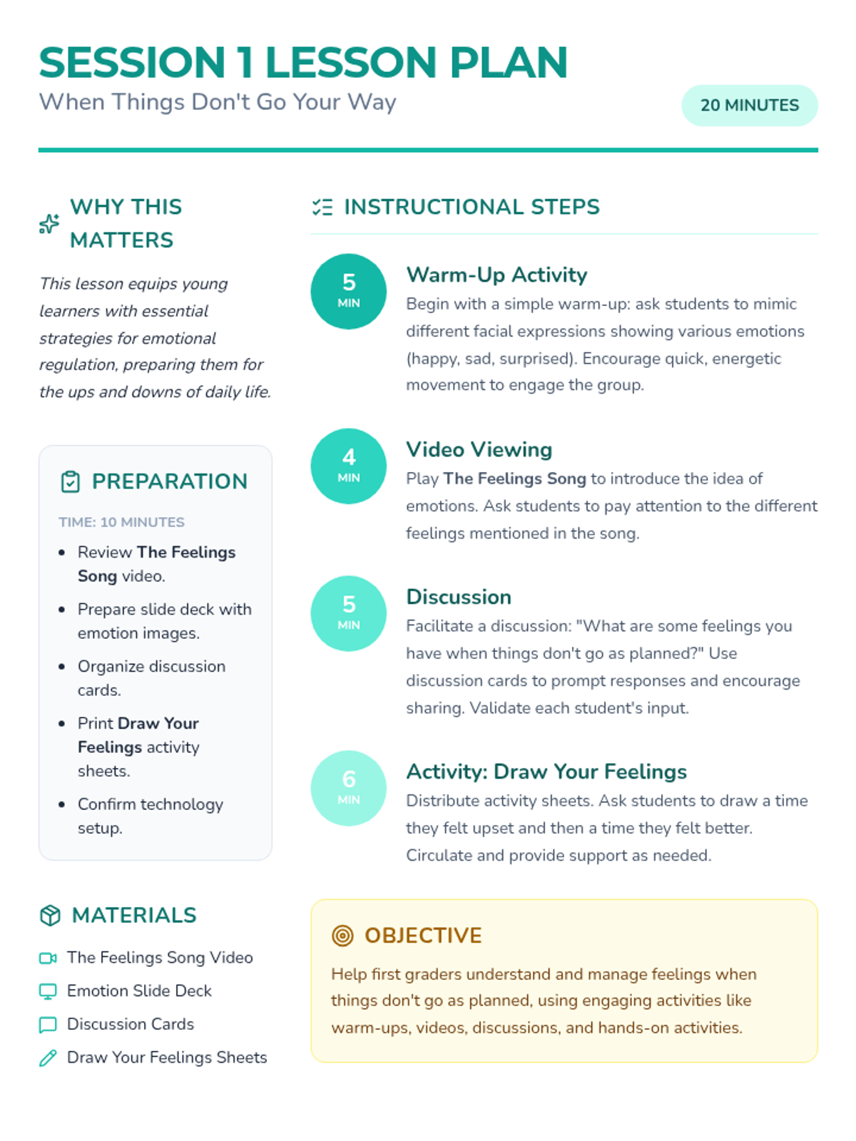 Students introduce the concept of emotions, watch 'The Feelings Song', and practice expressing how they feel when things don't go as planned.