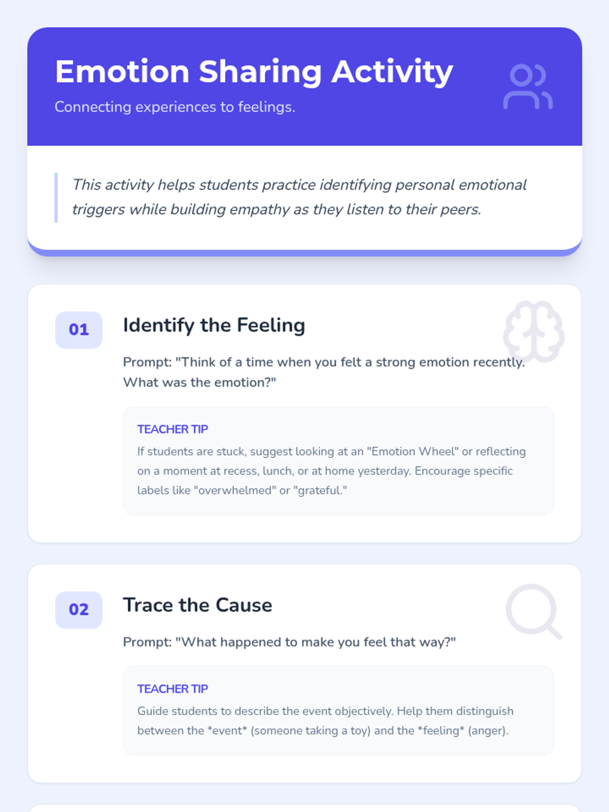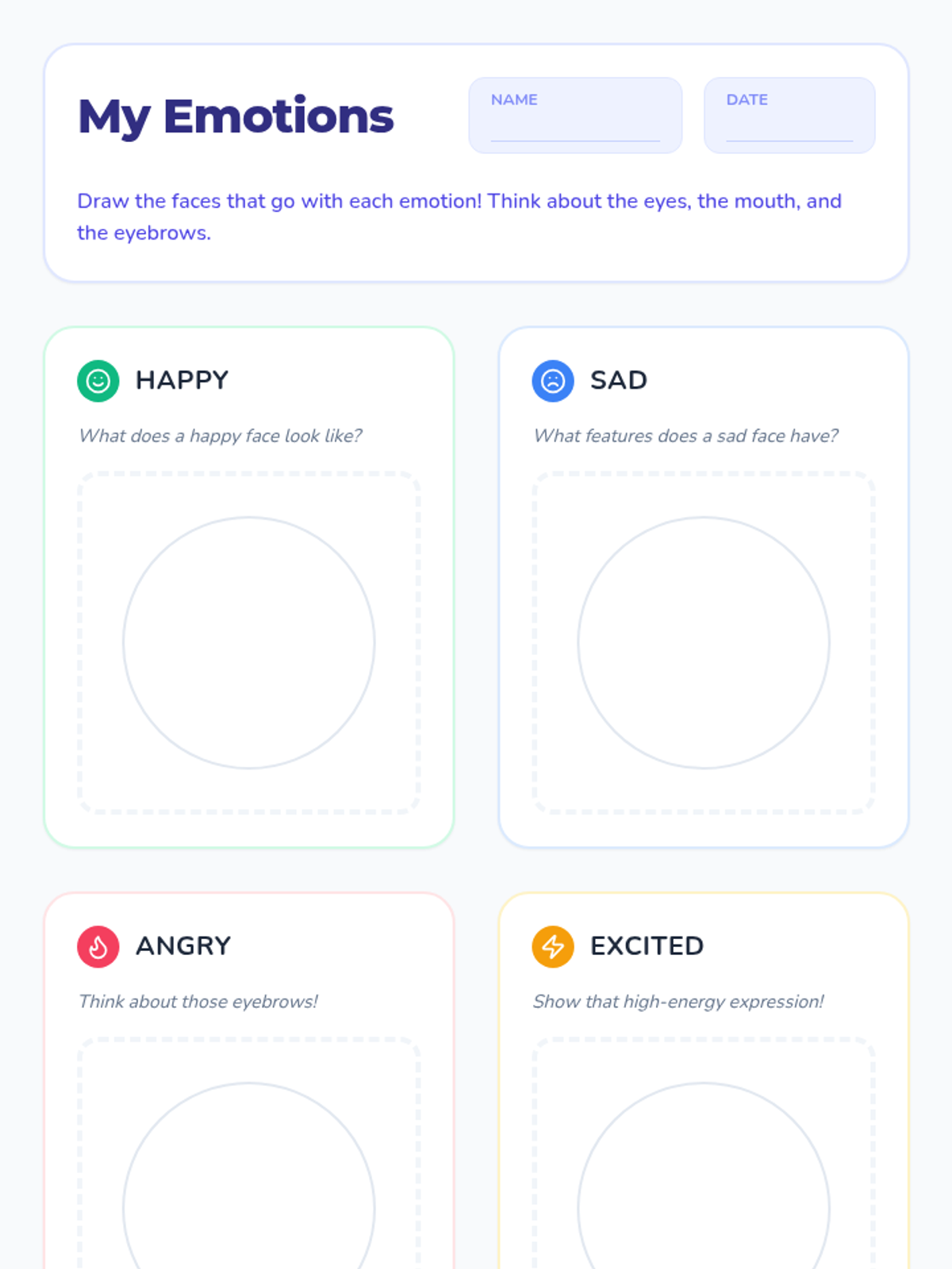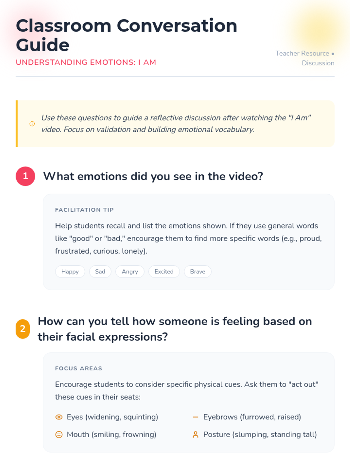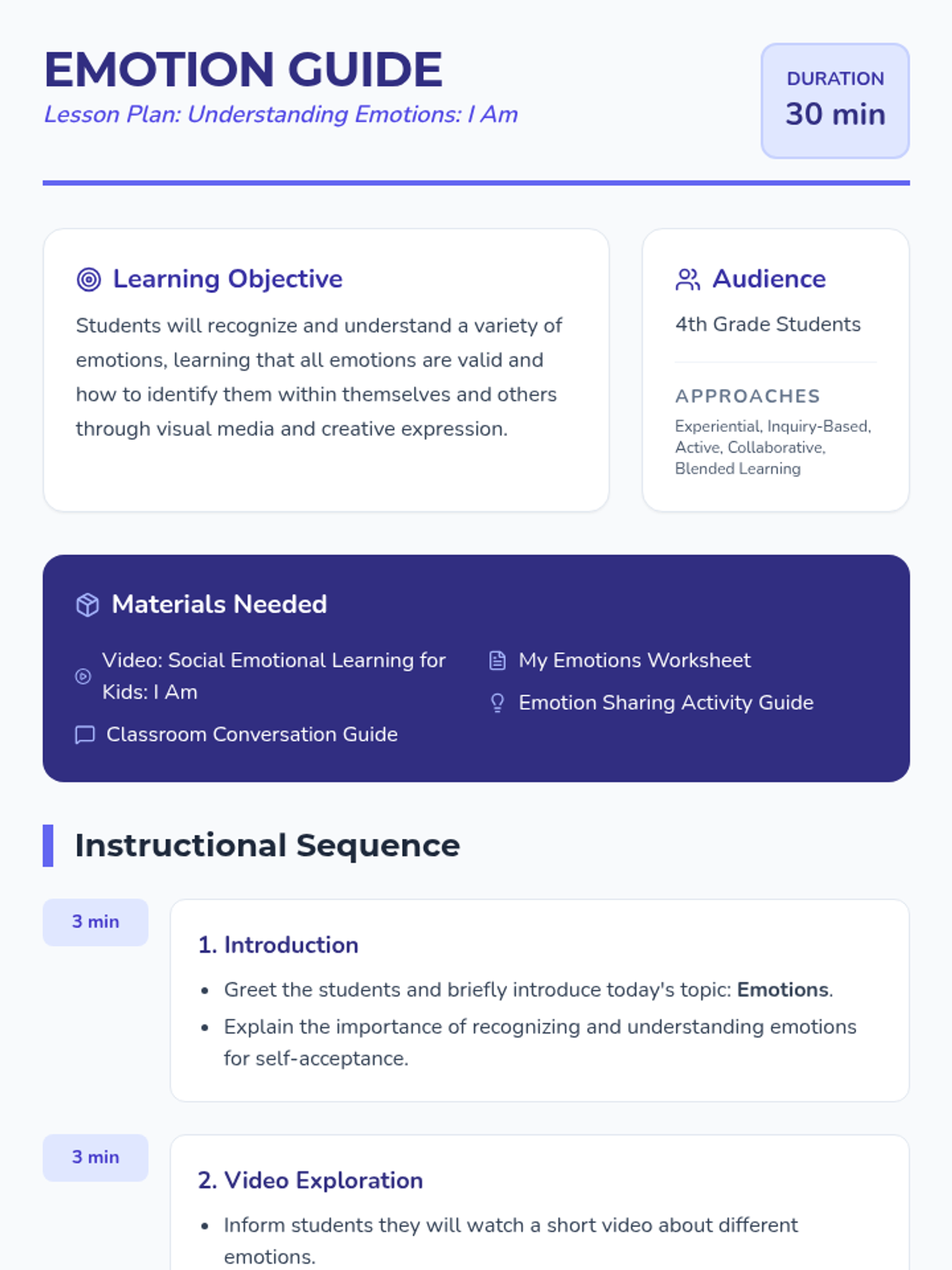 A foundational SEL lesson for 4th graders to recognize, validate, and express their emotions using the 'I Am' video and creative activities. Students will explore the connection between events, feelings, and facial expressions.