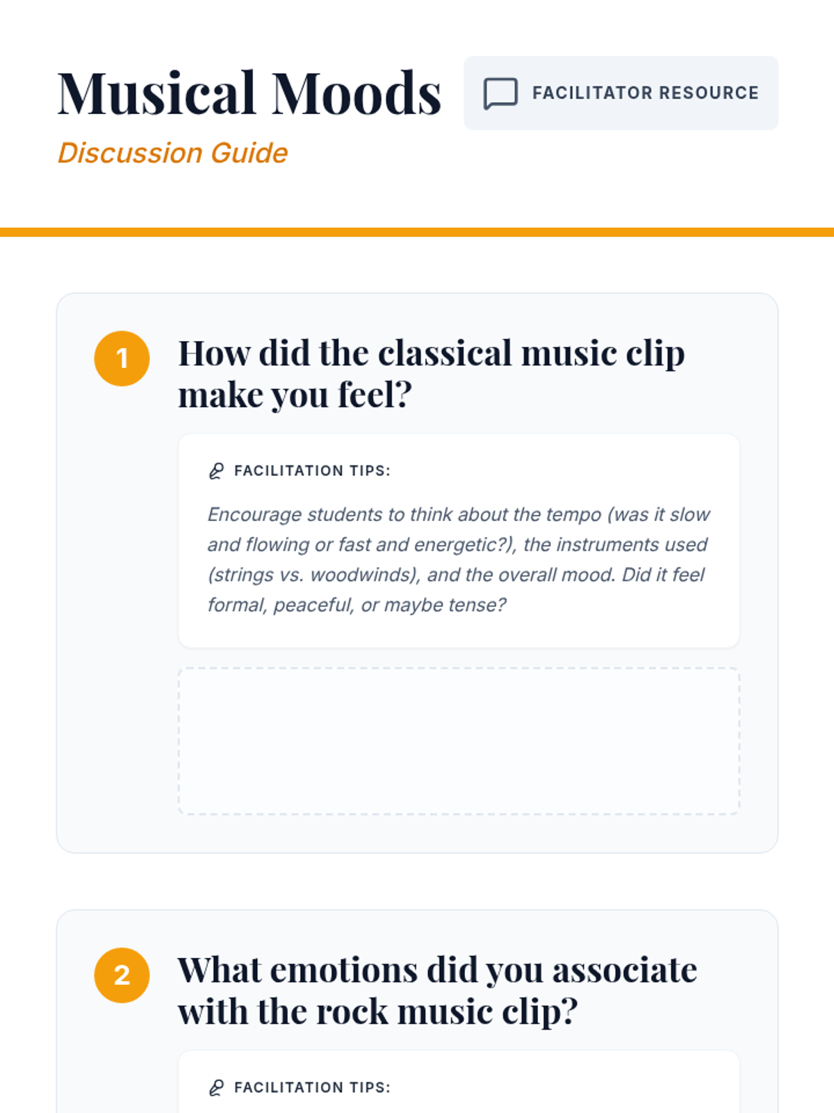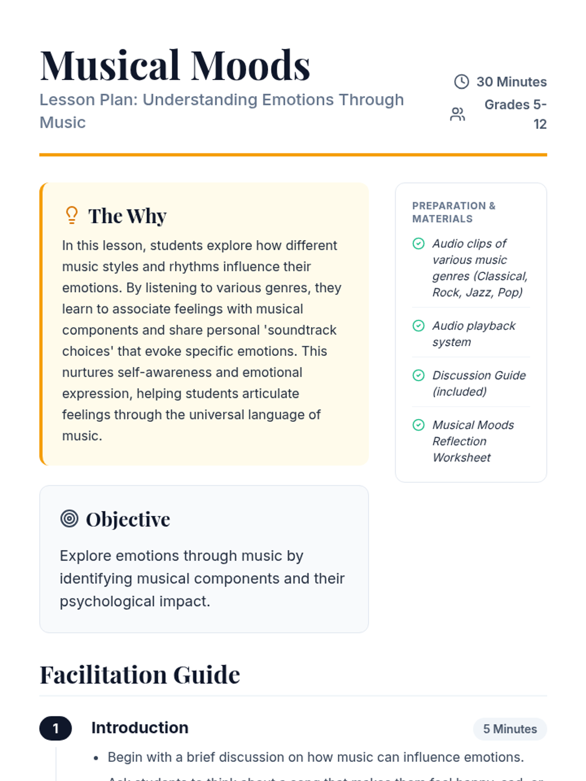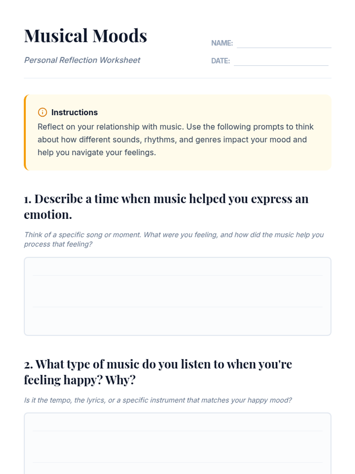 Students explore the connection between musical components (tempo, rhythm, genre) and their emotional responses, learning to use music as a tool for self-awareness and expression.