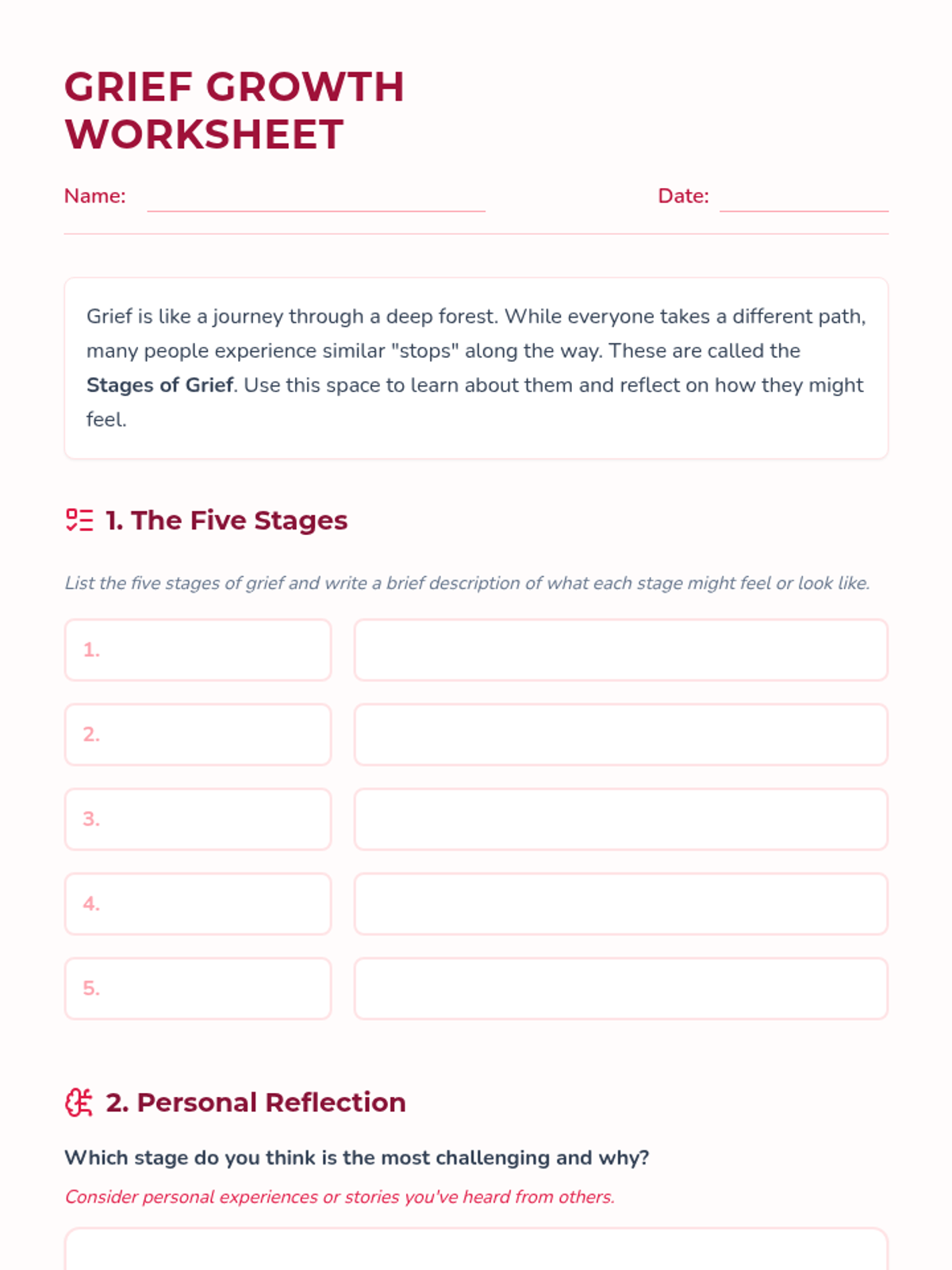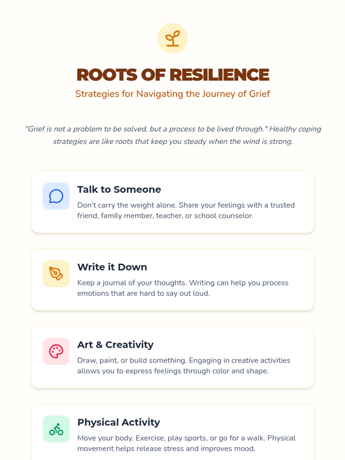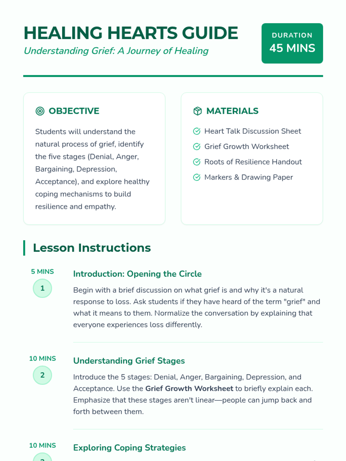 This lesson introduces 6th-grade students to the concept of grief, helping them understand the stages and how to cope with the loss of a loved one. Through discussions and activities, students will learn to express their emotions and identify supportive resources.