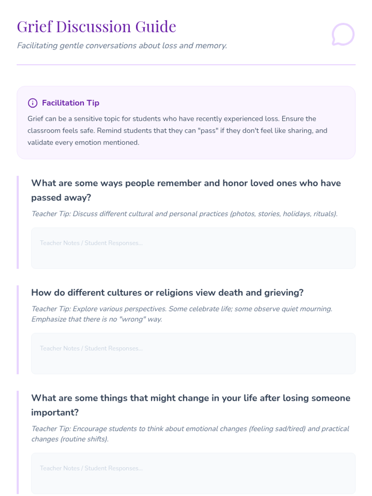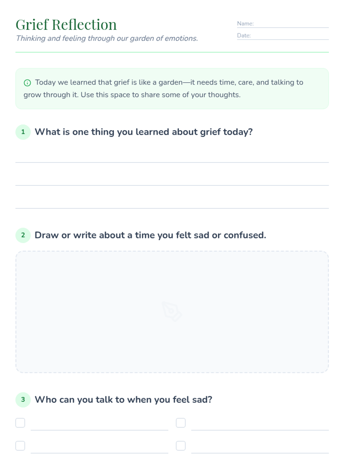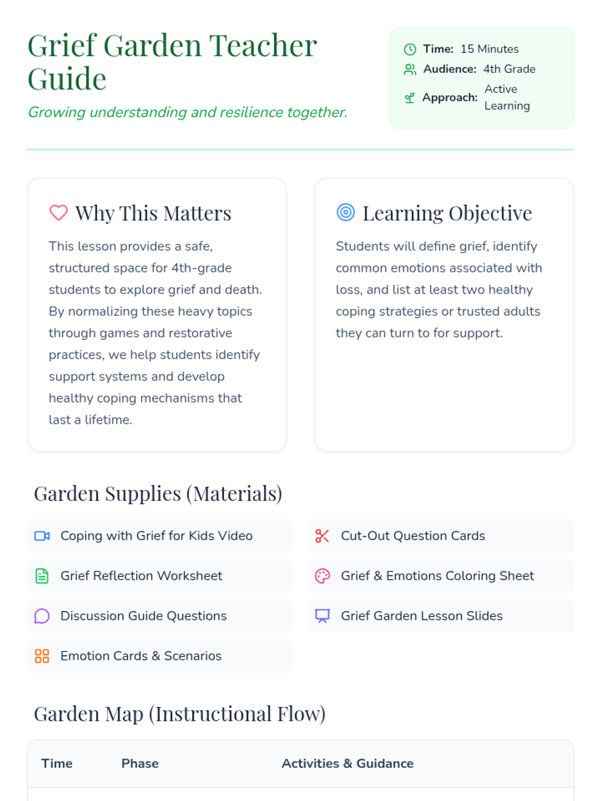 A gentle, interactive lesson for 4th graders to explore grief and healthy coping strategies through games, discussion, and reflection. students learn that grief is a natural process and identify support systems.