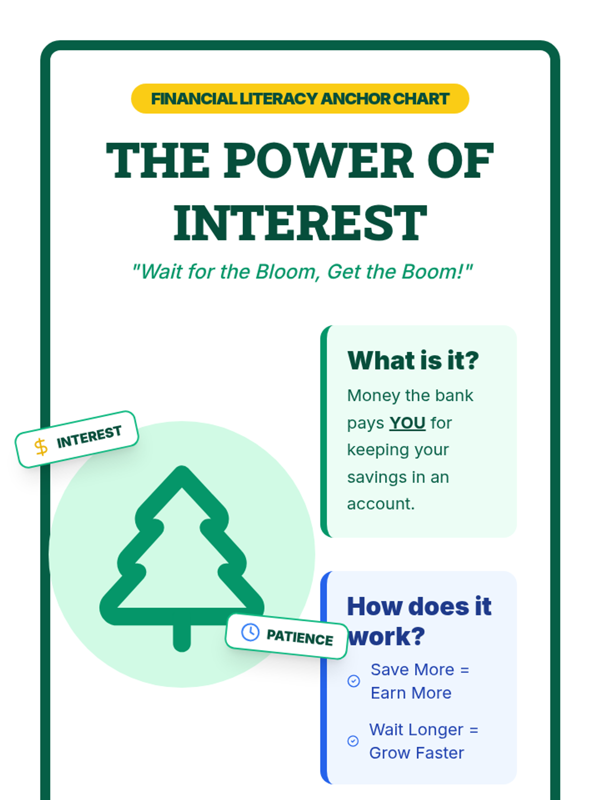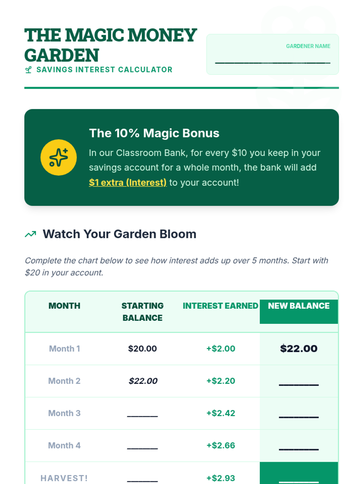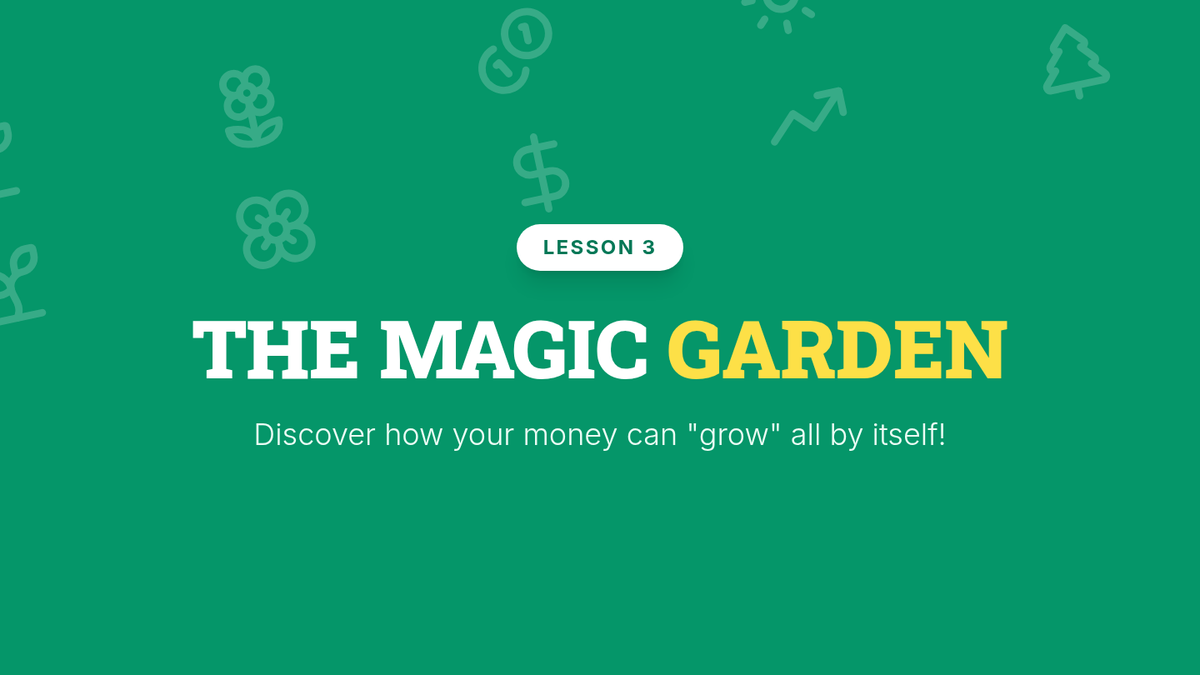 This lesson introduces the concept of interest as an incentive for saving money, using a 'growing garden' analogy to visualize how money can grow over time.