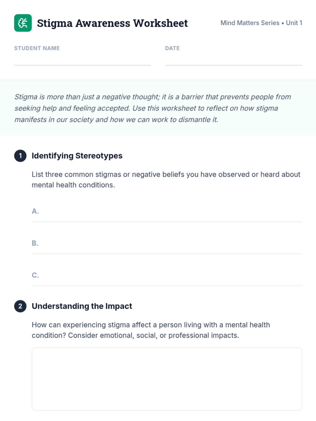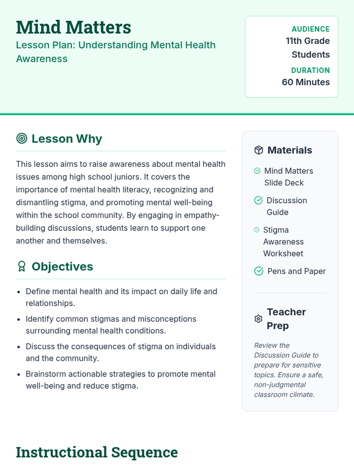 An introductory lesson for 11th-grade students focused on raising awareness about mental health, identifying and combating stigma, and promoting community well-being through empathetic discussion and collaborative activities.